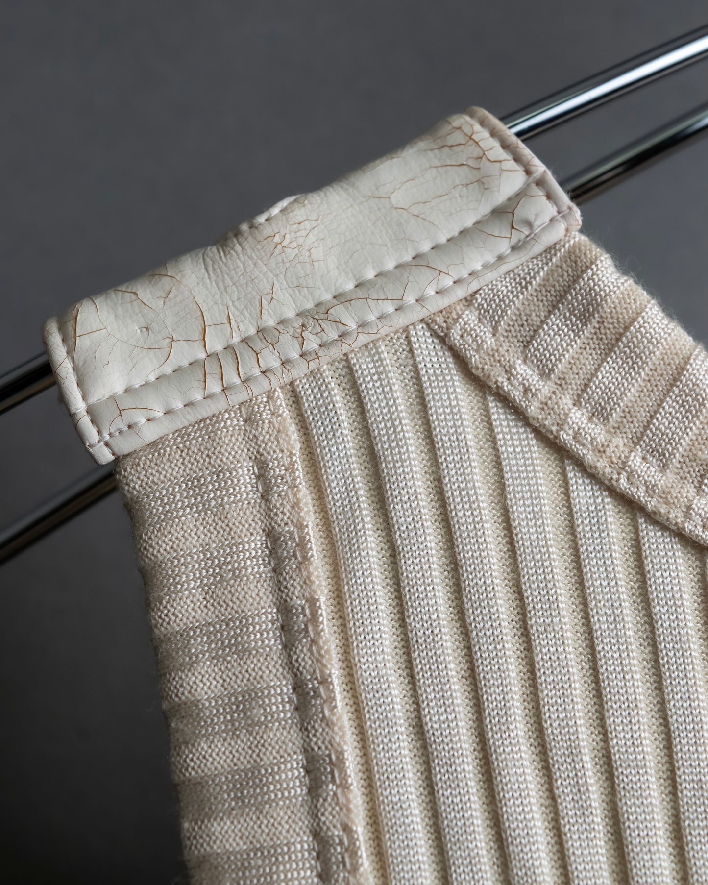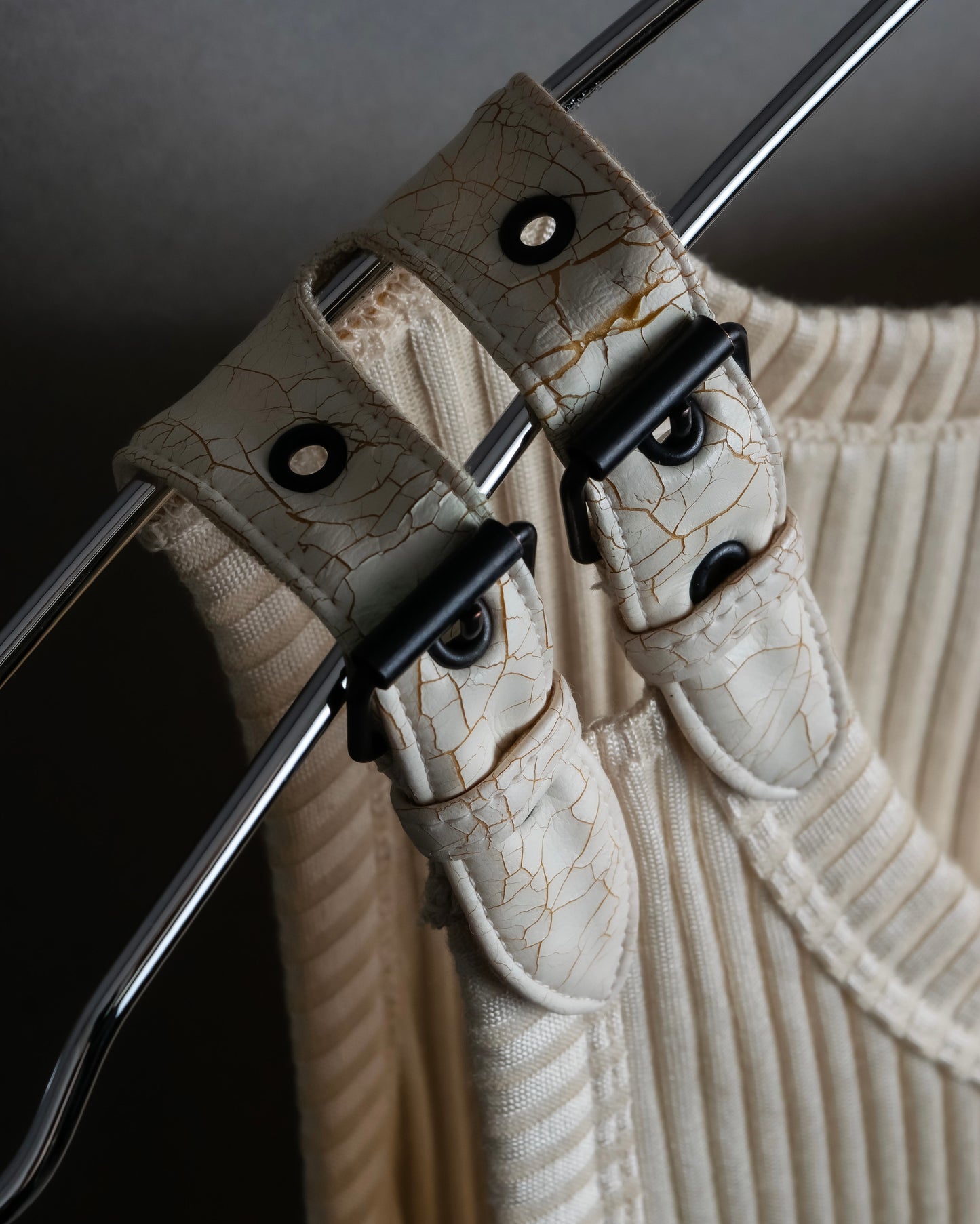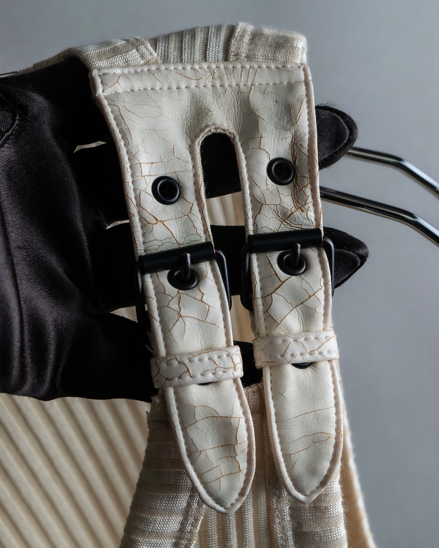 お色味はやや黄色がかったようなホワイトのカラーリングで、肌に馴染みやすく、ヴィンテージライクでダークなゴルチエの雰囲気を醸し出します。ベルトはひび割れたようなダメージ感のある、より黄色味のないホワイトで、最近のトレンドでもあるy2kスタイルとも親和性が高いです。