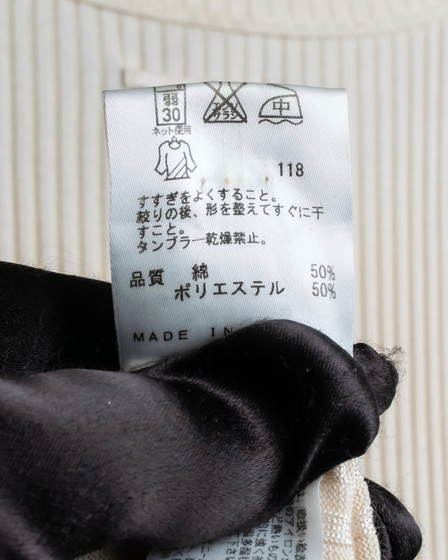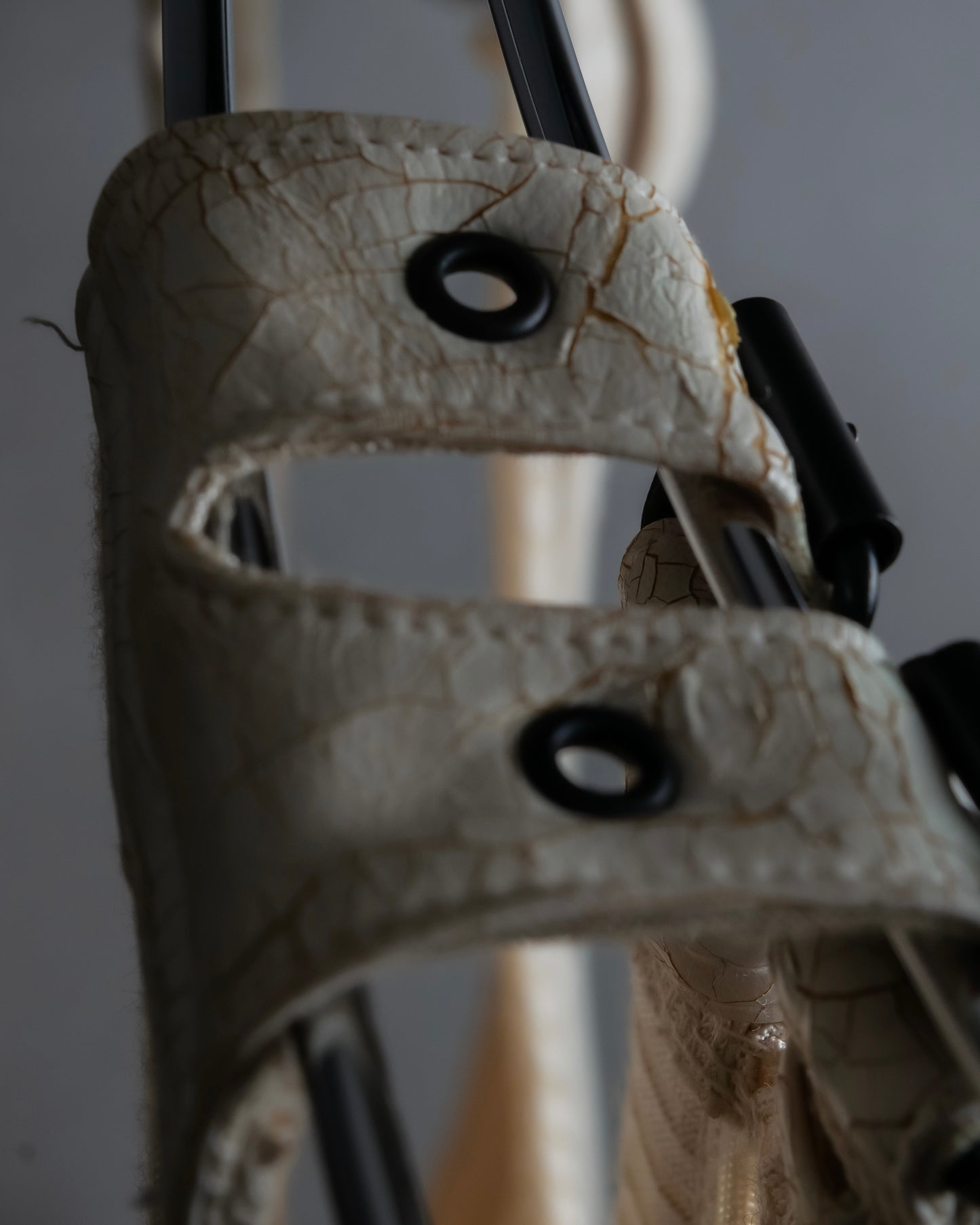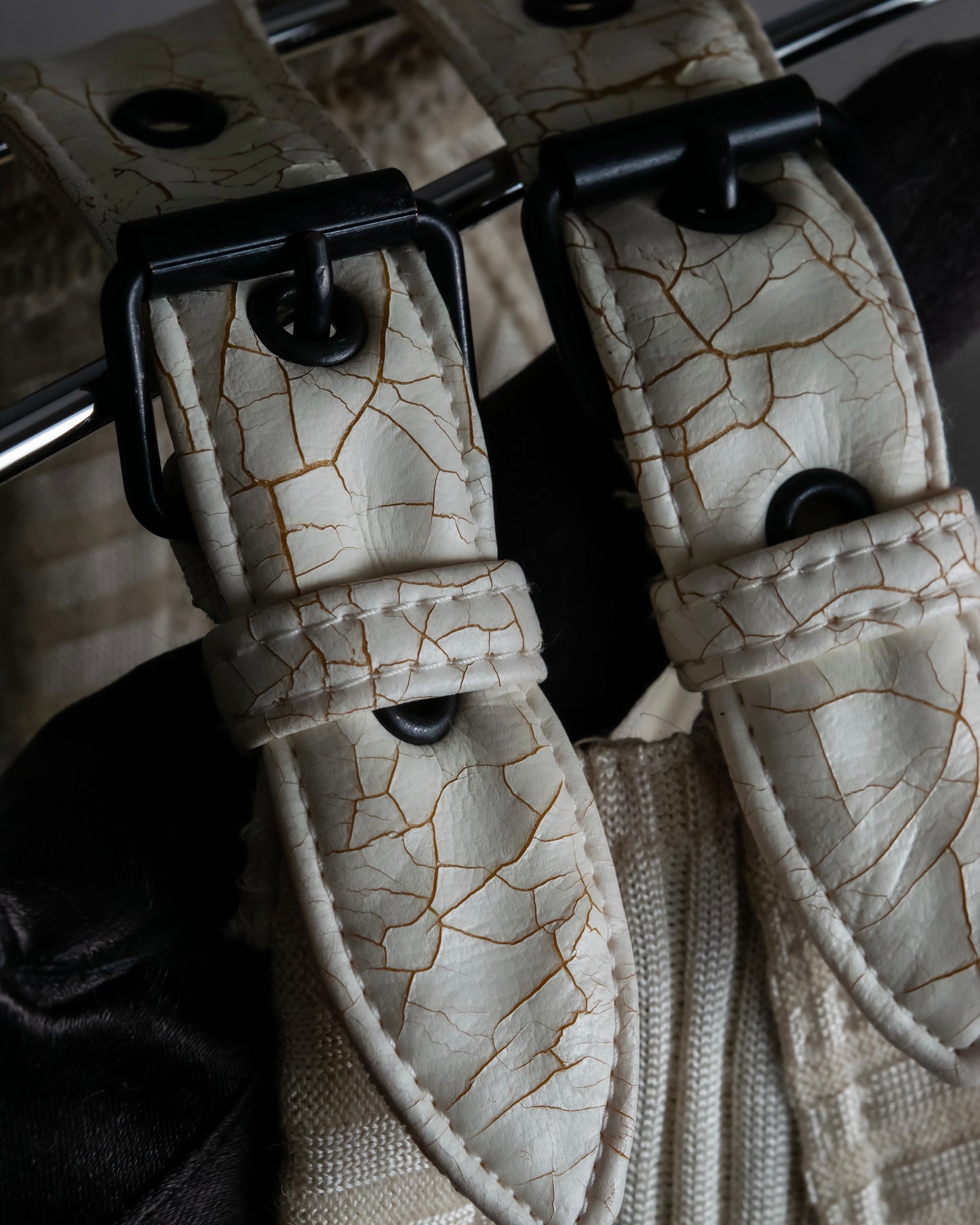 お色味はやや黄色がかったようなホワイトのカラーリングで、肌に馴染みやすく、ヴィンテージライクでダークなゴルチエの雰囲気を醸し出します。ベルトはひび割れたようなダメージ感のある、より黄色味のないホワイトで、最近のトレンドでもあるy2kスタイルとも親和性が高いです。