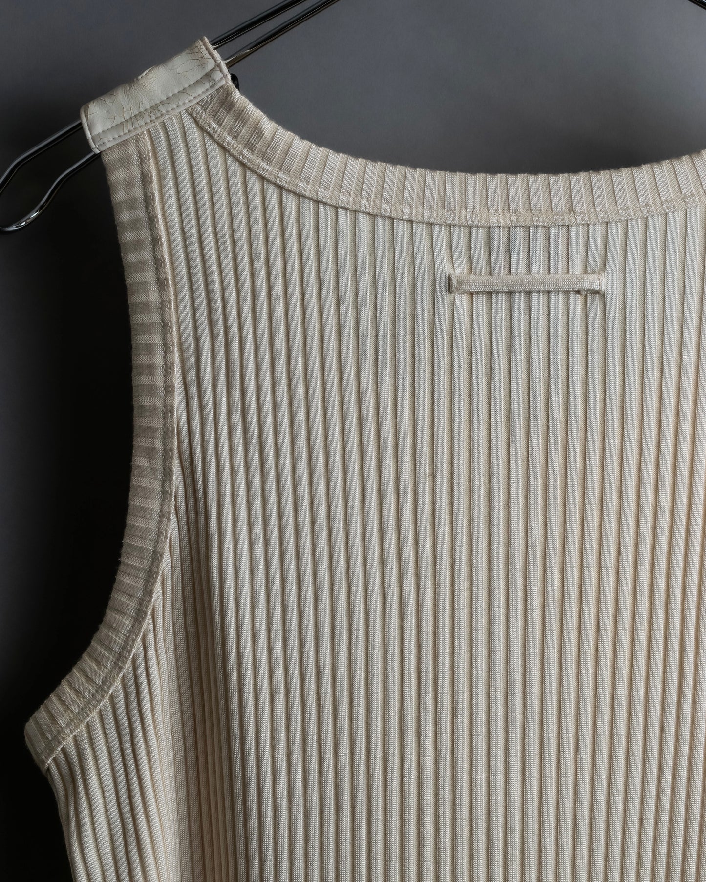 注目すべきは、2連のベルトで止まるようになった肩のデザイン。レザー素材を用いた3段階で長さを調整可能な細めのベルトを2本隙間を開けて配置した、ゴルチエらしいアヴァンギャルドで独特な雰囲気のデザインとなっており、一枚でご着用した際にも遊び心を感じれるタンクトップというユニークなアイテムとなっております。