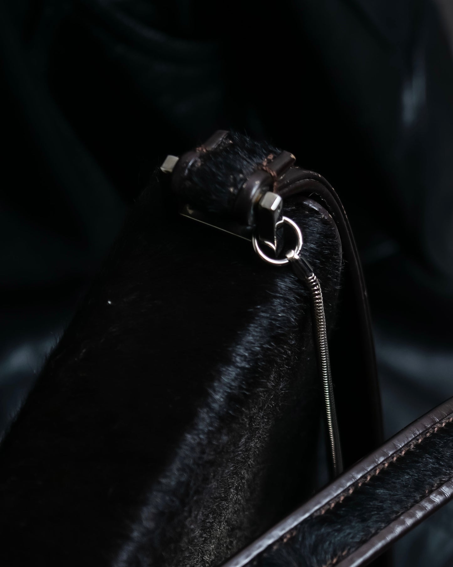 素材には、バッグの全面に対して現代では滅多に流通しない上質な光沢を放つブラウンのハラコをふんだんに用いており、それらに抜け感を付与するためシルバーの留め具を付与してアイコニックな仕上がりにしていますね。