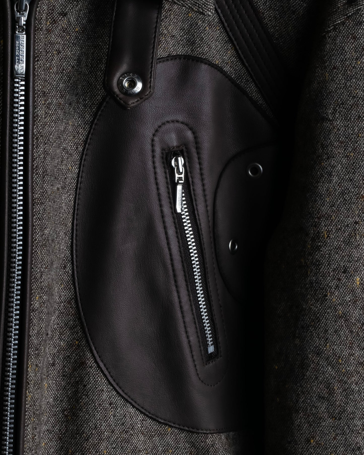 特徴的なディテールとして、胸元と腰部分にはブラウンのレザーで縁取られたポケットが施されており、異素材の組み合わせがバーバリーの中でも一際モダンな印象を併せ持つブラックレーベルらしい美しいエッジとして落とし込まれております。