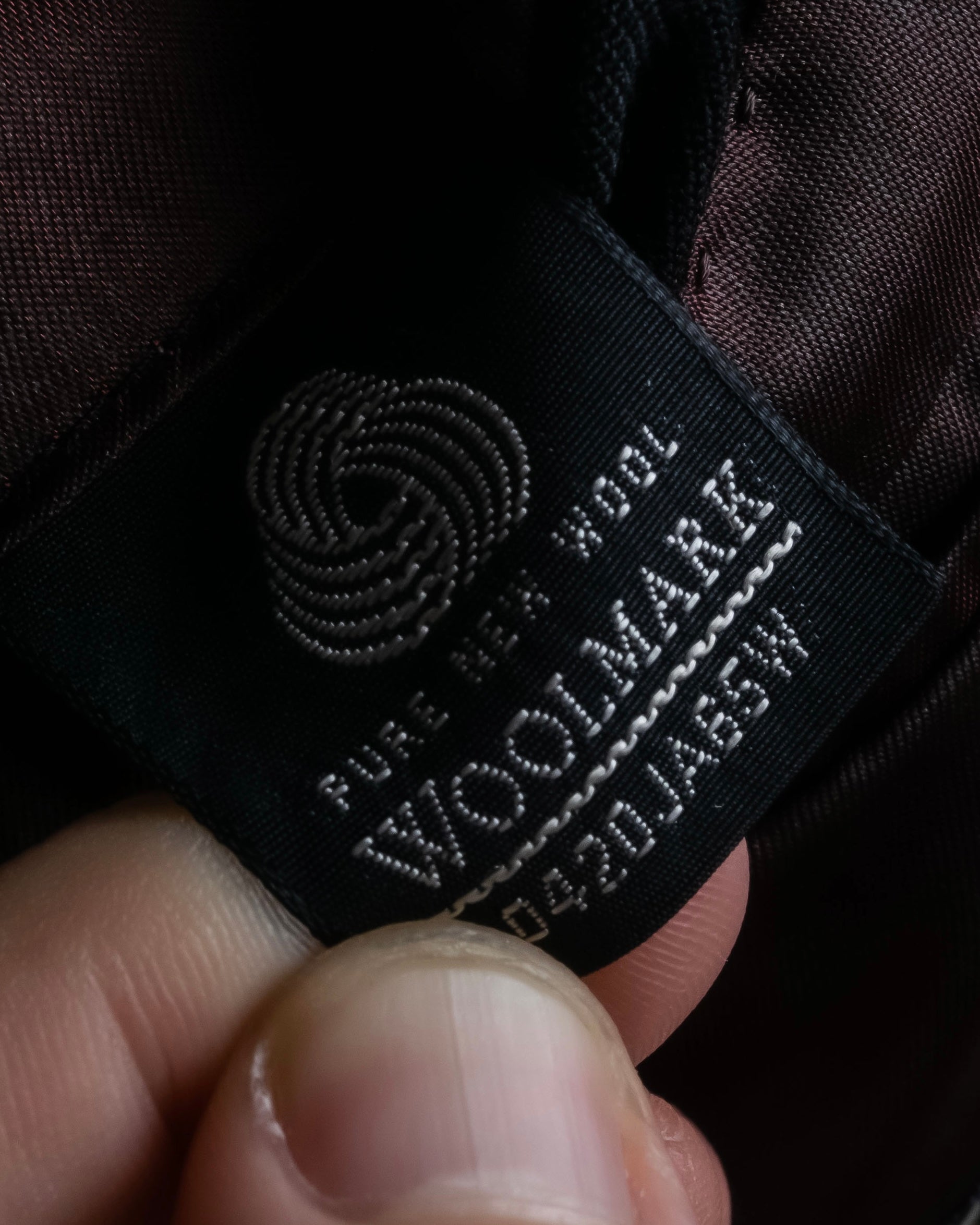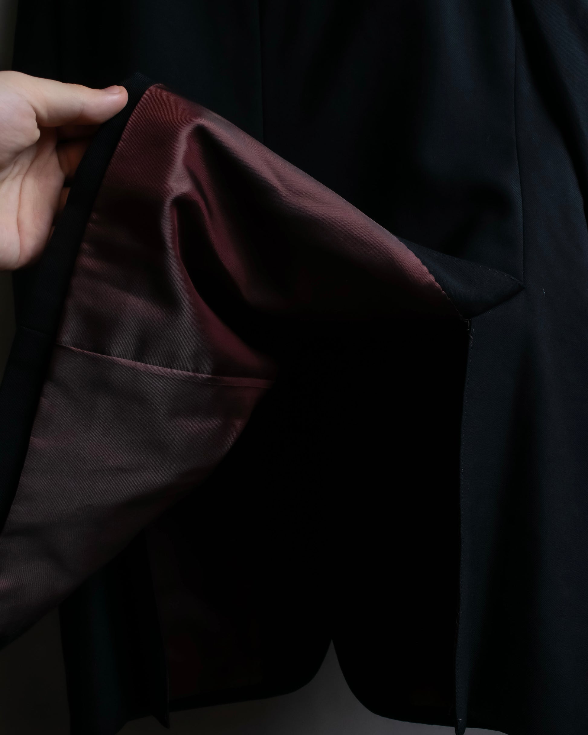 胸元の合わせ位置の高い、3つボタンシングルブレストの仕立てながら、襟のデザインはピークドラペルという、モードなデザインがメゾンブランドのコレクションピースを彷彿とさせるこちらの逸品。