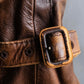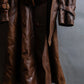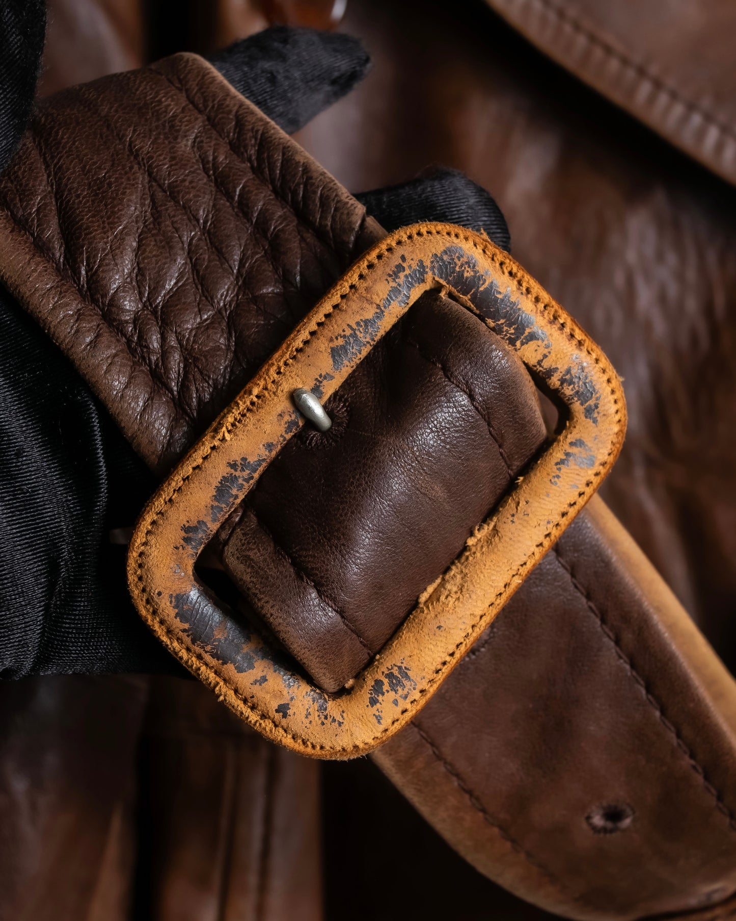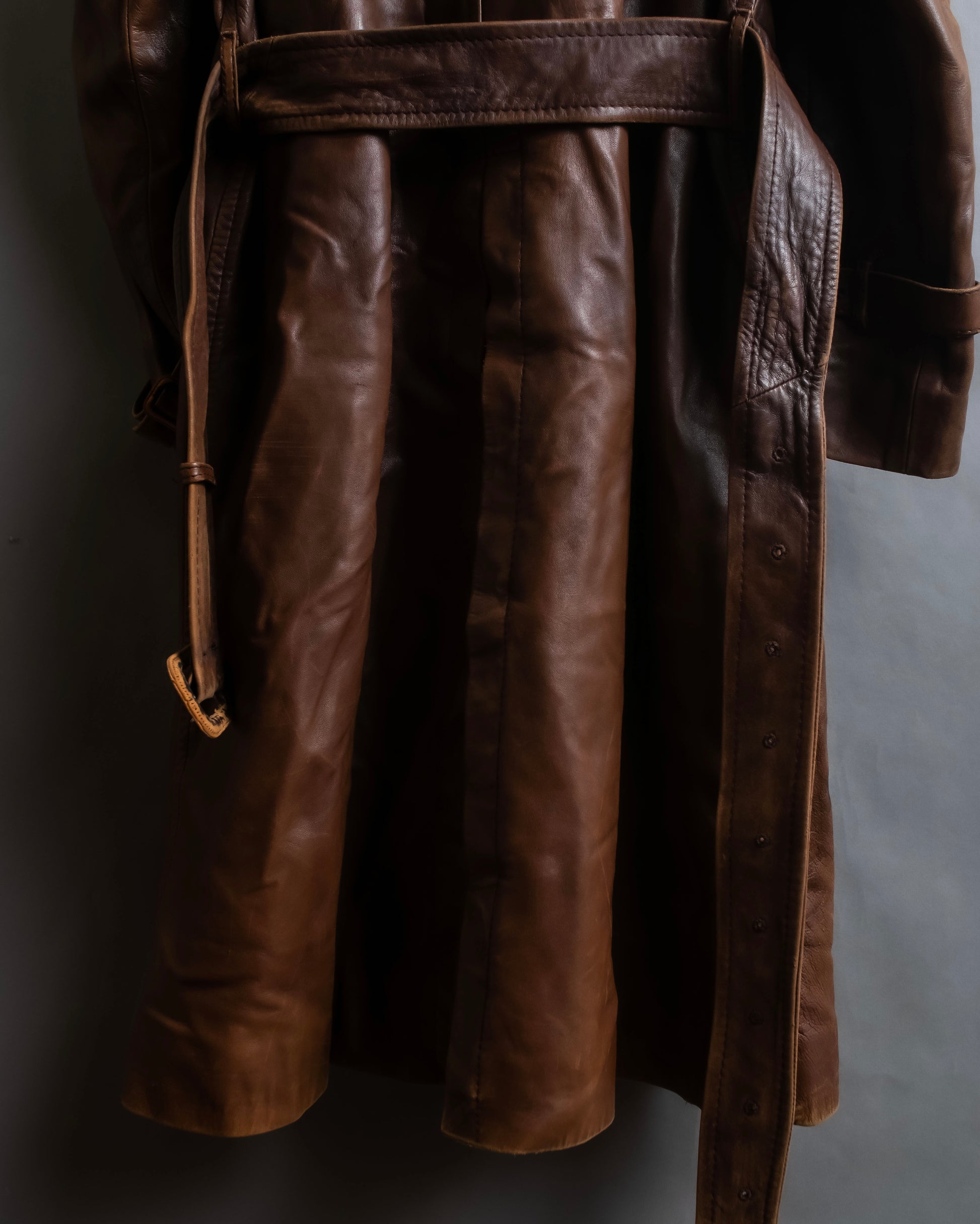 この様ななディテールは、トレンチコートがもともとミリタリーウェアであったことを彷彿とさせるエレメントであり、現代のファッションアイテムとしての洗練を兼ね備えています。また、ウエストを強調するためのレザーベルトが付属しており、体型に合わせて調整可能な点が機能的です。