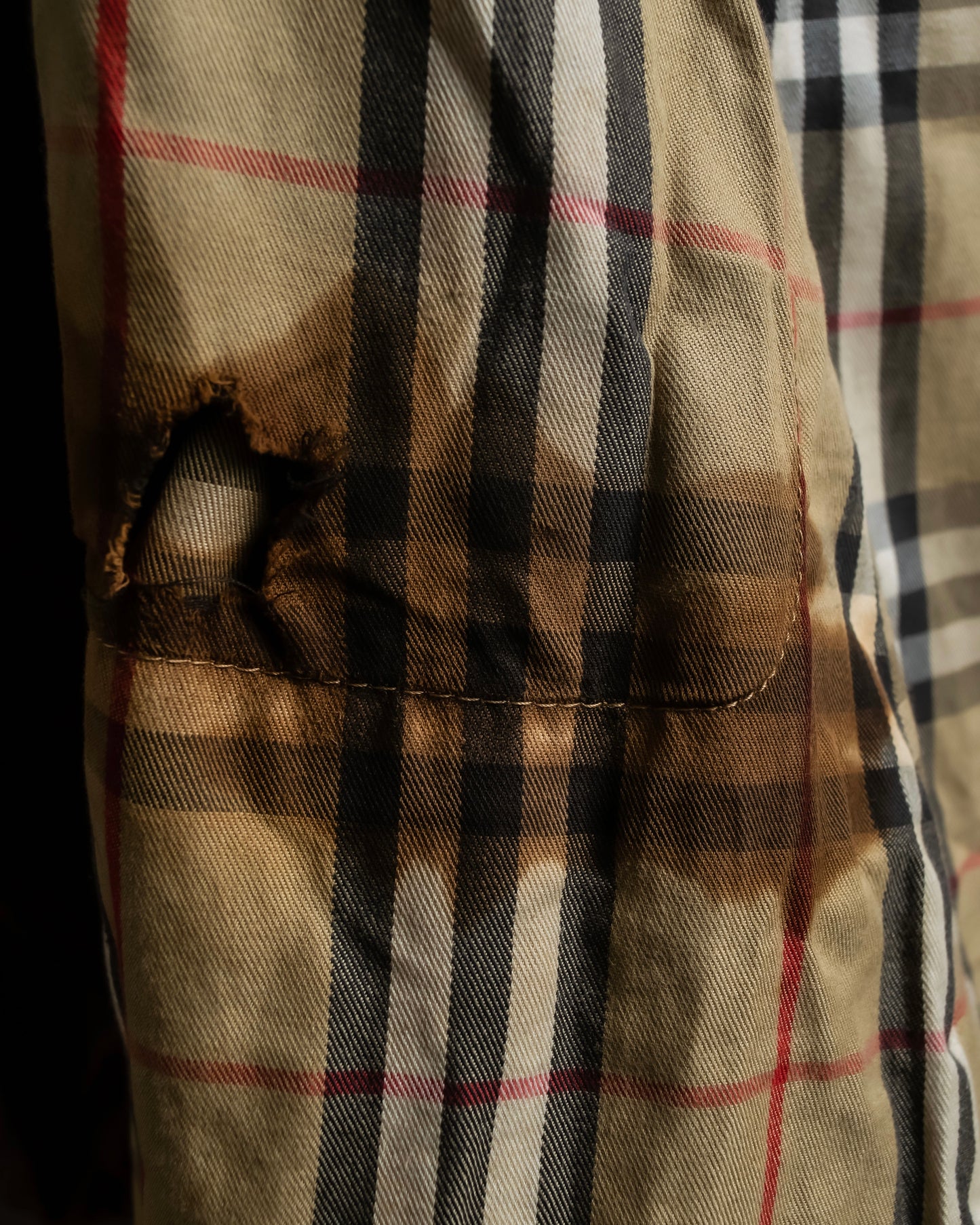 内側にはバーバリーのアイコンともいえるチェック柄のライニングが施されており、視覚的なアクセントだけでなく、ブランドのアイデンティティを強調しています。また、タグには「Burberrys」という表記が見られ、この表記から1999年以前に製造されたものであることが分かります。さらに、「MARUZEN TOKYO」の文字が記載されている点から、特注品または限定的なコレクションであった可能性が高く、希少性が付加価値として挙げられます。このような背景を持つトレンチコートは、単なる衣服を超えて、コレクターズアイテムとしても価値を備えております。