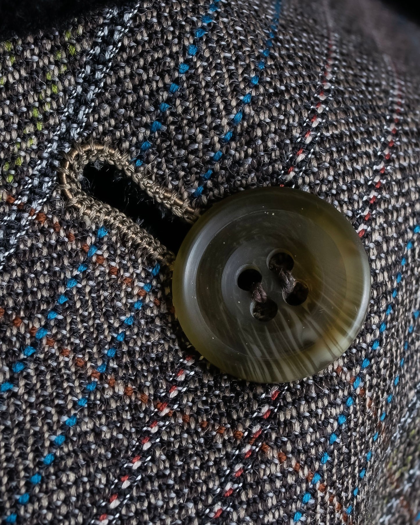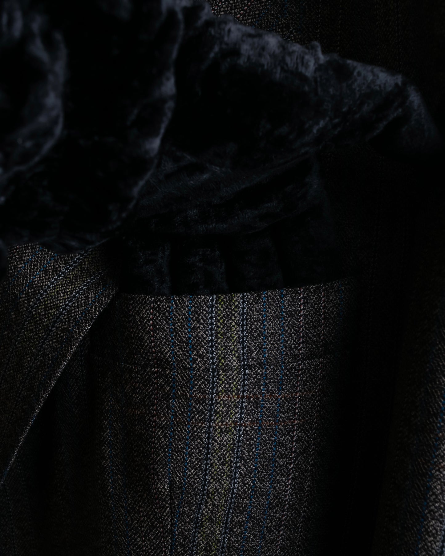 グレーを基調とした細かいストライプ模様が施されており、単色の生地に比べて奥行きと動きが加わっており、上品さを帯びた個性を兼ね備えている唯一無二の柄使いと言えます。