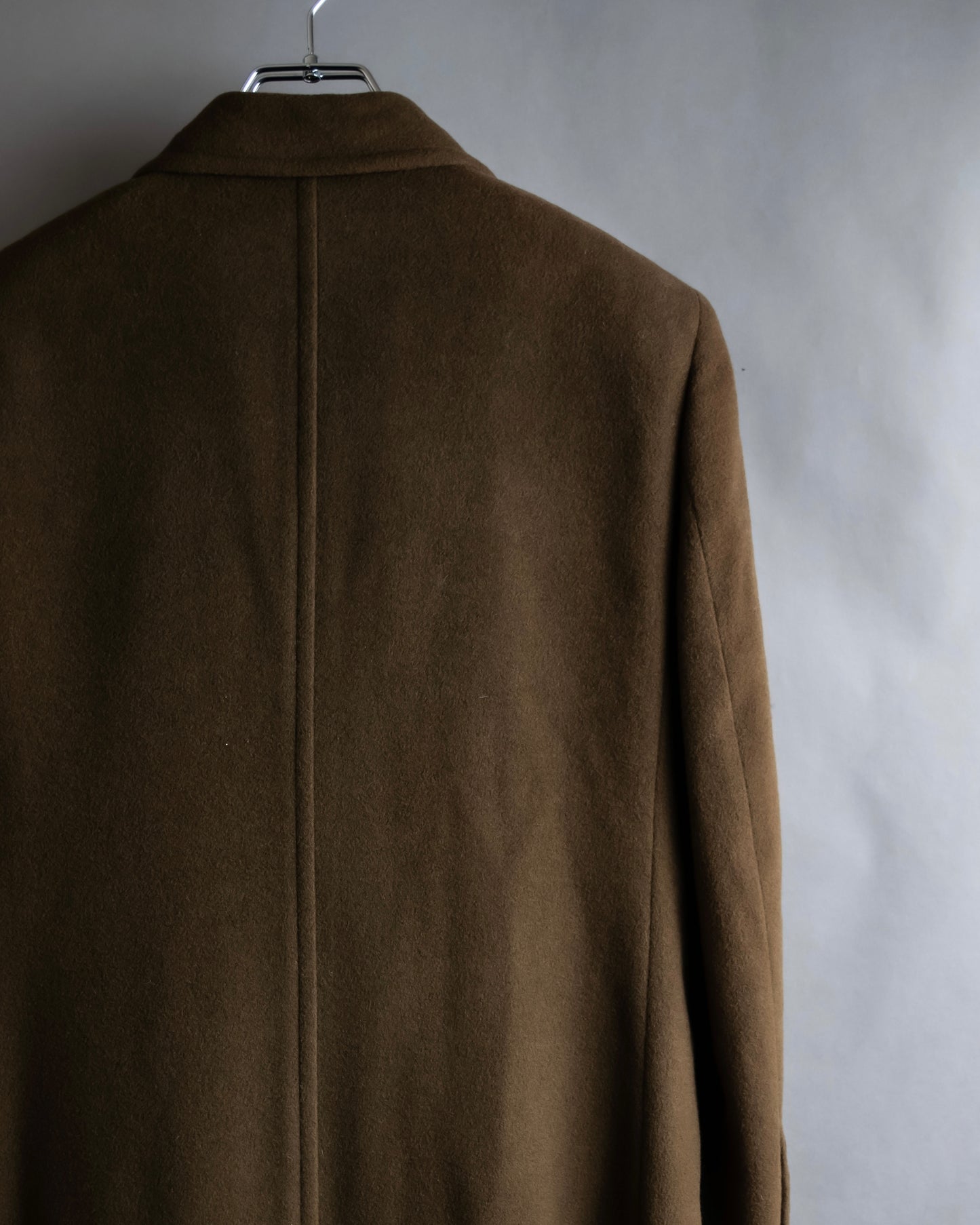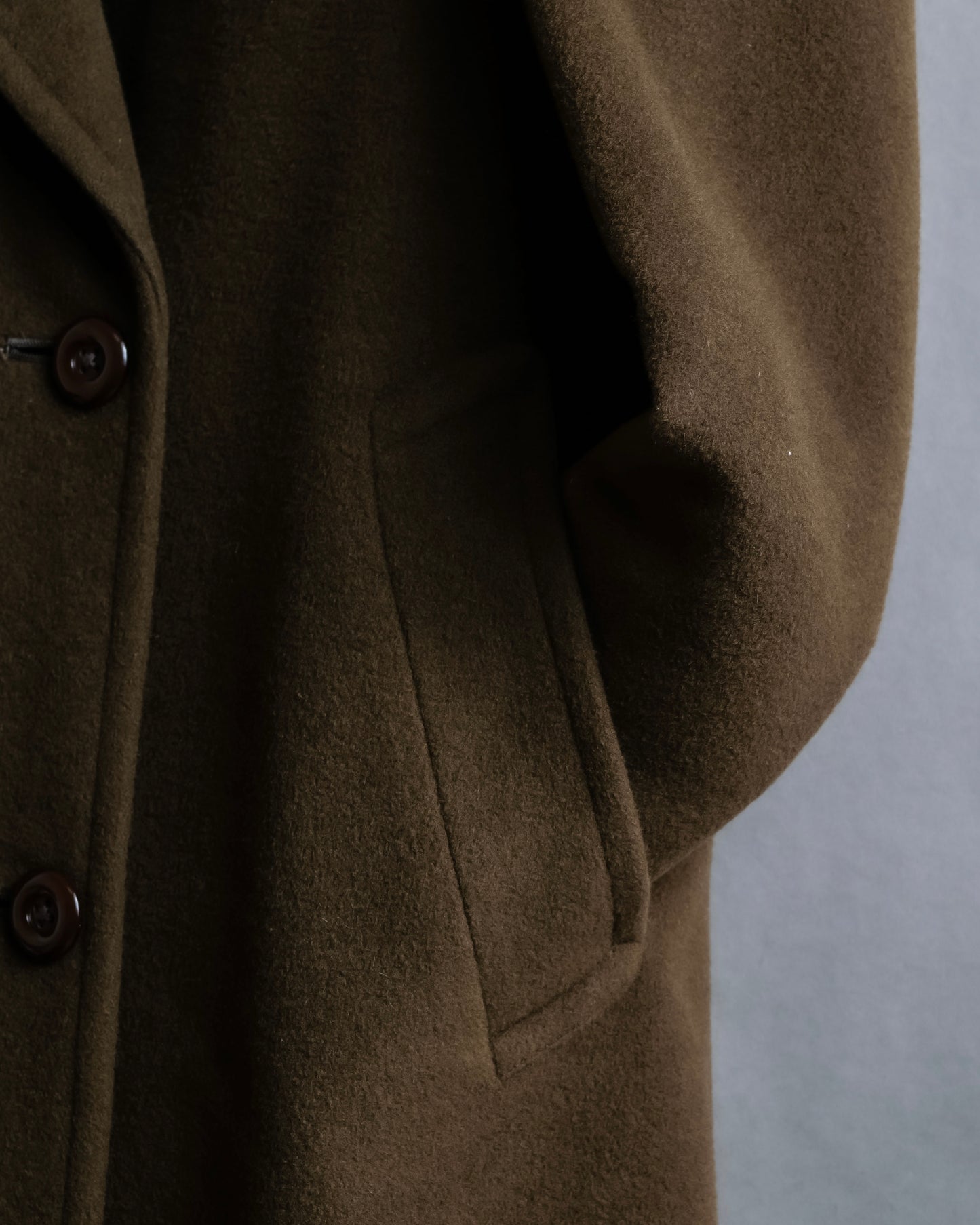 襟元はピークドラペルのデザインになっており、クラシックなチェスターコートの特徴を丁寧に反映している為、フォーマルで洗練された印象を強調し、トータルバランスを引き締める効果を担っております。