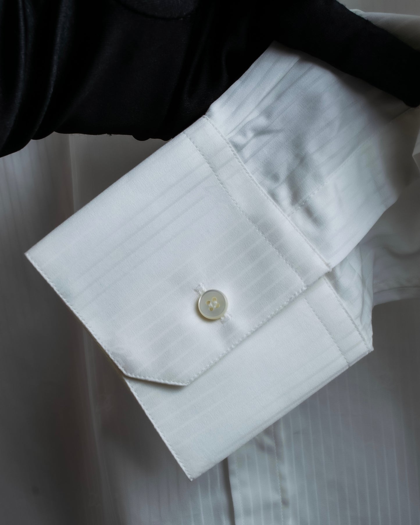 縦のラインを強調し、スタイリッシュな印象を醸し出すシャドーストライプ柄を全体に施しており、光の加減で柄が浮き上がる微光沢な表面感に仕上がっている為、インナーとしても1枚で着用した際も立体的な着こなしをお楽しみ頂けます。