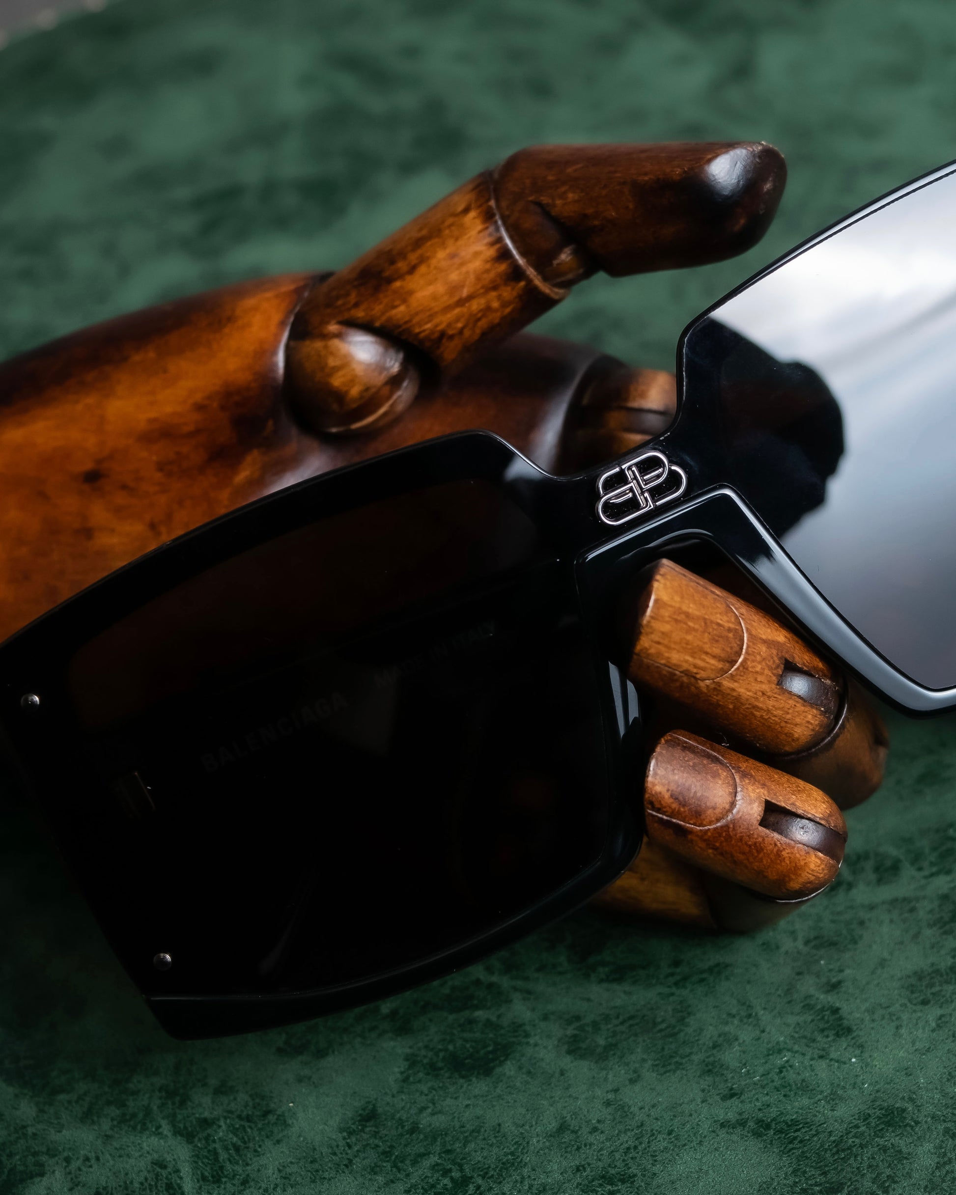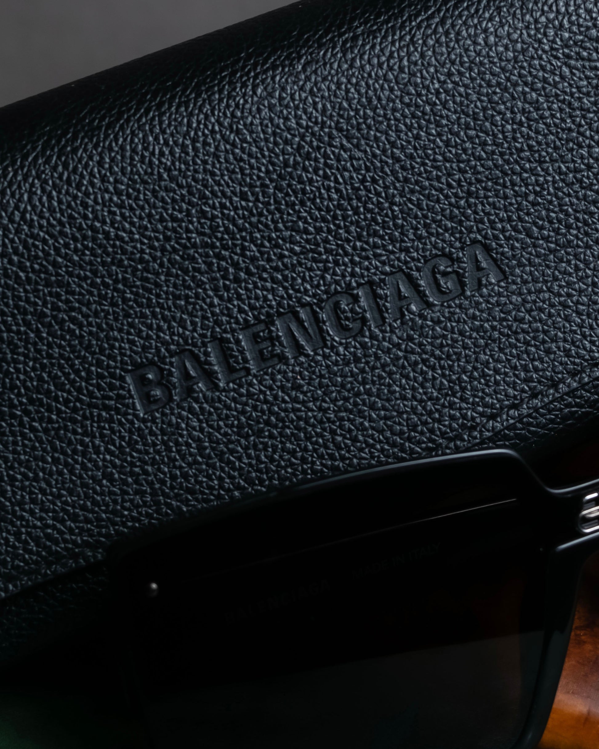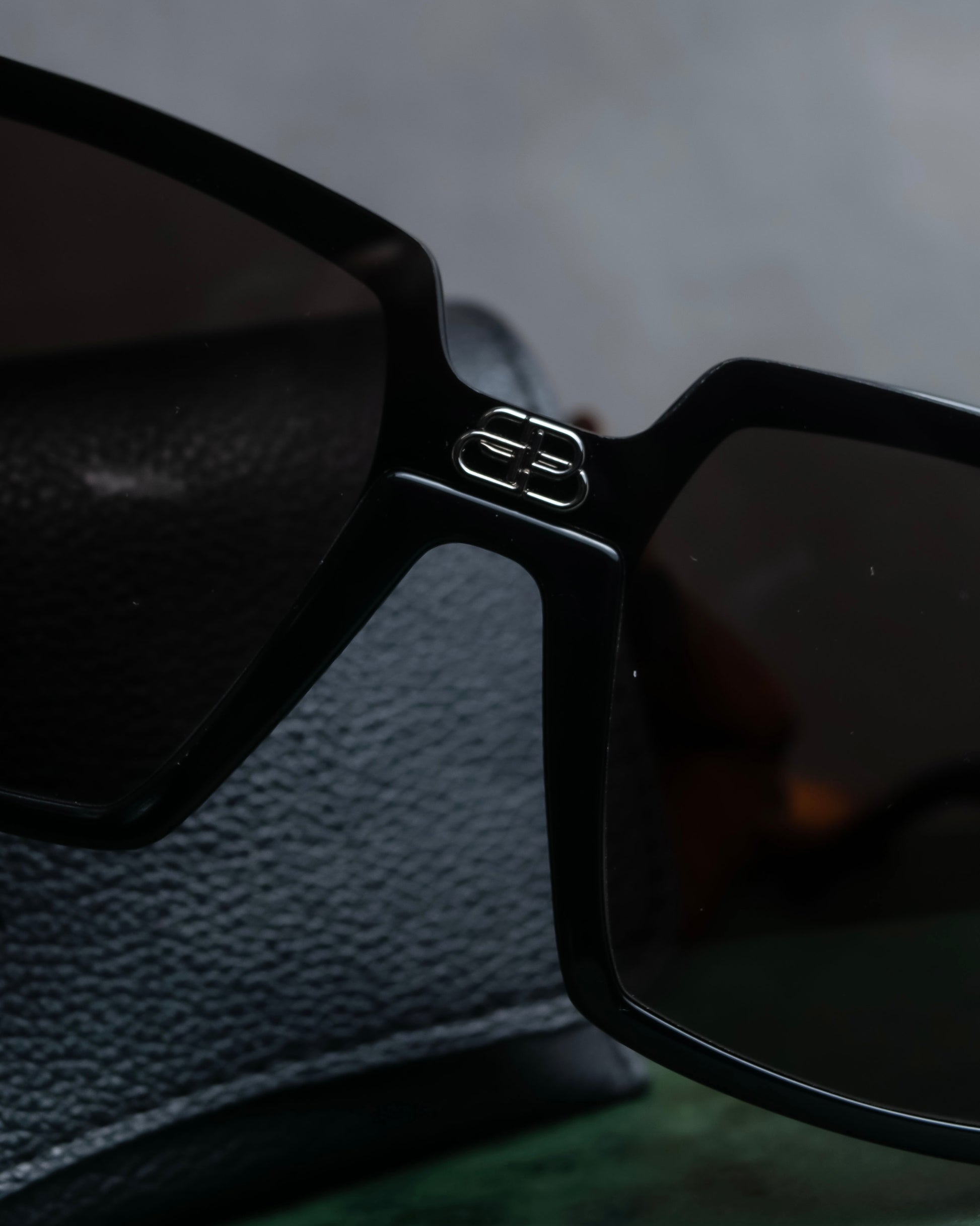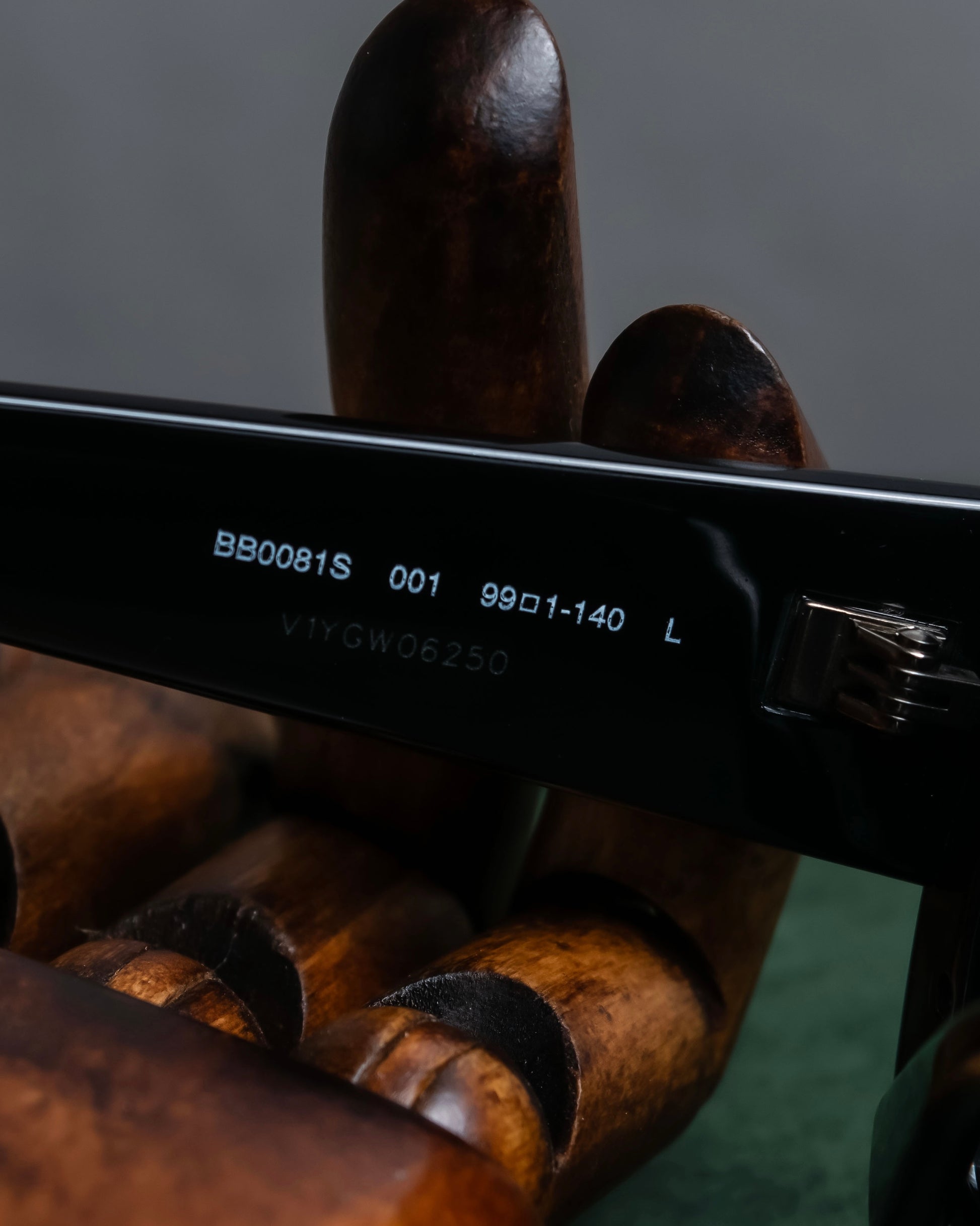 大胆なワイドフォルムと洗練された直線的なカッティングが、コンテンポラリーな印象を与えていますね。ブリッジ部分には控えめにブランドのダブルBロゴがあしらわれ、ディテールにまで洗練されたバランス感覚が息づいております。