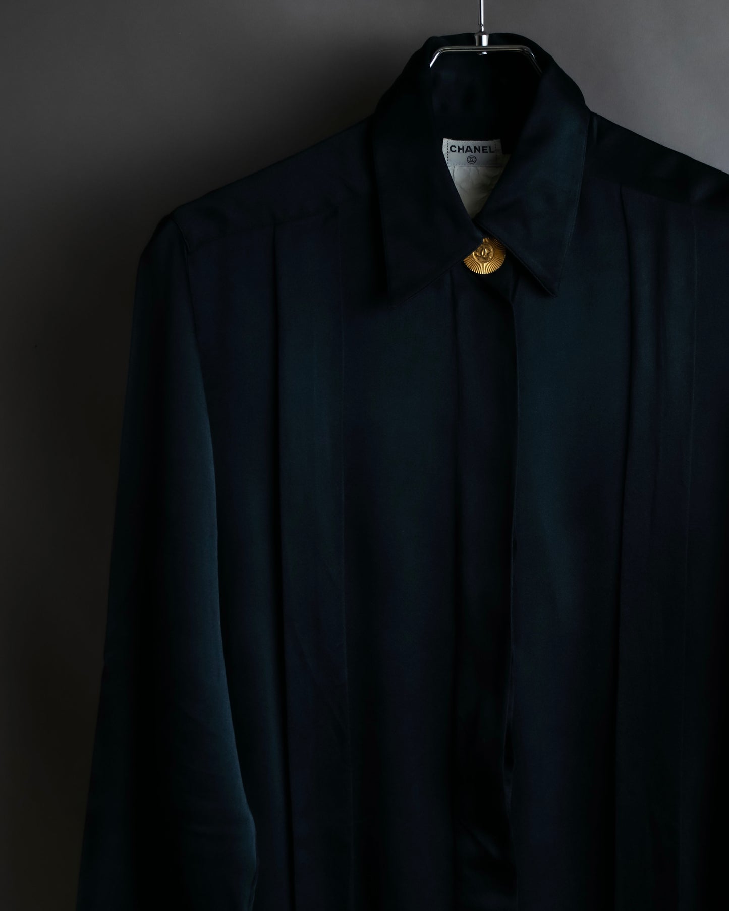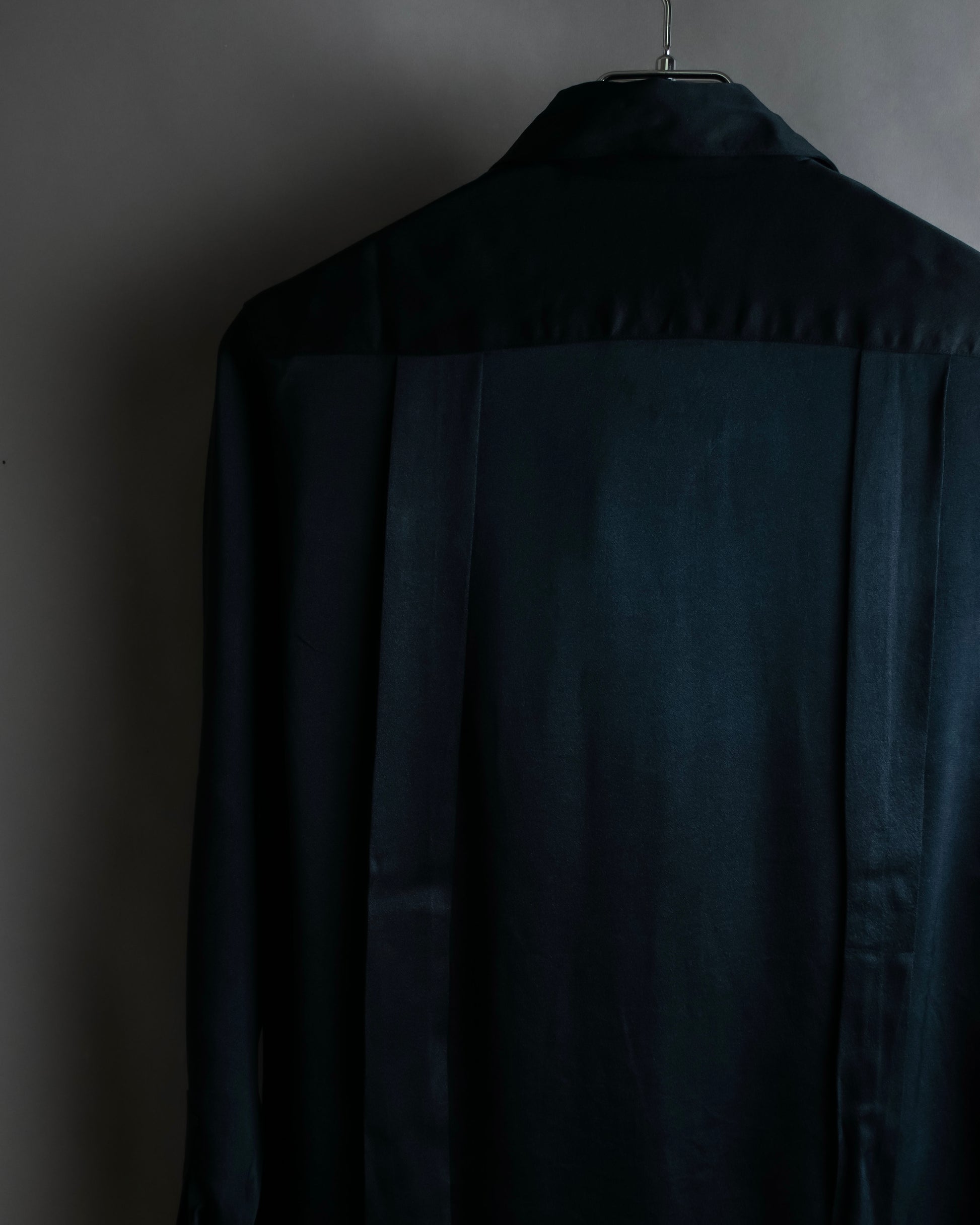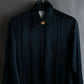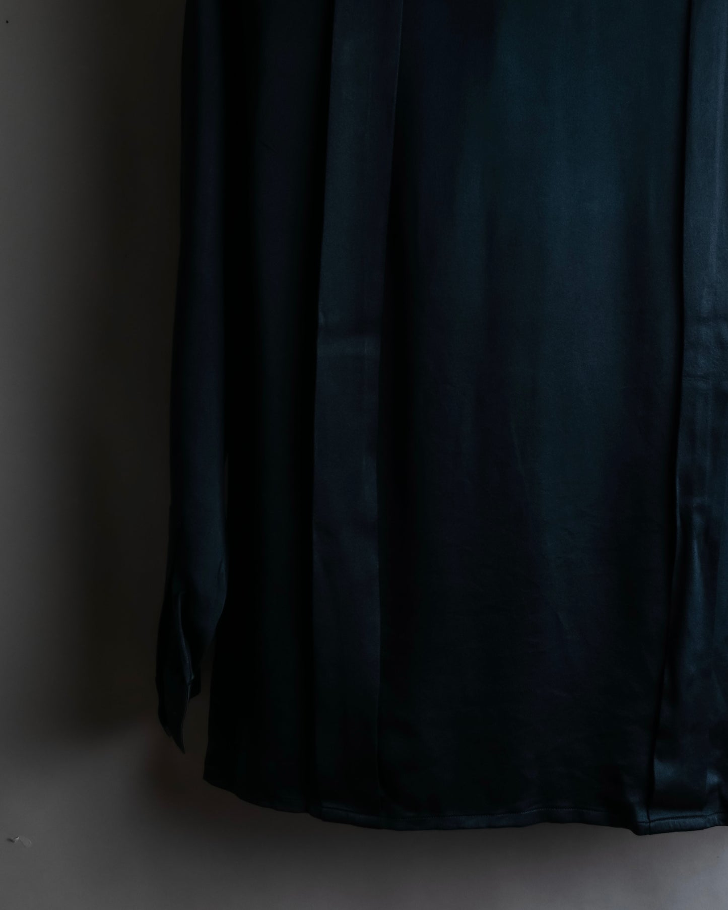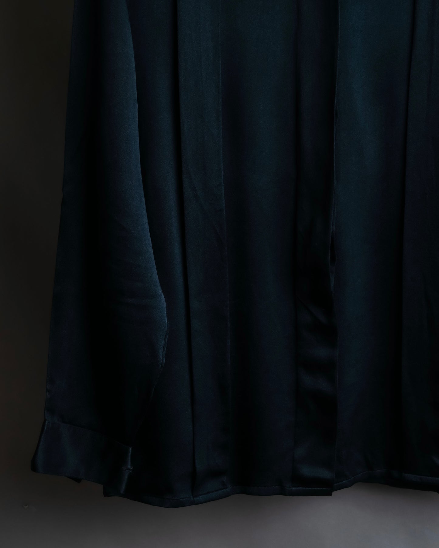ややゆとりをもたせたシルエットで、身体の動きに合わせて生地が滑らかに揺れるため、静けさの中にしなやかな艶やかさが宿ります。また、フロントは比翼仕立てとなっているため、装飾を削ぎ落としたクリーンな佇まいを保ちつつ、首元のゴールドがひときわ映える構成となっております。