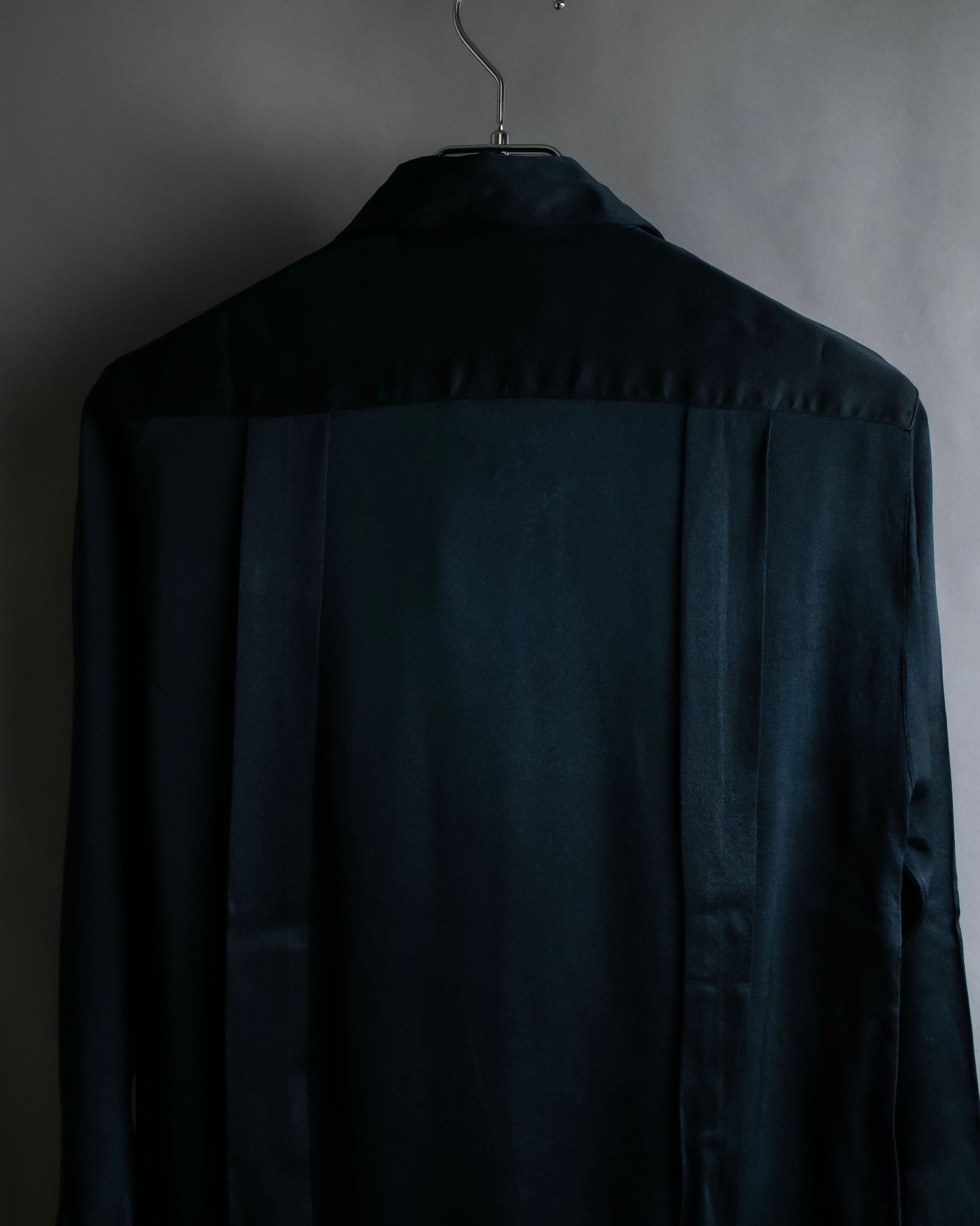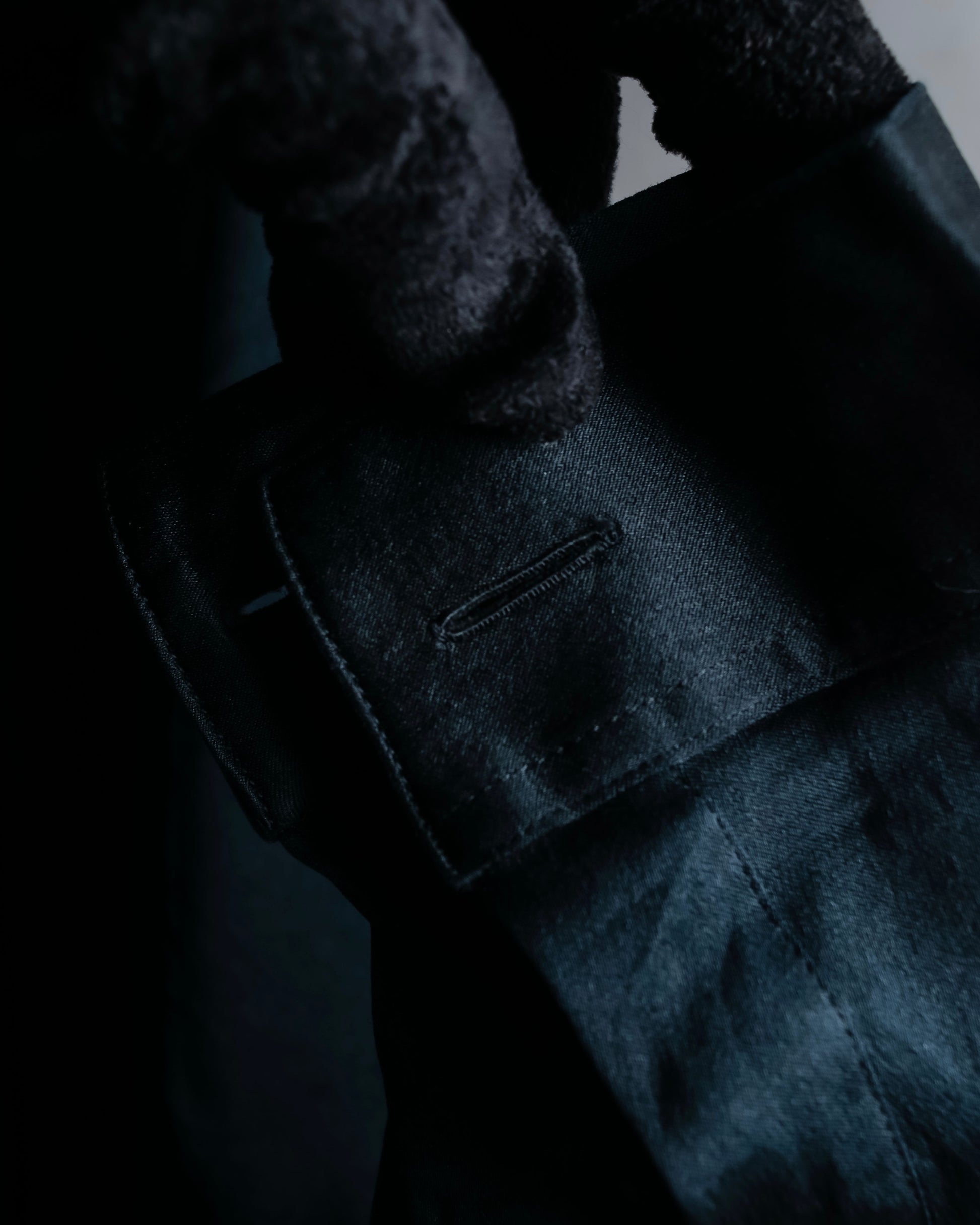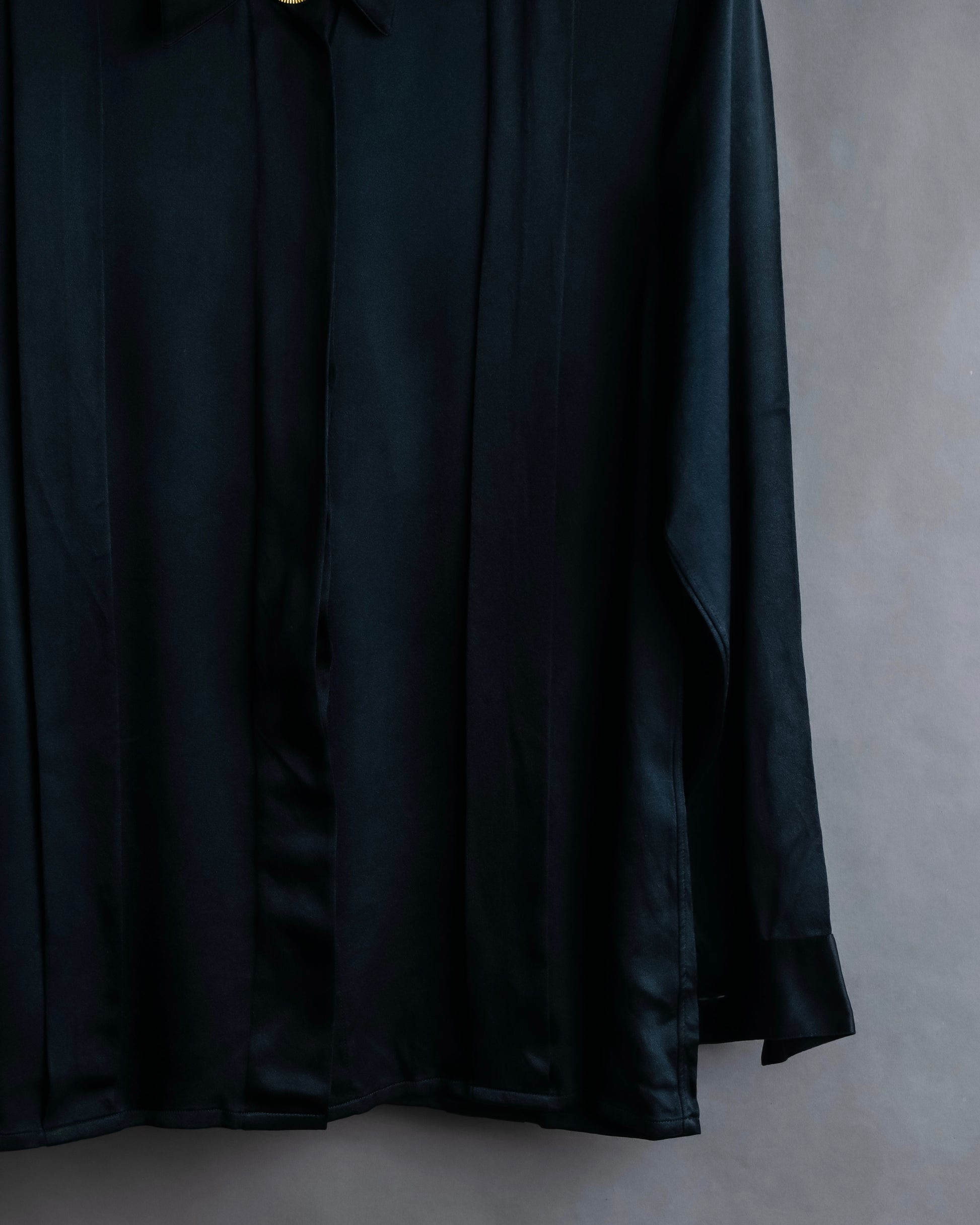 深いブラックの光沢がしっとりと肌を包む、こちらの逸品は縦にさりげなく走る織り柄が、光の加減によりほのかな陰影を生み出し、シンプルな一着に静かな奥行きを与えていますね。