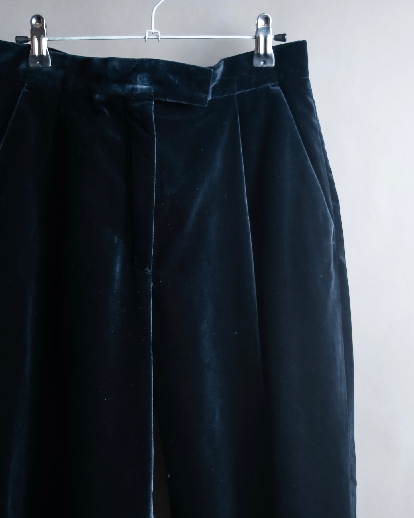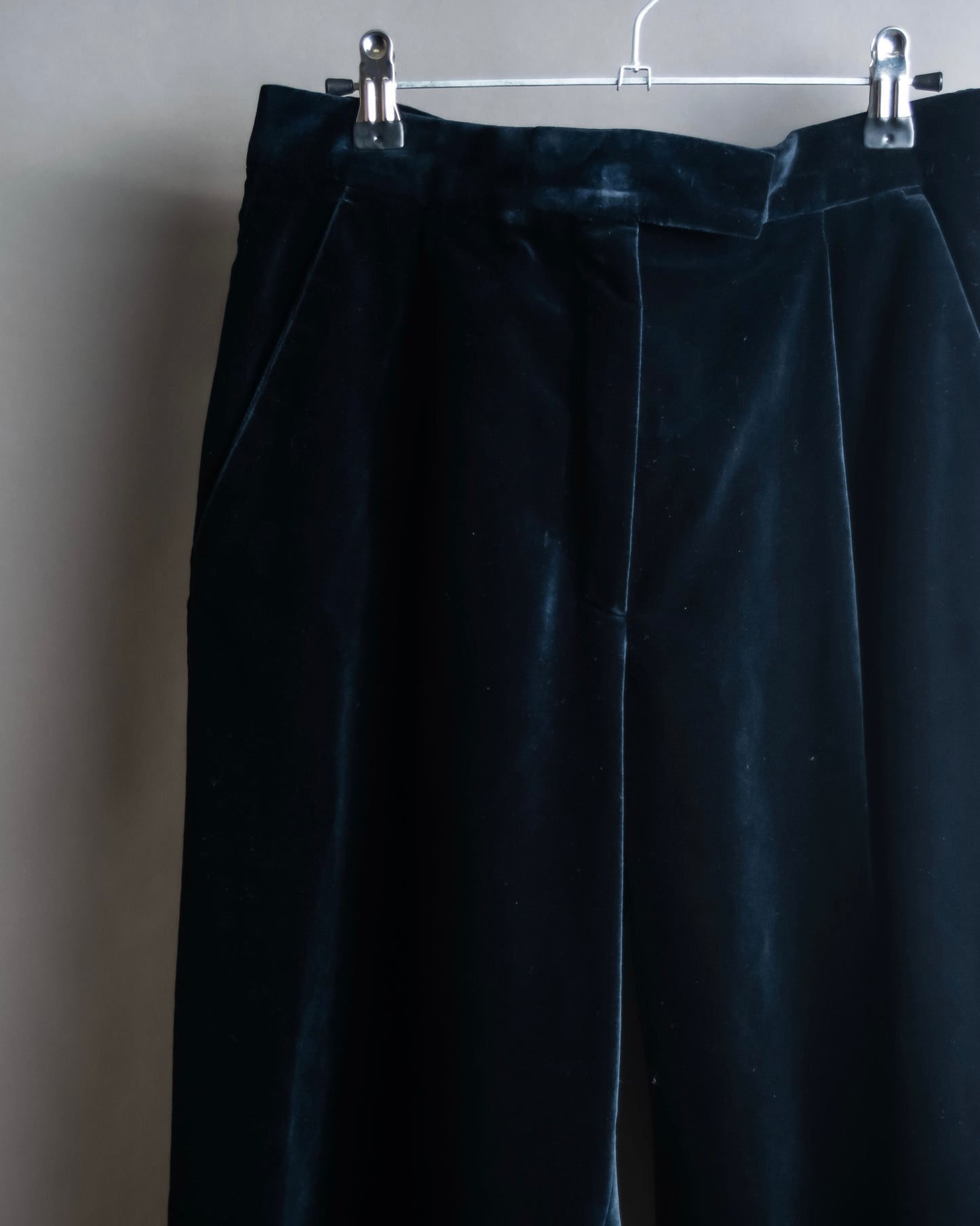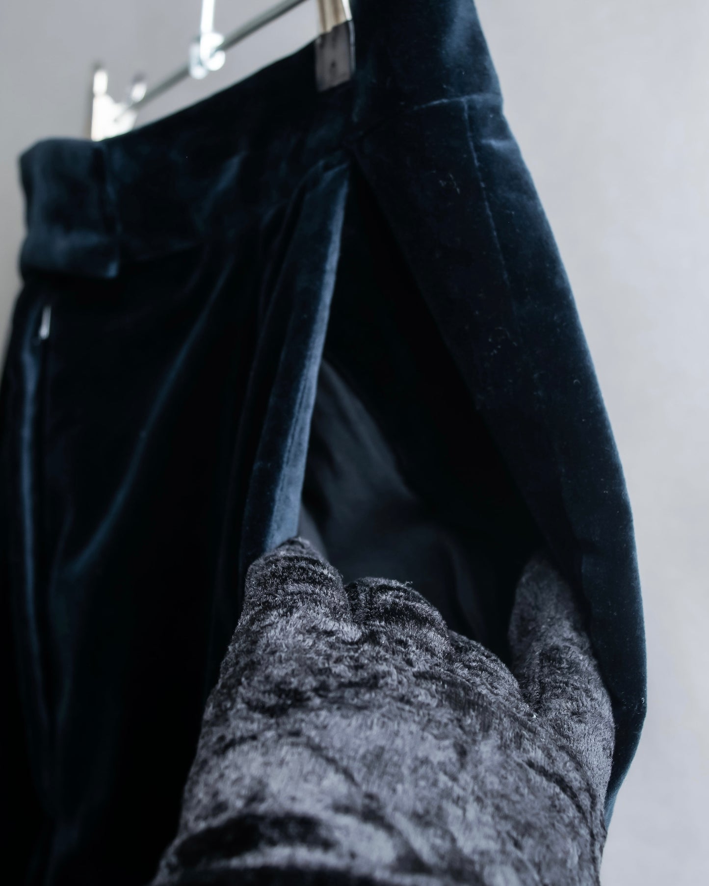 上品な光沢感と柔らかな手触りが特徴のベルベット素材は、ドリスヴァンノッテンならではのエレガンスを体現しており、光の角度によって絶妙に変化する深いブラックの色味は奥行きと豊かさを感じさせ、シンプルでありながら視覚的な存在感を誇っております。