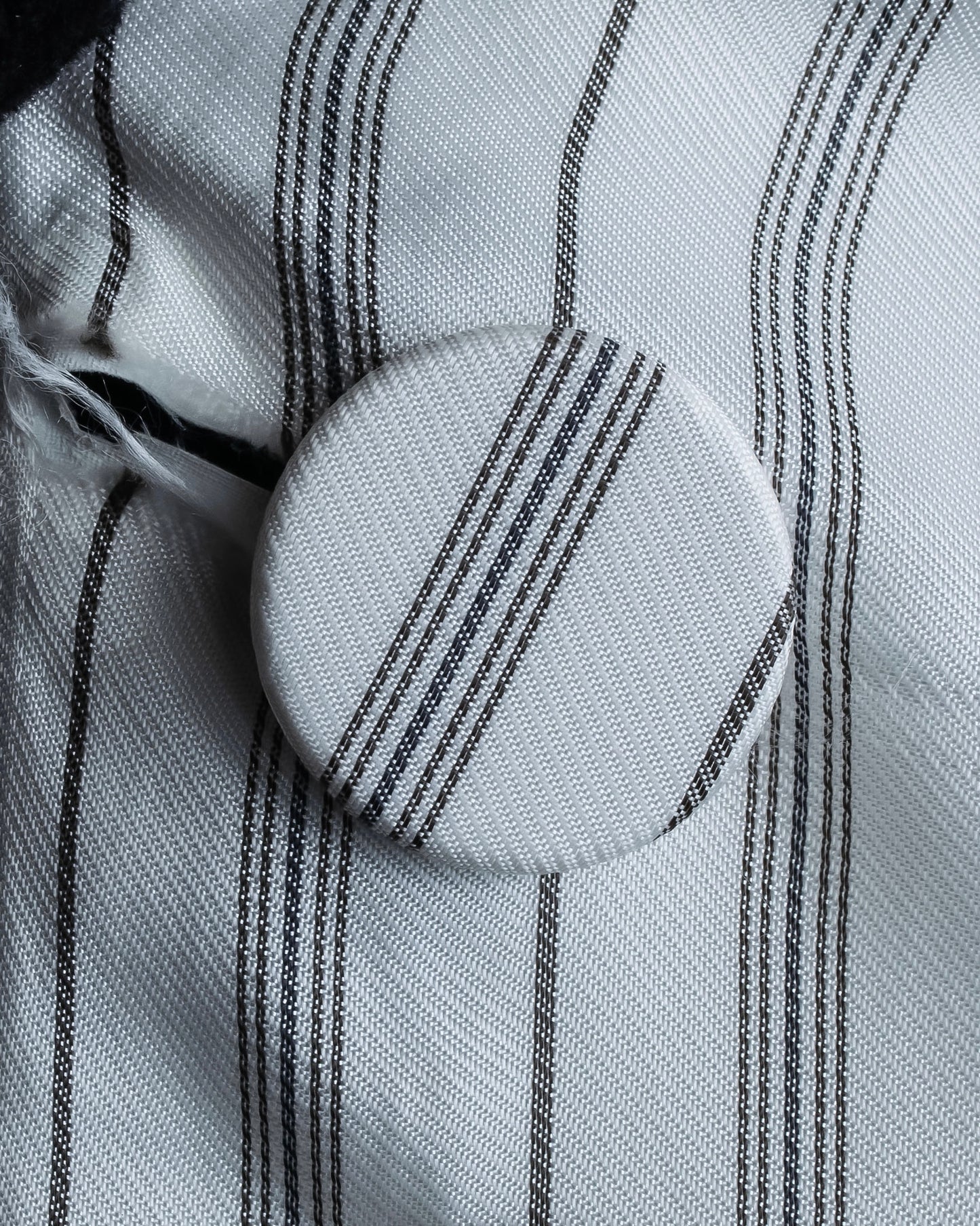 大きめのラペルが特徴で、伝統的なテーラードコートの要素を現代的に再解釈した様な印象に仕上がっており、エレガントな顔周りと遊び心を兼ね備えたディテールに仕上がっております。