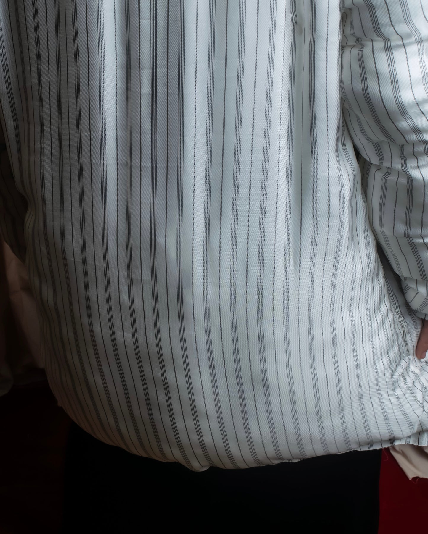 スタイリングとしては、インナーにシャツタイを着用し、ドレッシーな印象を加えつつ、