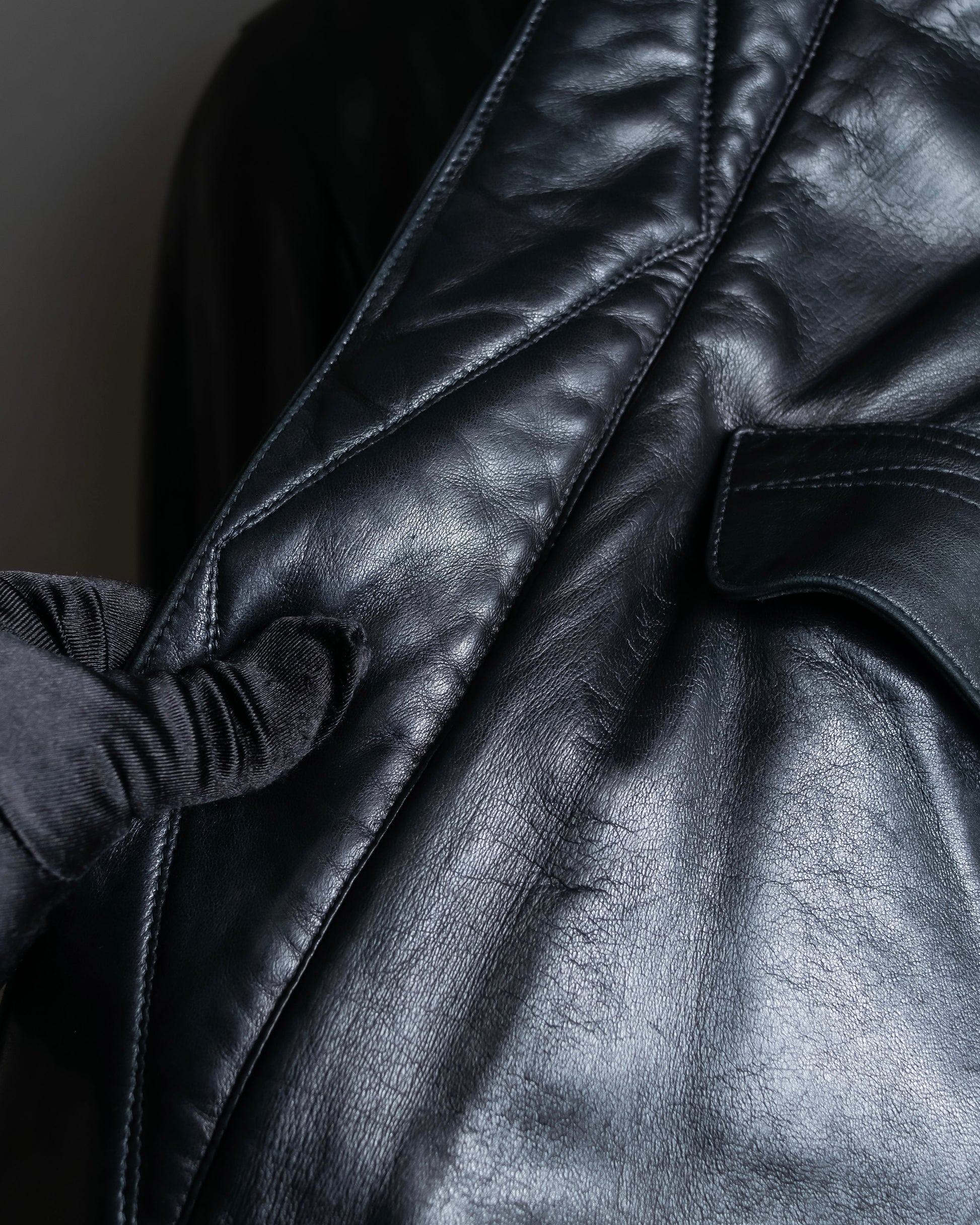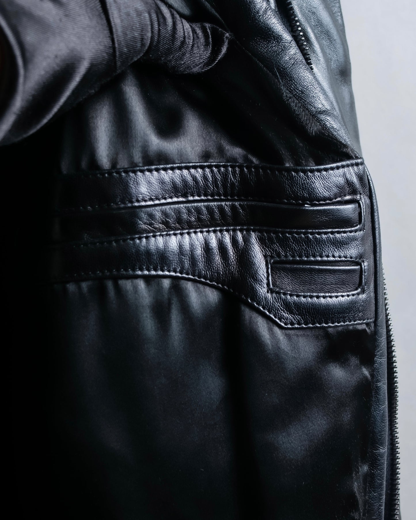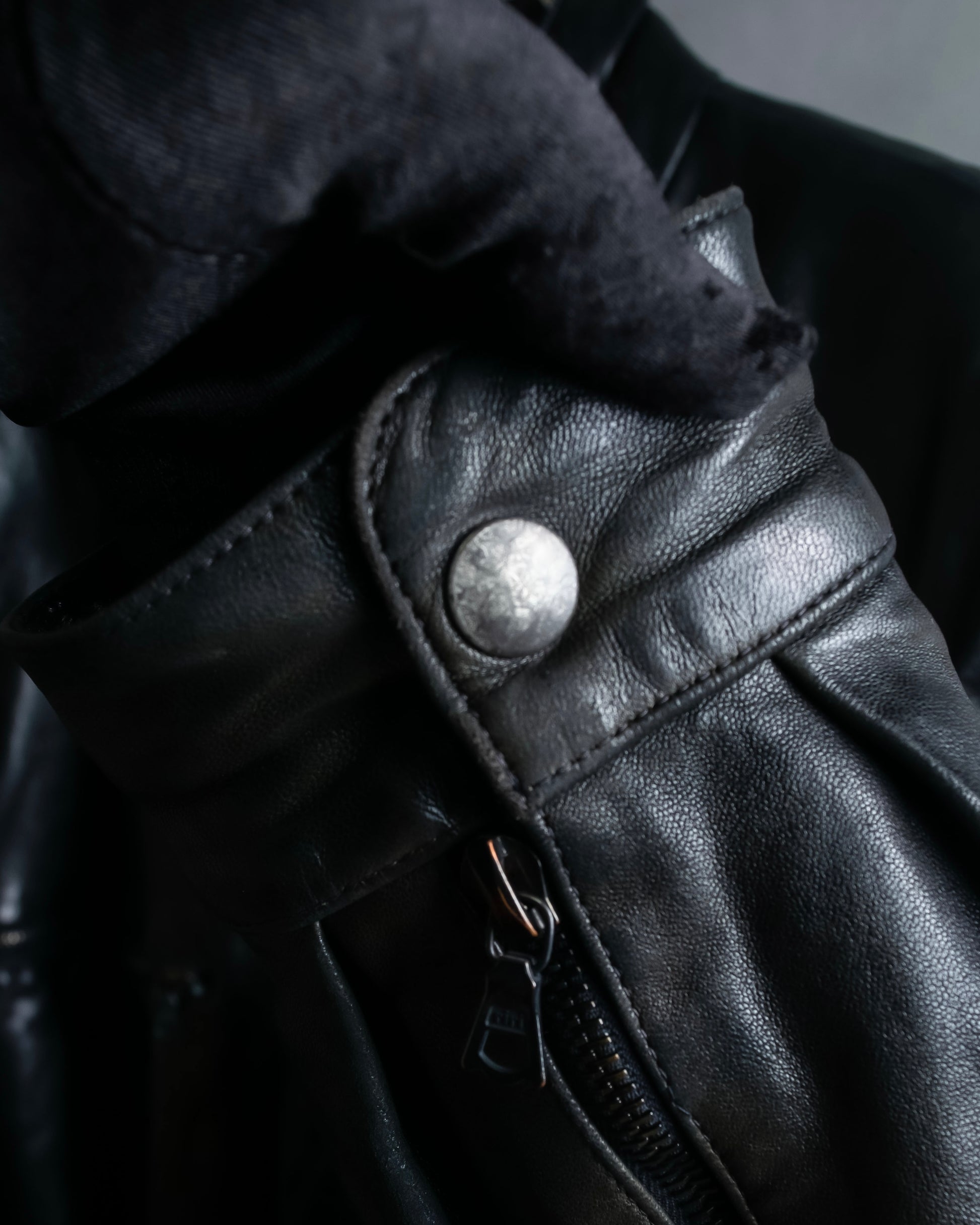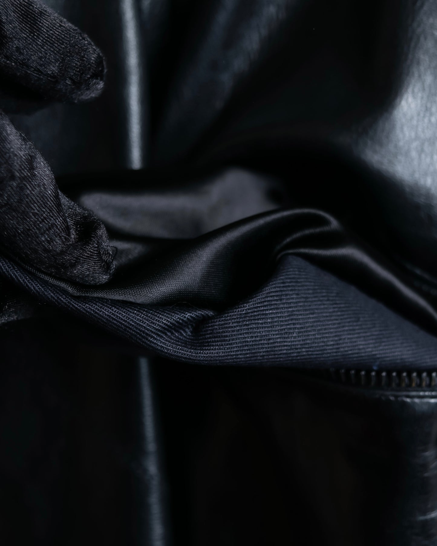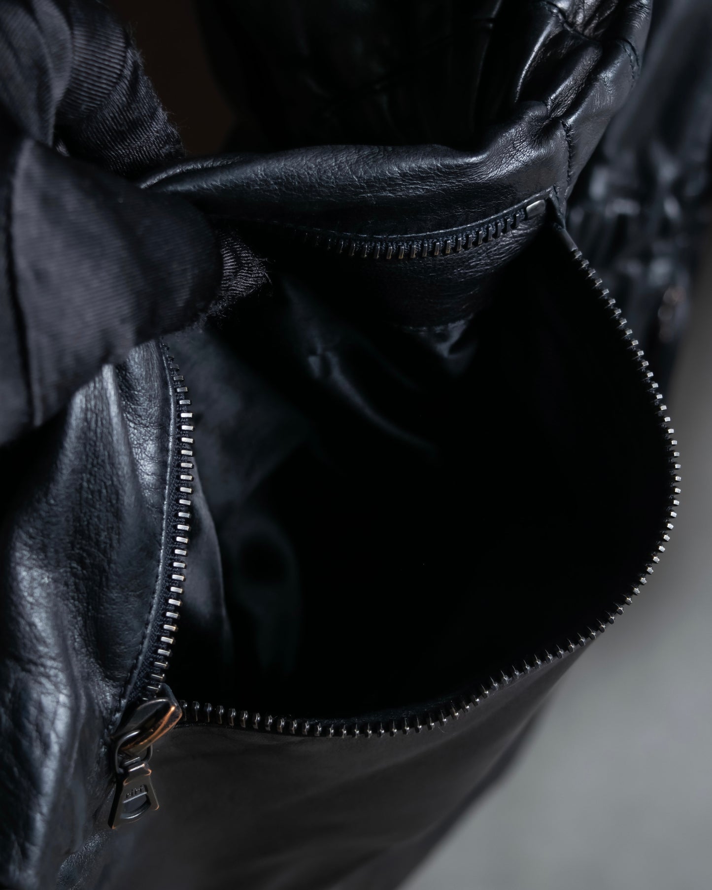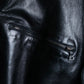 上質なブラックレザーが用いられた艶と質感が特徴で、レザーの選定にはこだわりが感じられ、滑らかでしなやかな触感とともに、しっかりとした厚みが構造的なデザインを支えているバランスの取れた仕上がりを誇っております。