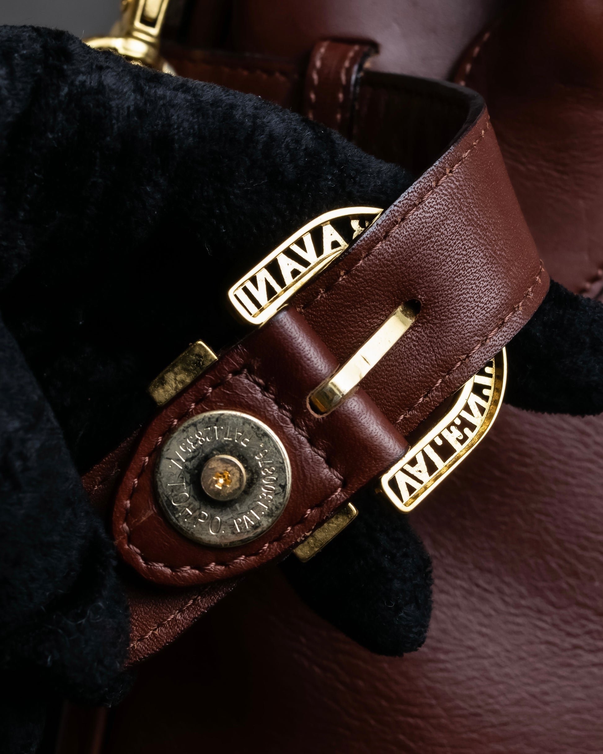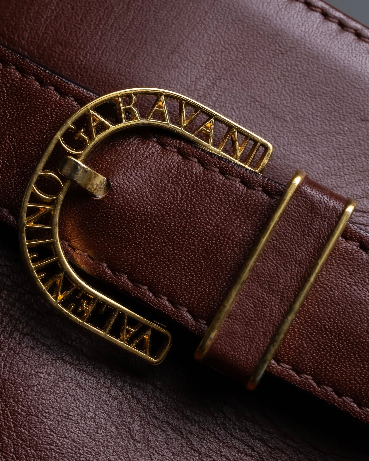 特筆すべきは、フロントに配された“GARAVANI”の刻印入りバックルディテールで、金具としての機能性だけでなく、ブランドの美学を静かに語るアイコンとして際立っており、クラシカルでありながらもエレガンスと気品を宿した存在感を放っていますね。また、ストラップの内側にまで丁寧に縁取りを施すなど、縫製やパーツの細部に至るまで一切の妥協が見られず、オールドバレンティノらしい贅沢な仕立てが全体の品格を高めています。