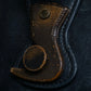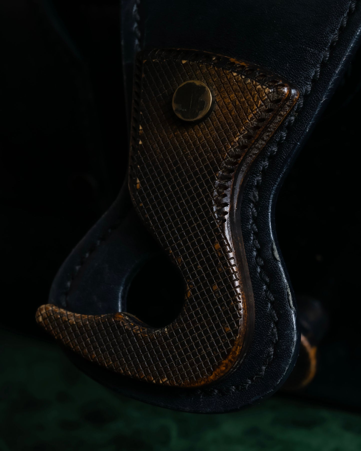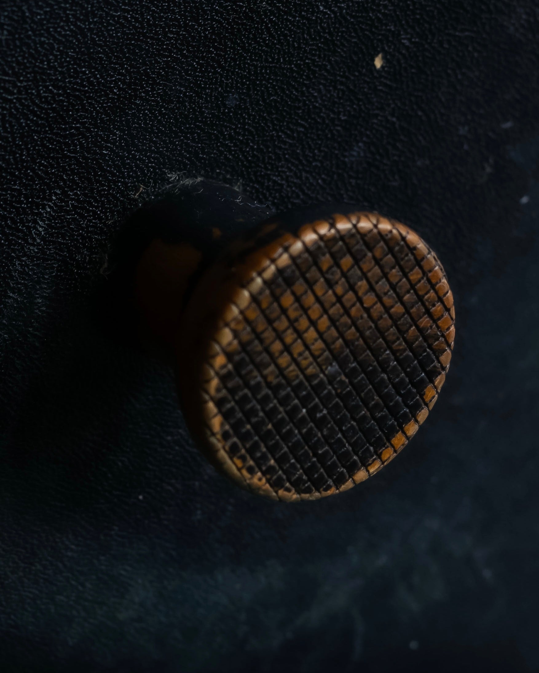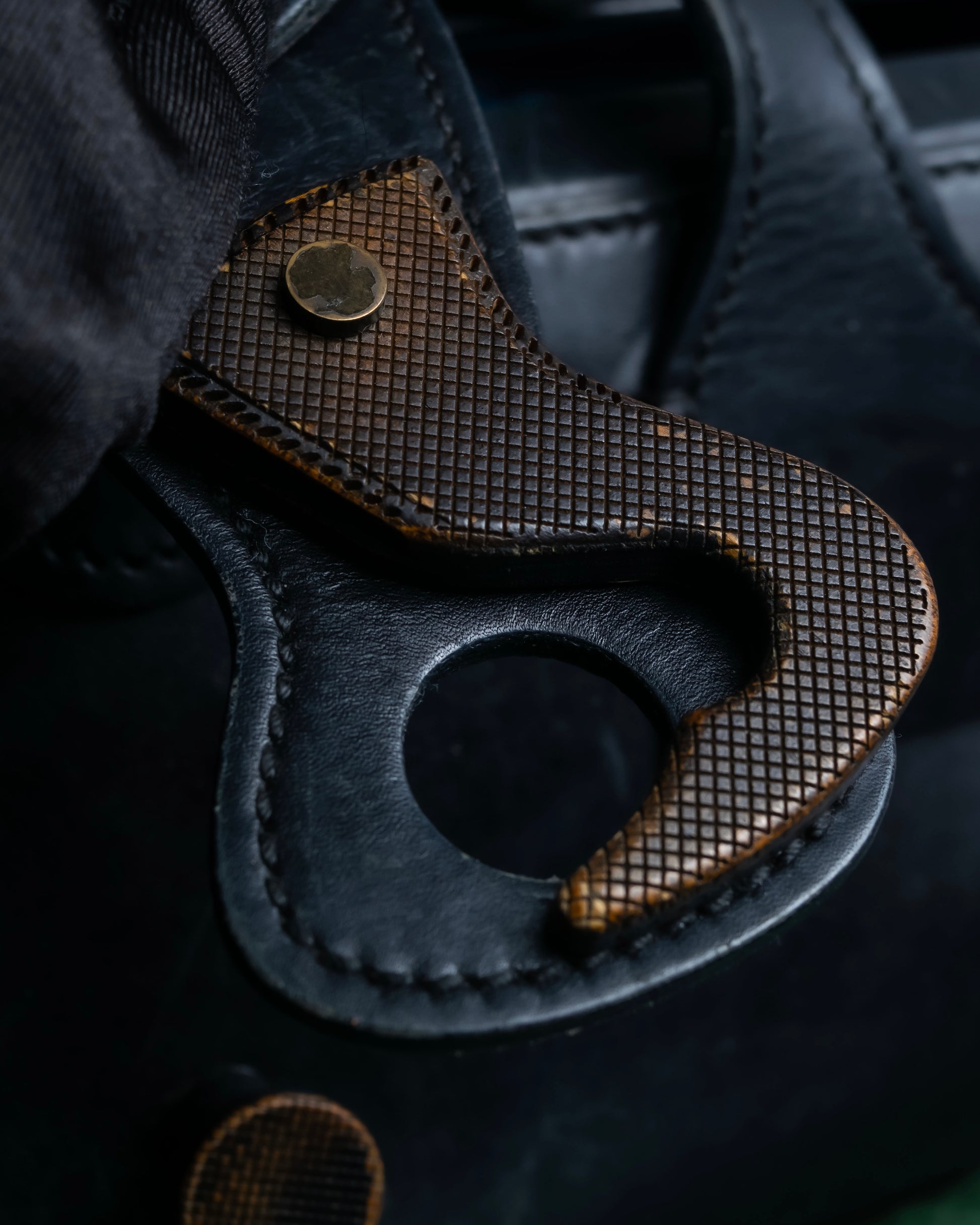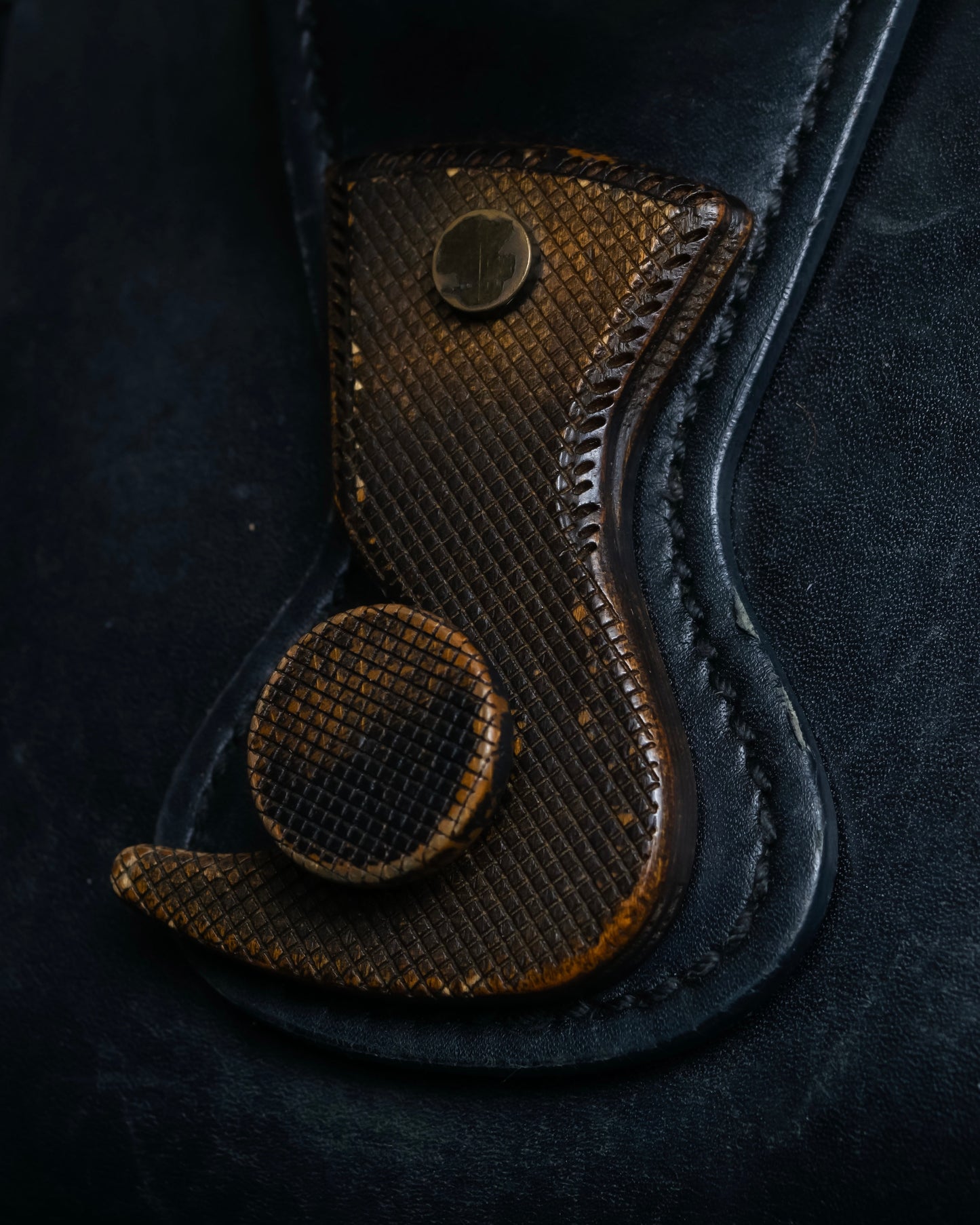 フロントにあしらわれたメタルパーツは、実用性と装飾性を兼ね備えたディテールとして、バッグのアクセントとなるだけでなく、ヴィンテージ特有の味わい深さを一層引き立てています。また、レザーのエイジングが絶妙なコントラストを生み出し、使い込むほどに増していく風合いが魅力的です。