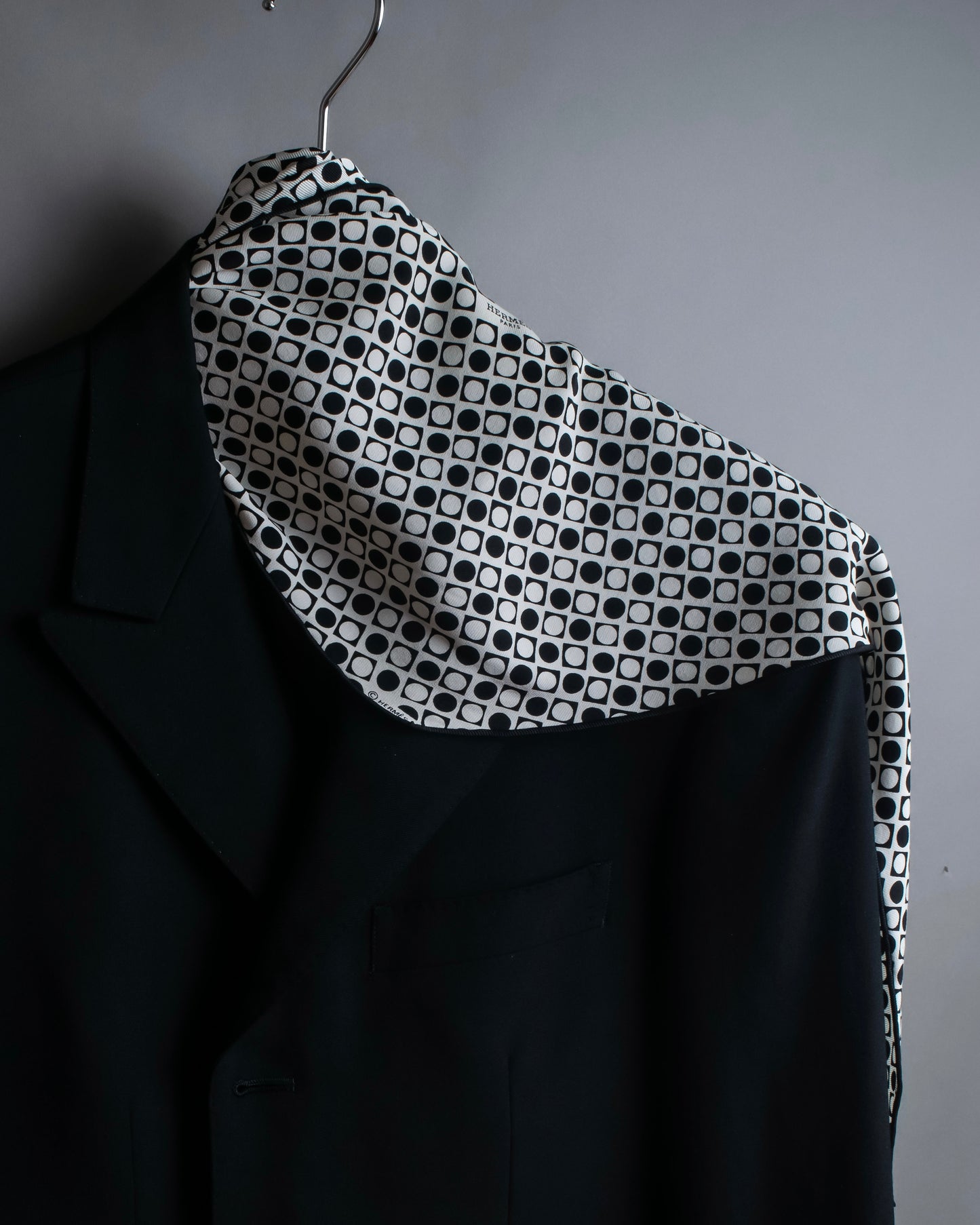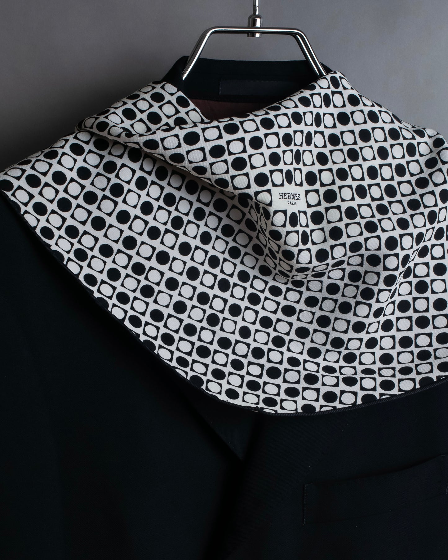 どの角度から見ても均一かつリズミカルな美しさを持つ幾何学模様はクラシックなスタイルにもカジュアルな装いにも合わせやすい点が特徴で、エルメスならではの上質なシルク素材と相まって、首元に視覚的な優雅さを加えて頂けます。