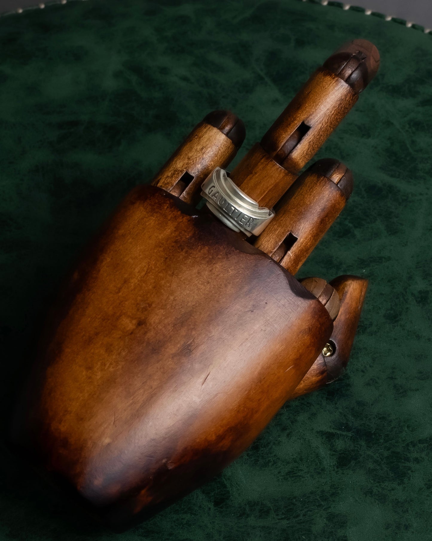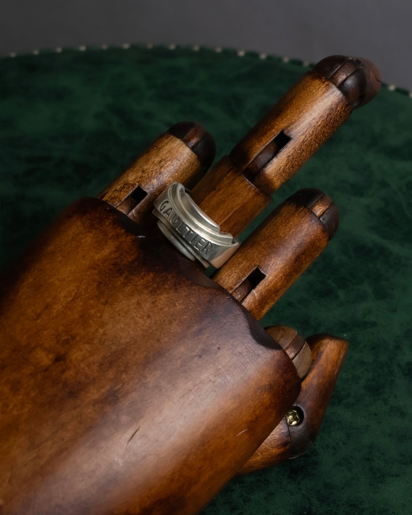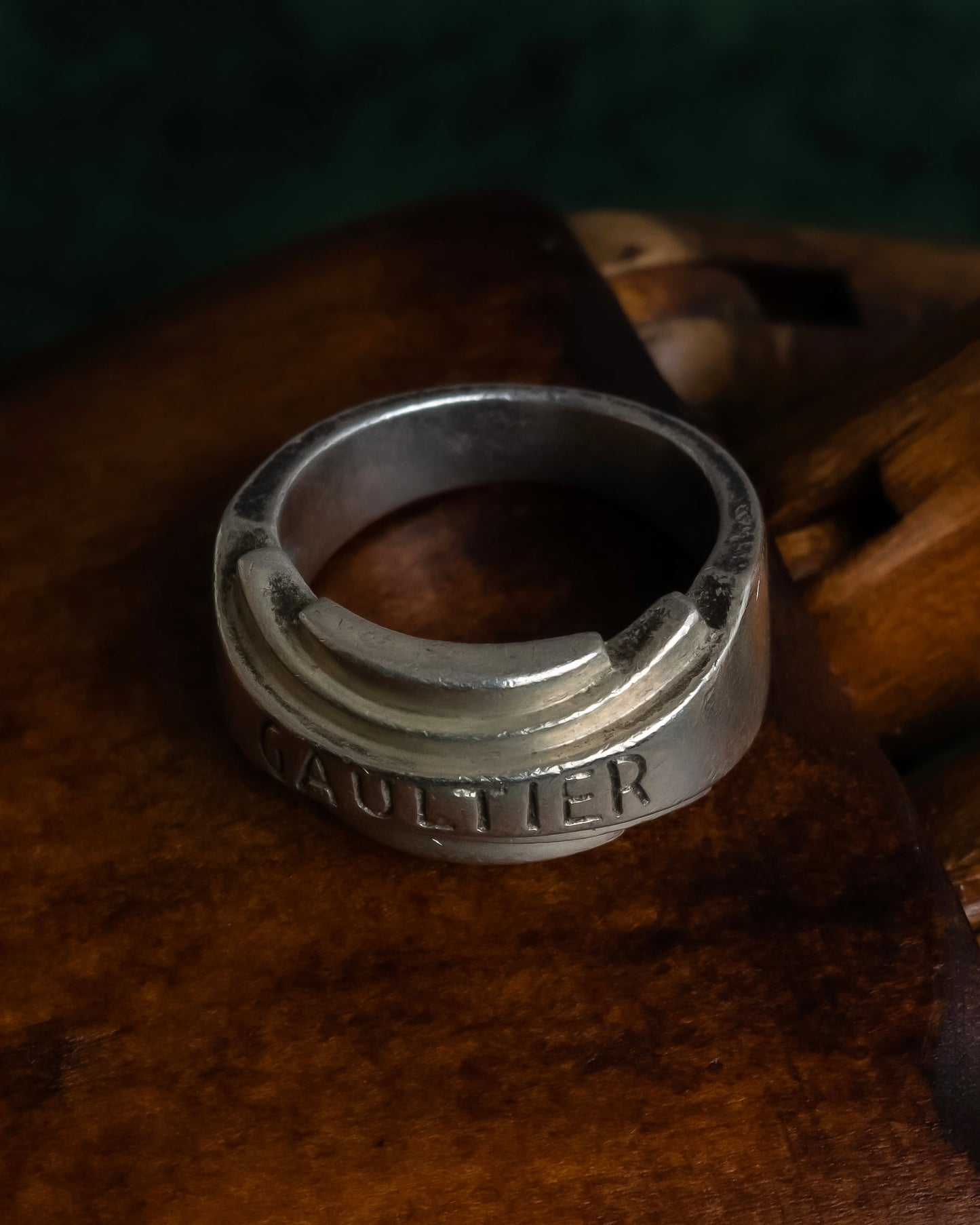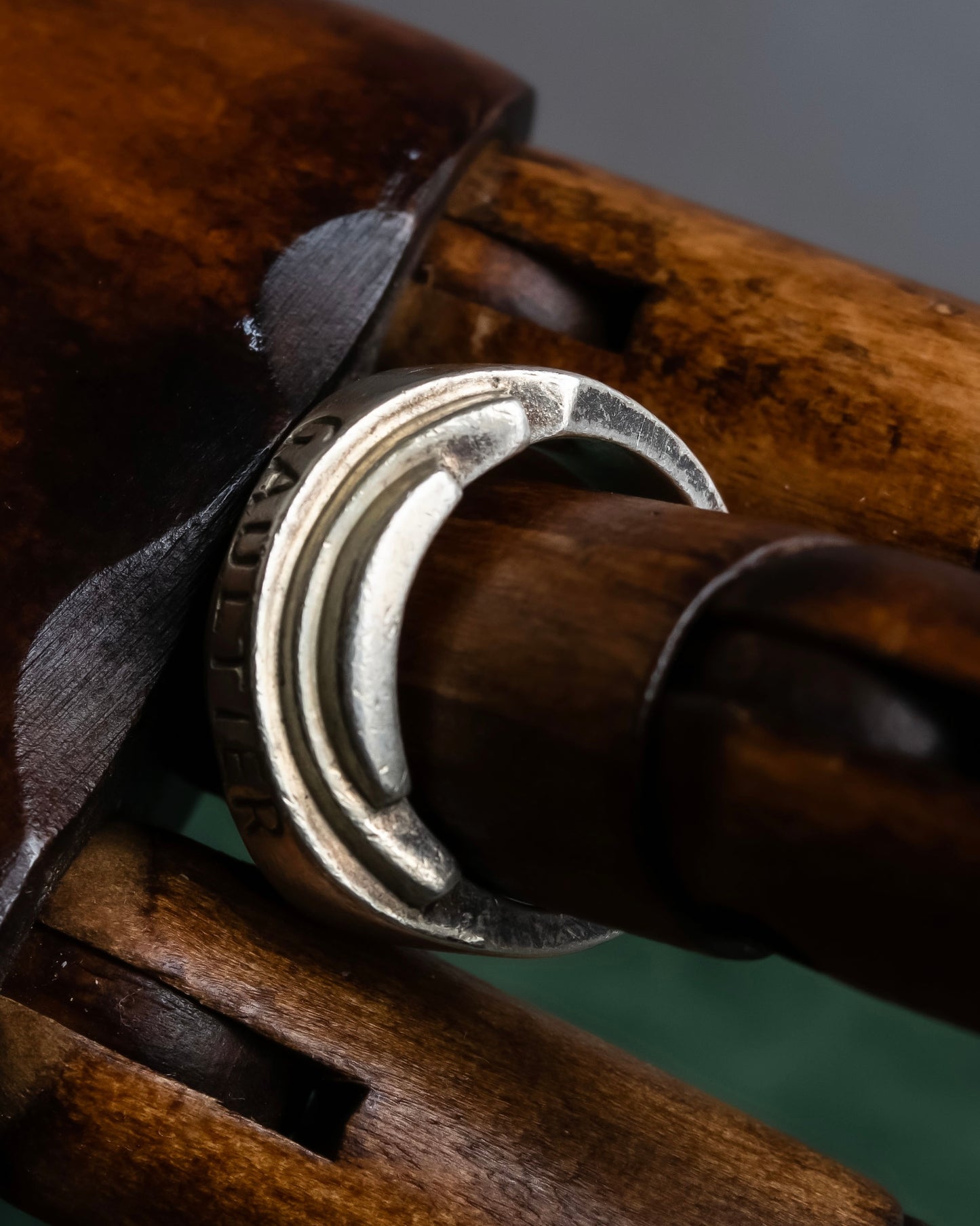 指元を力強く囲むシルエットは、まるで一枚の金属がねじれながら造形されたかのような存在感を放ち、フロントには力強く“GAULTIER”の刻印が刻まれている為、ただのロゴではなく、そのブランドが纏う哲学までも感じさせる意匠となっています。