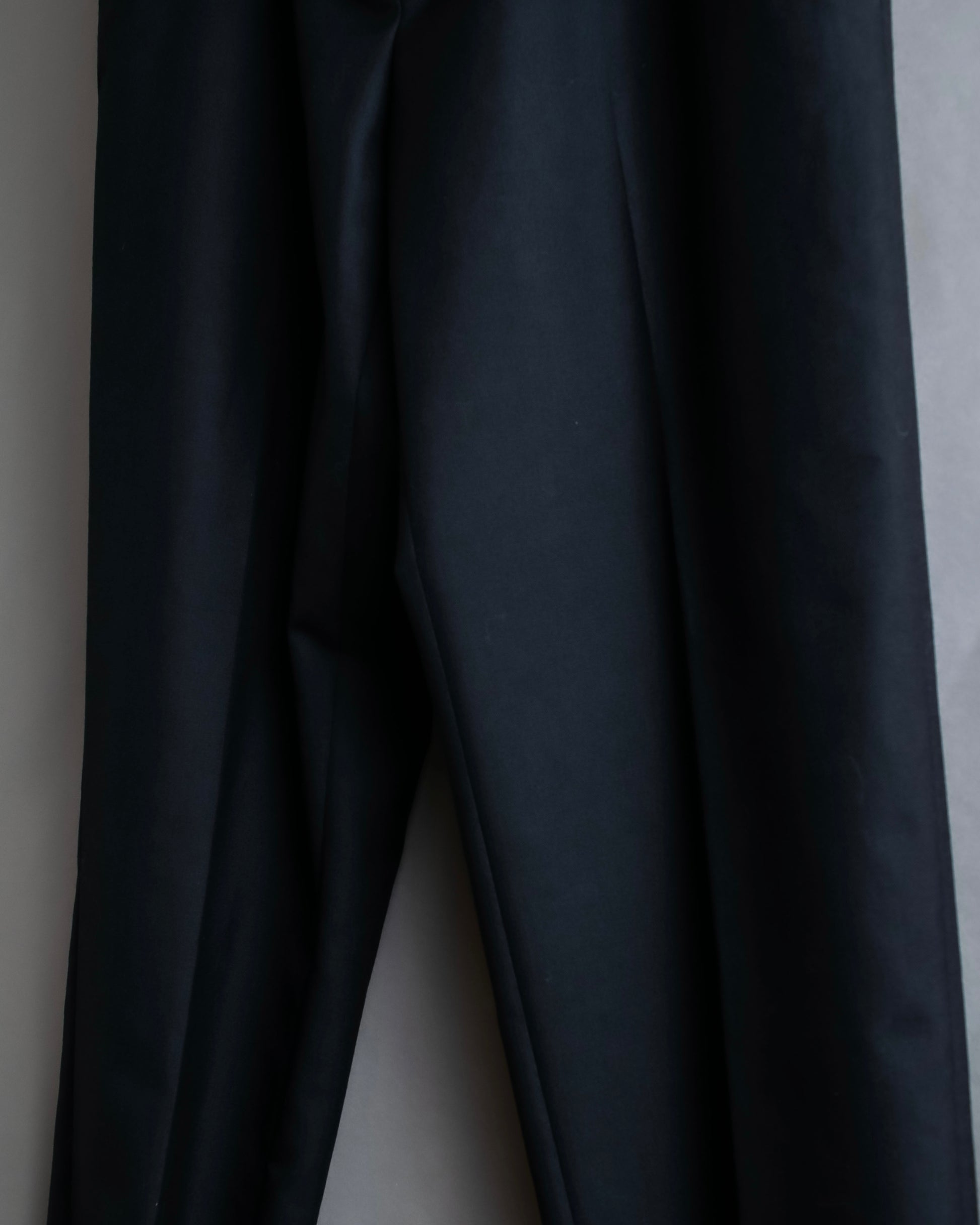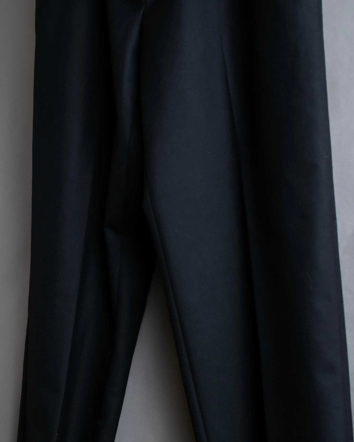 ウエストからヒップラインにかけては柔らかく沿わせ、裾にかけてシャープに絞られたテーパードシルエットとなっているため、履くだけで視覚的に脚が長く、端正に整った印象を与えることができる仕上がりです。フロントには深めのタックが隠し込まれており、動作時にも生地がもたつかず、立体的で洗練された表情を保ってくれる設計である点も魅力のひとつです。