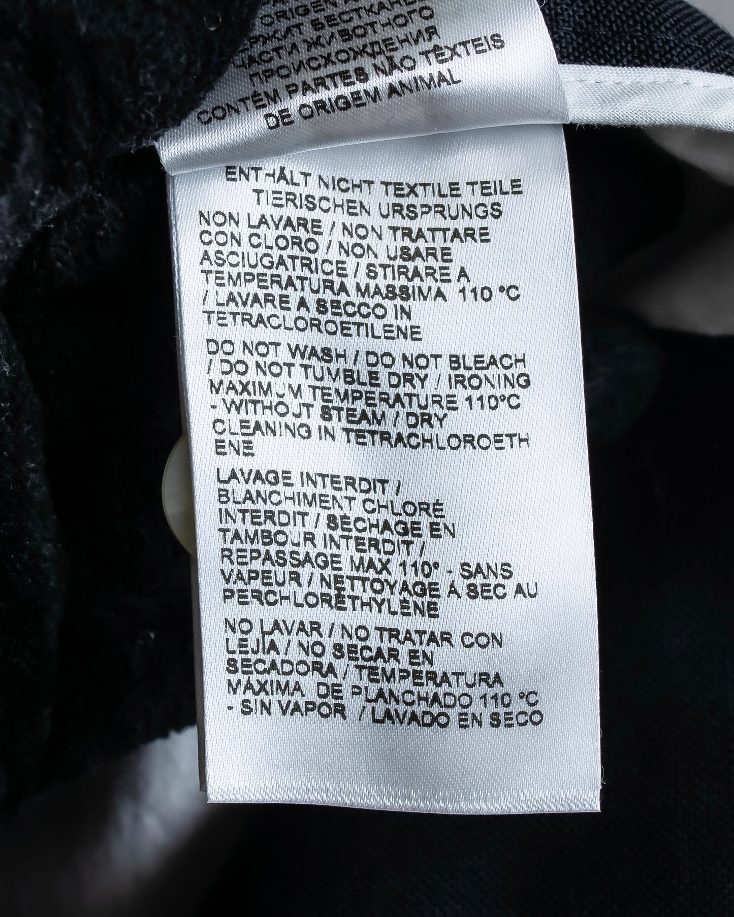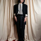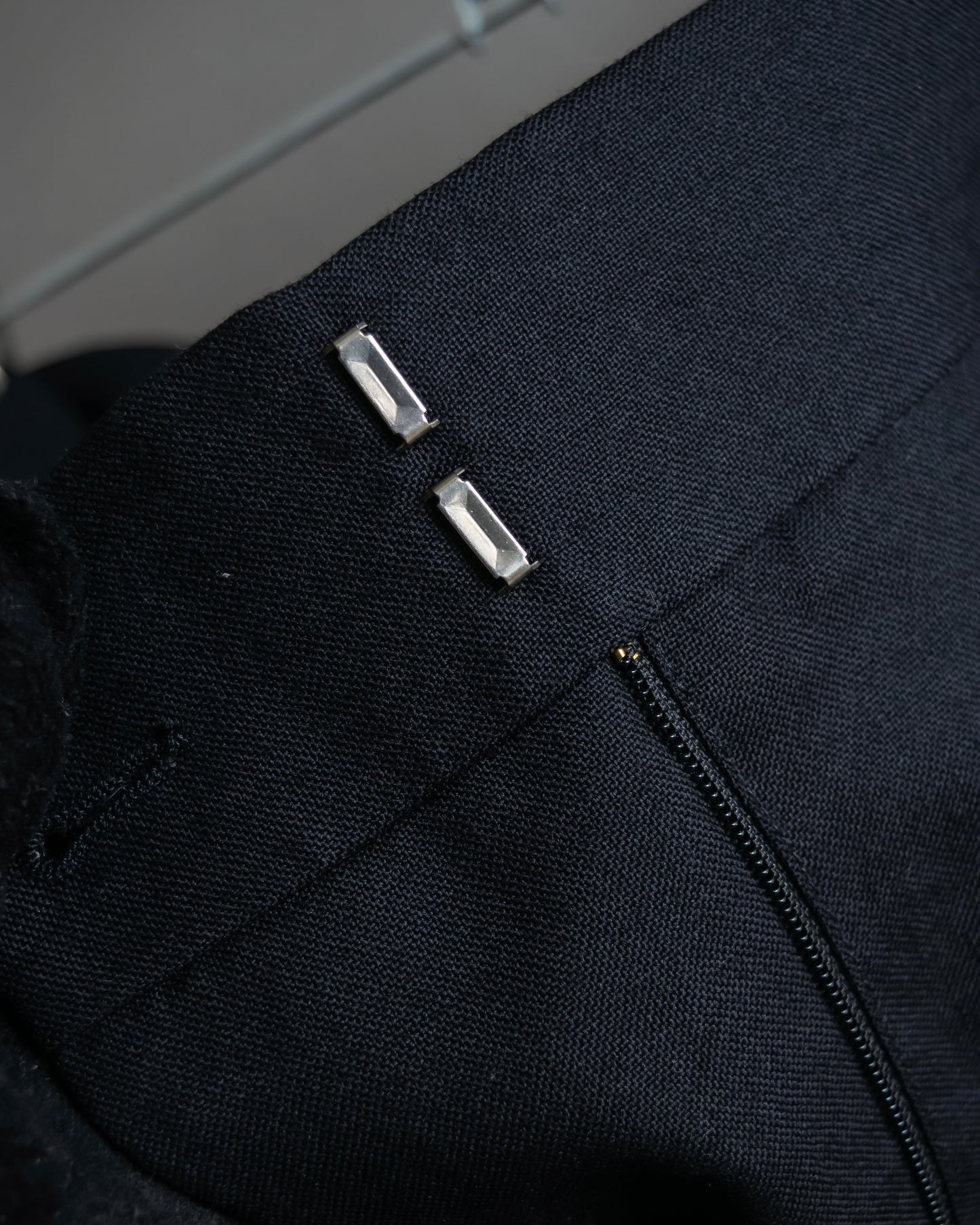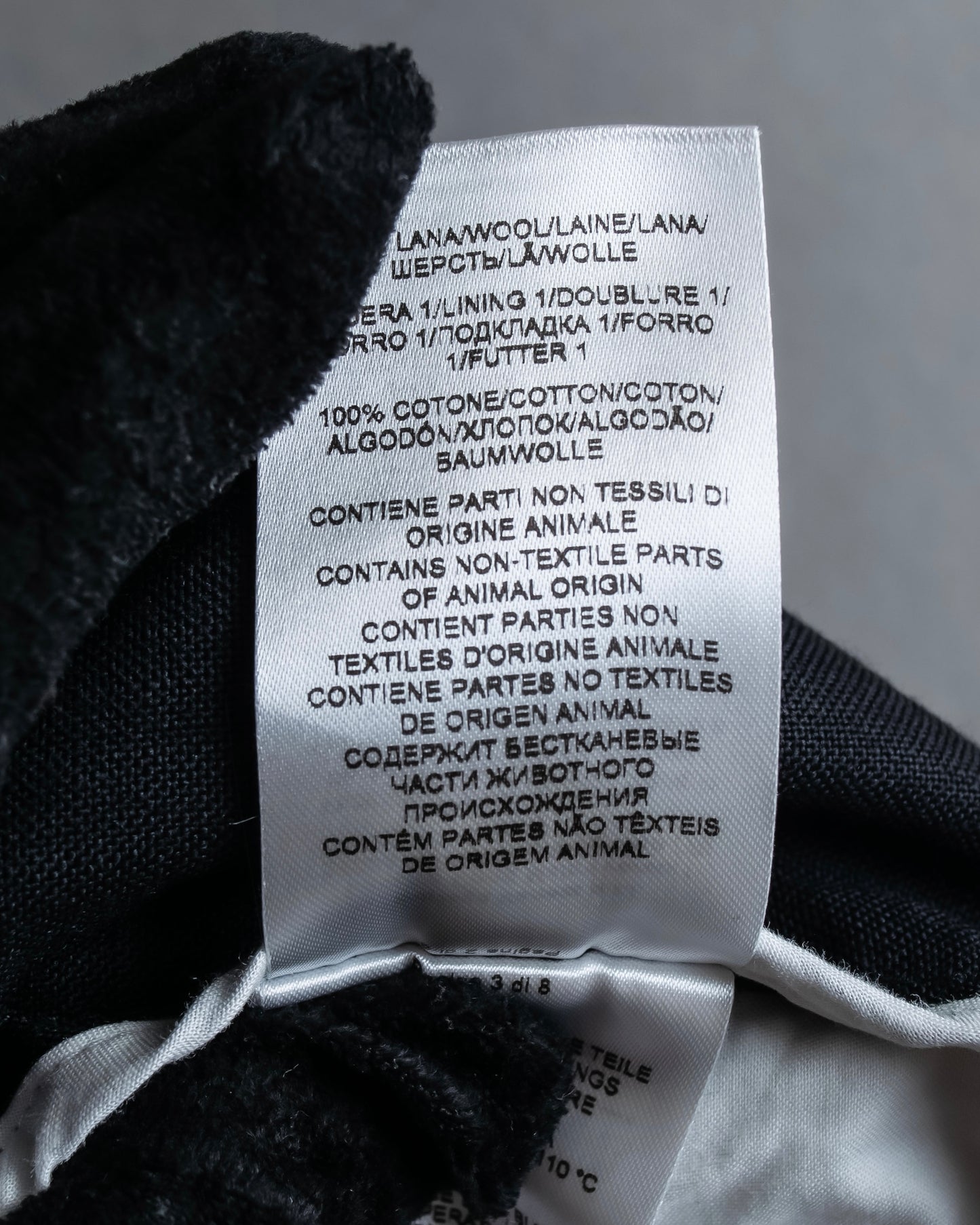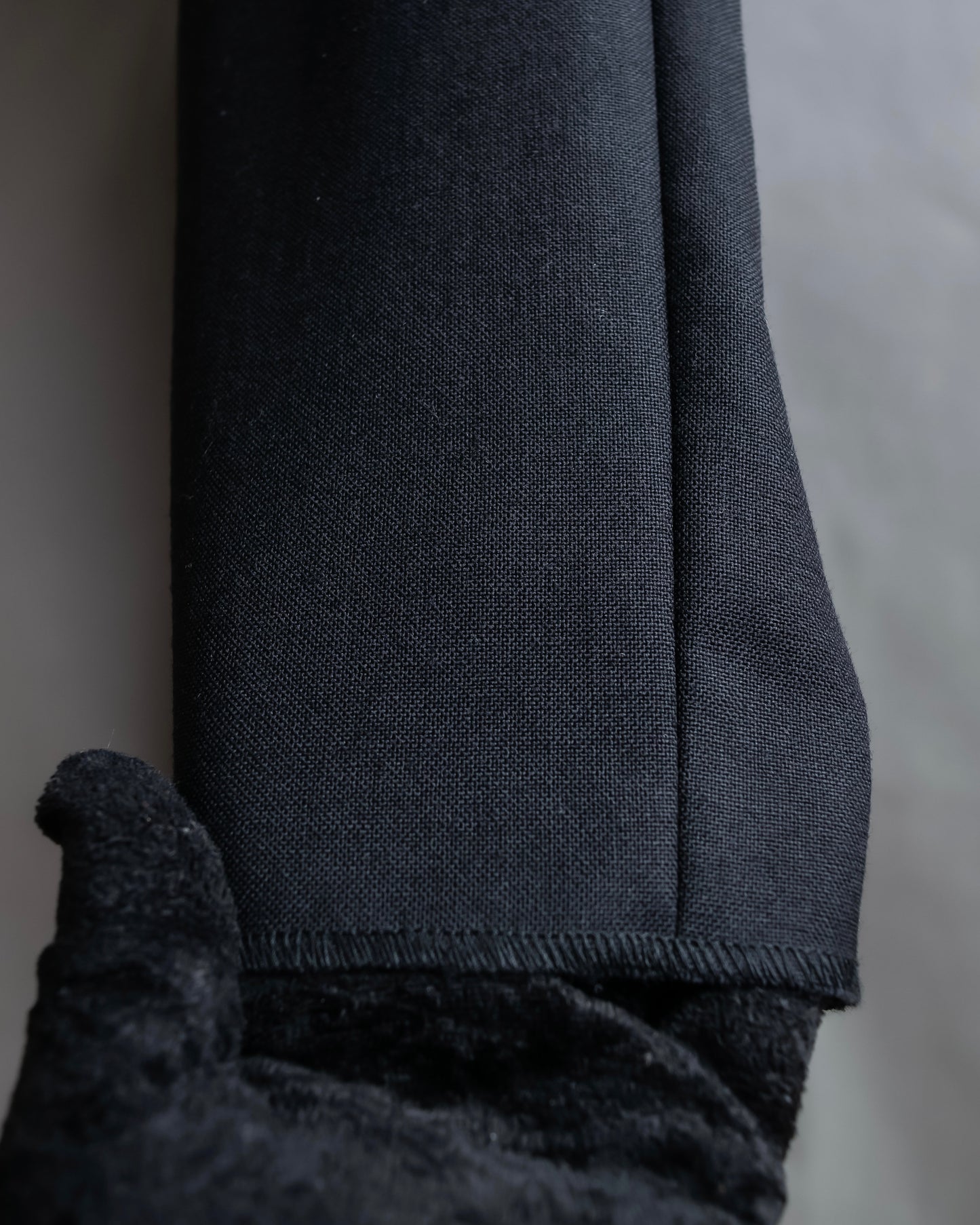 素材には、高密度に織り上げられた上質なウールベース生地を使用しており、肉感がありながらもしなやかに落ちるドレープ性を備えているため、身体の動きに寄り添うような美しい線を描いてくれる仕様となっております。内側にはパイピングが贅沢にあしらわれており、スーツブランドが仕立てるオートクチュールに匹敵するような丁寧な内装処理が、ブランドのクラフツマンシップを雄弁に物語っています。