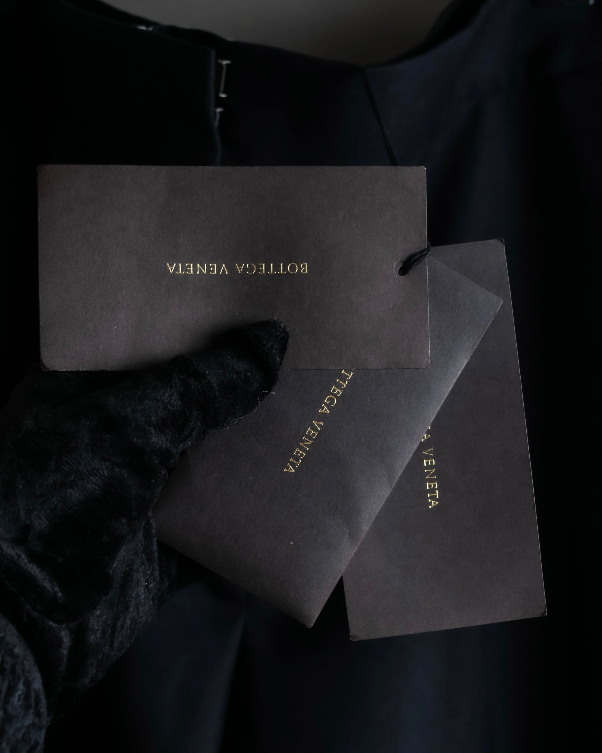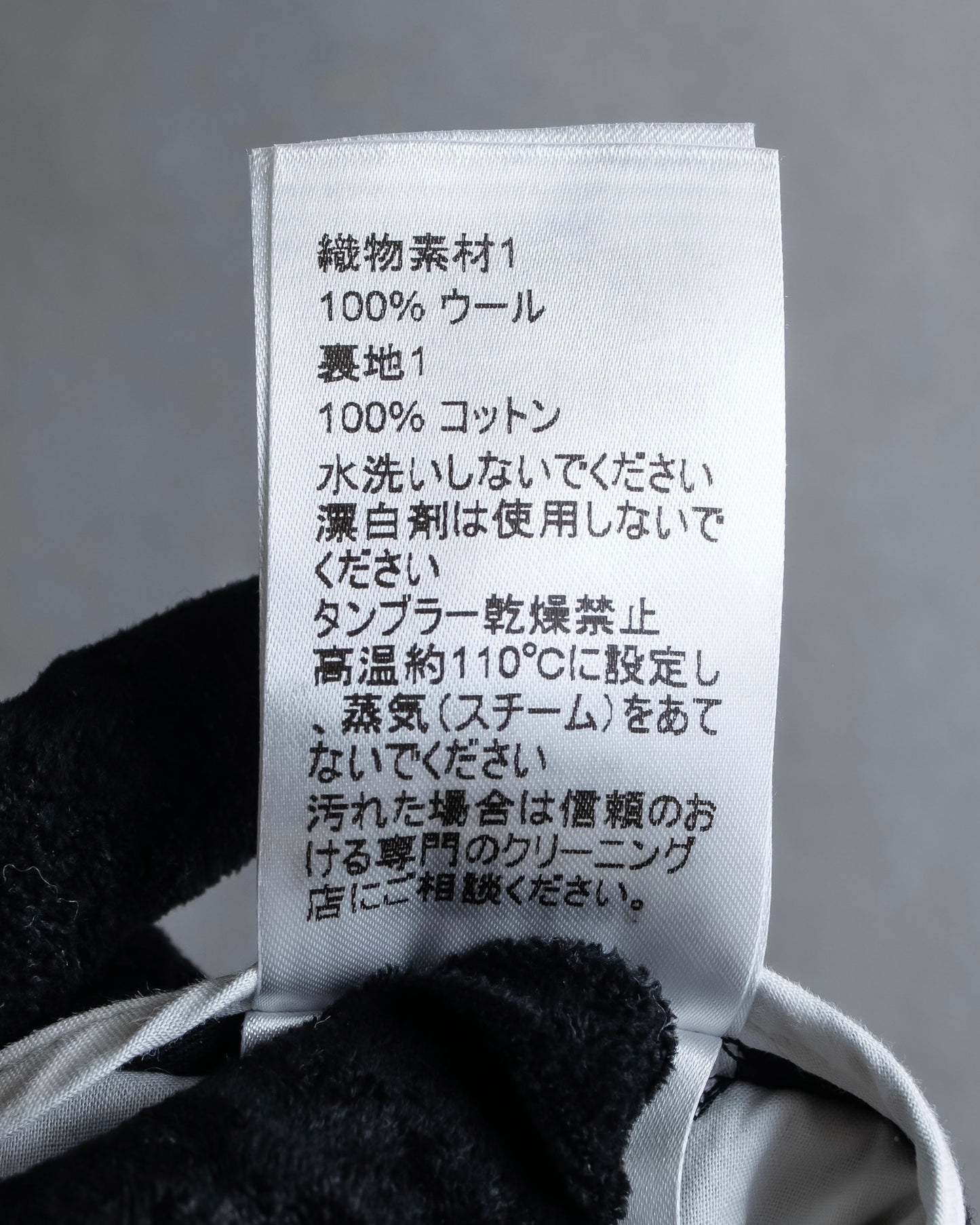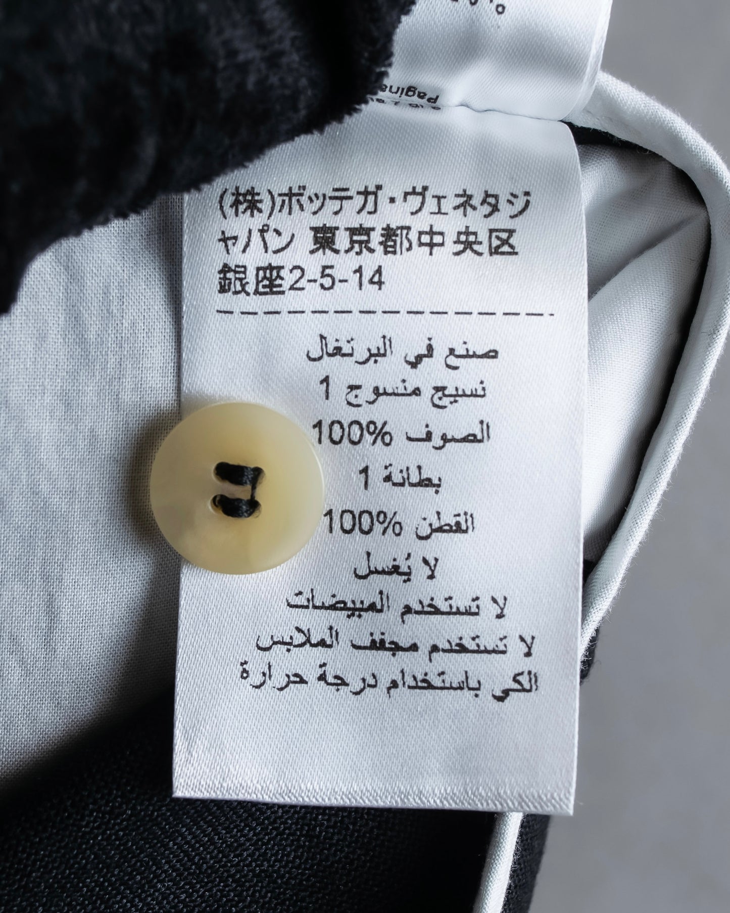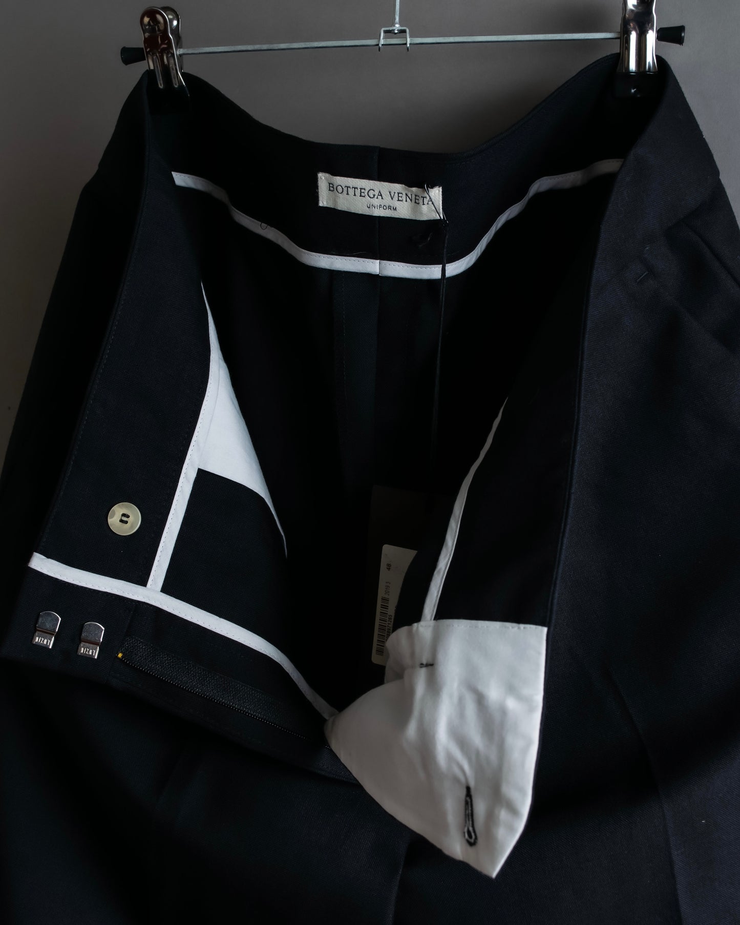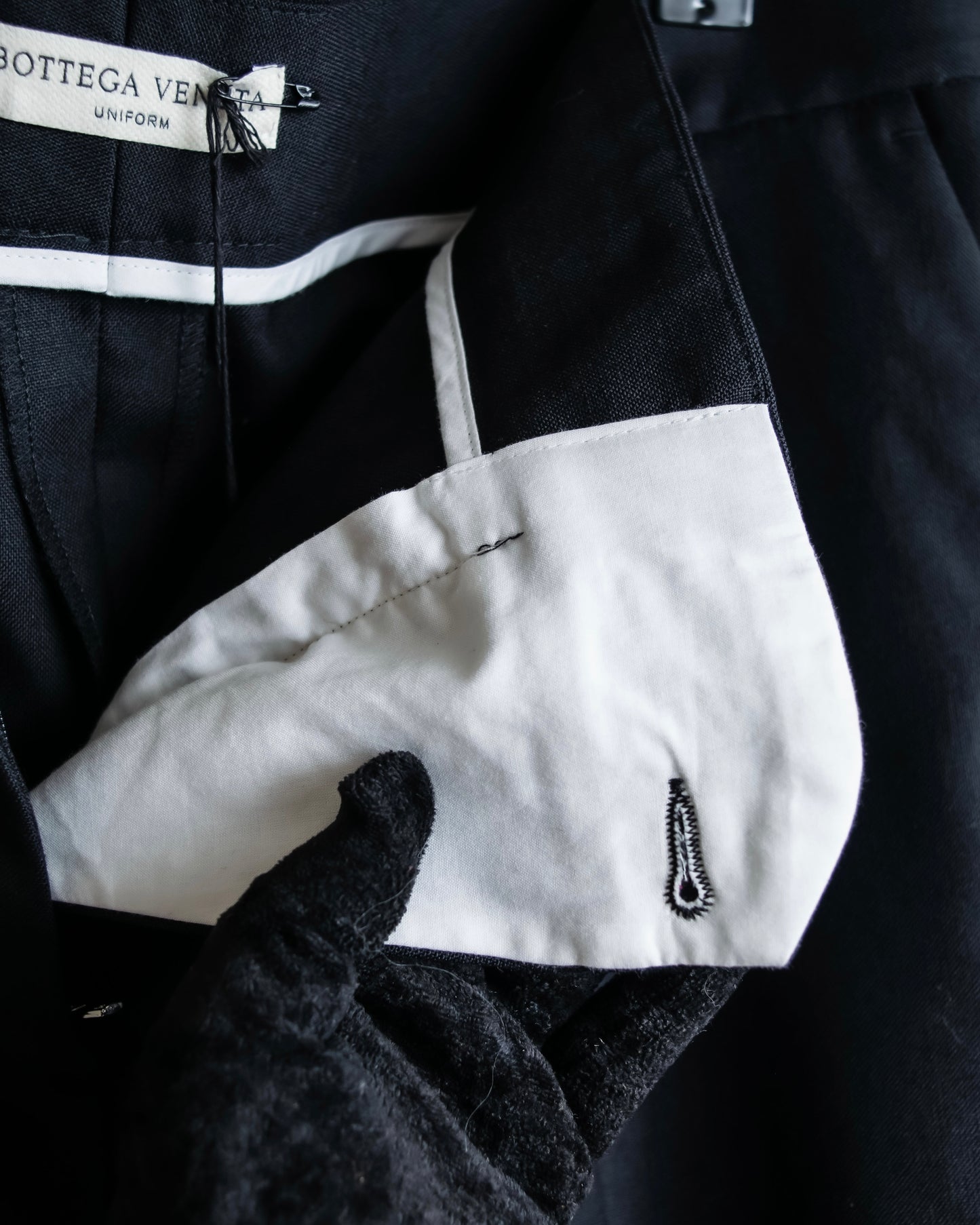 ブランドタグには“UNIFORM”の文字が添えられており、これはダニエル・リー期のボッテガ・ヴェネタにおけるワードローブ提案の一環で、日常着としての完成度を極めたベーシックピースであることの証左でもあります。モード性に傾倒することなく、静かに緊張感を纏った仕立てにこそ価値を見出せる方にこそ相応しいアイテムと言えます。
