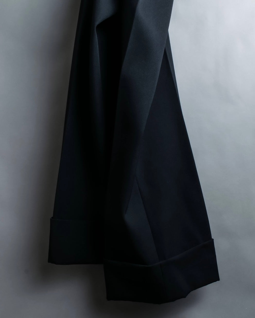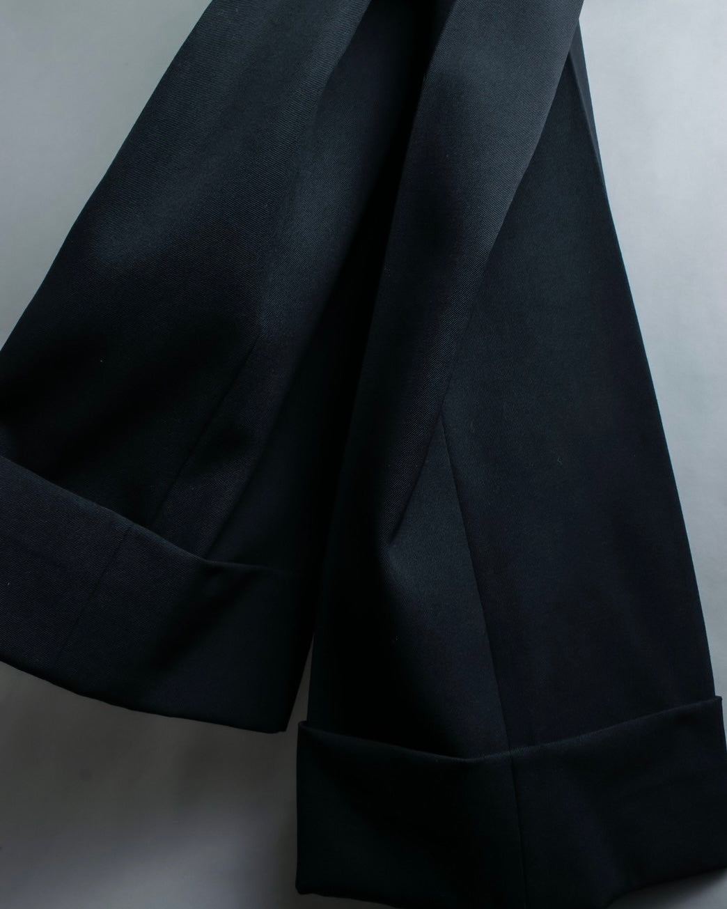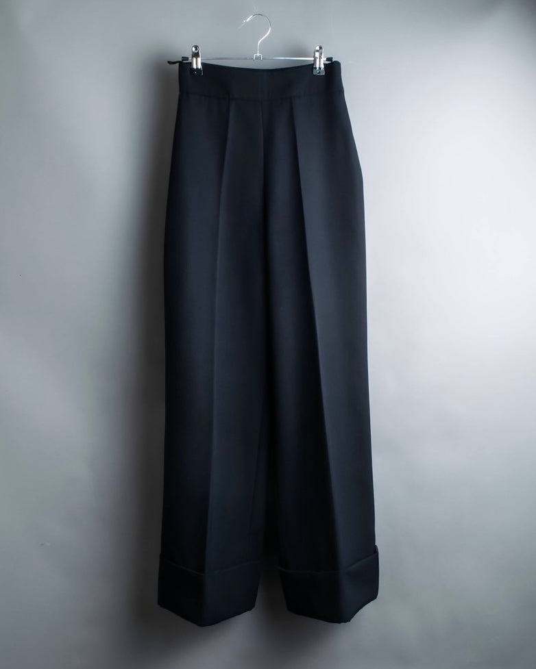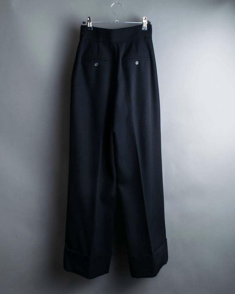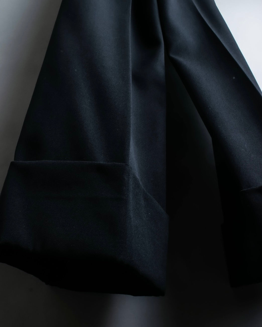 ダブル裾のスラックスとなっておりますが、折り返し幅が10cmと通常5cm程のものと比べて太く設計とする事でフォーマルからアイコニックな表情へとデザインしている点が魅力的。