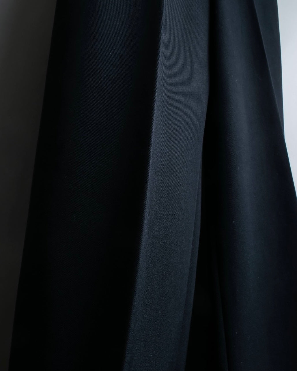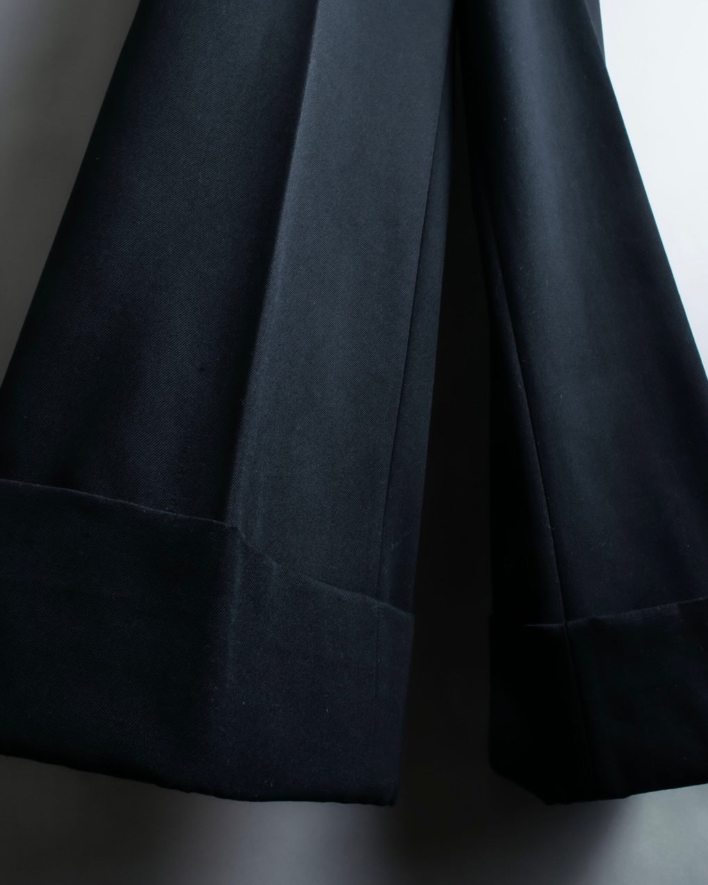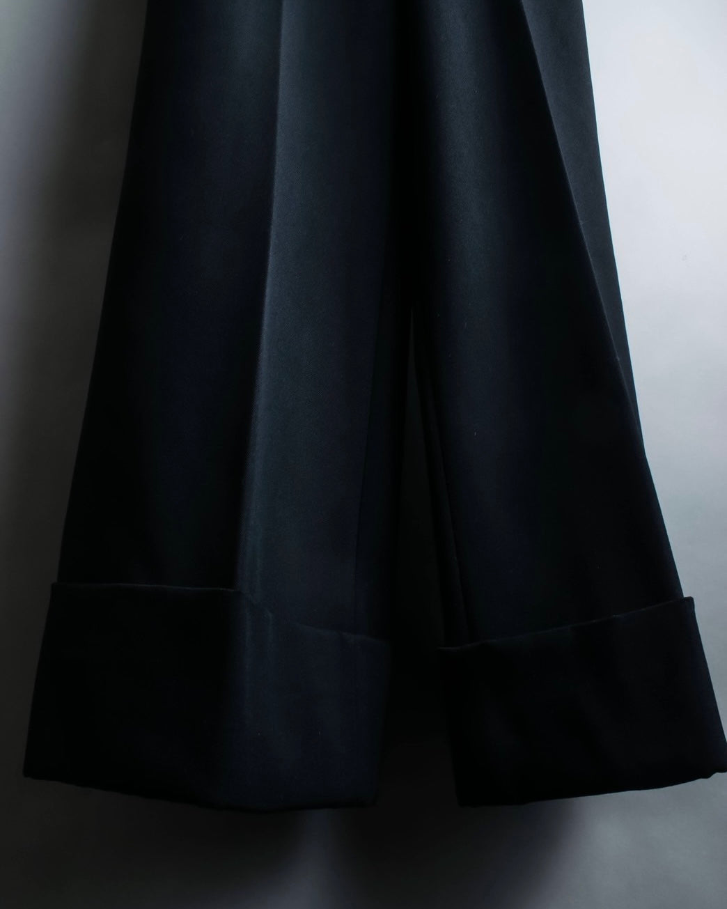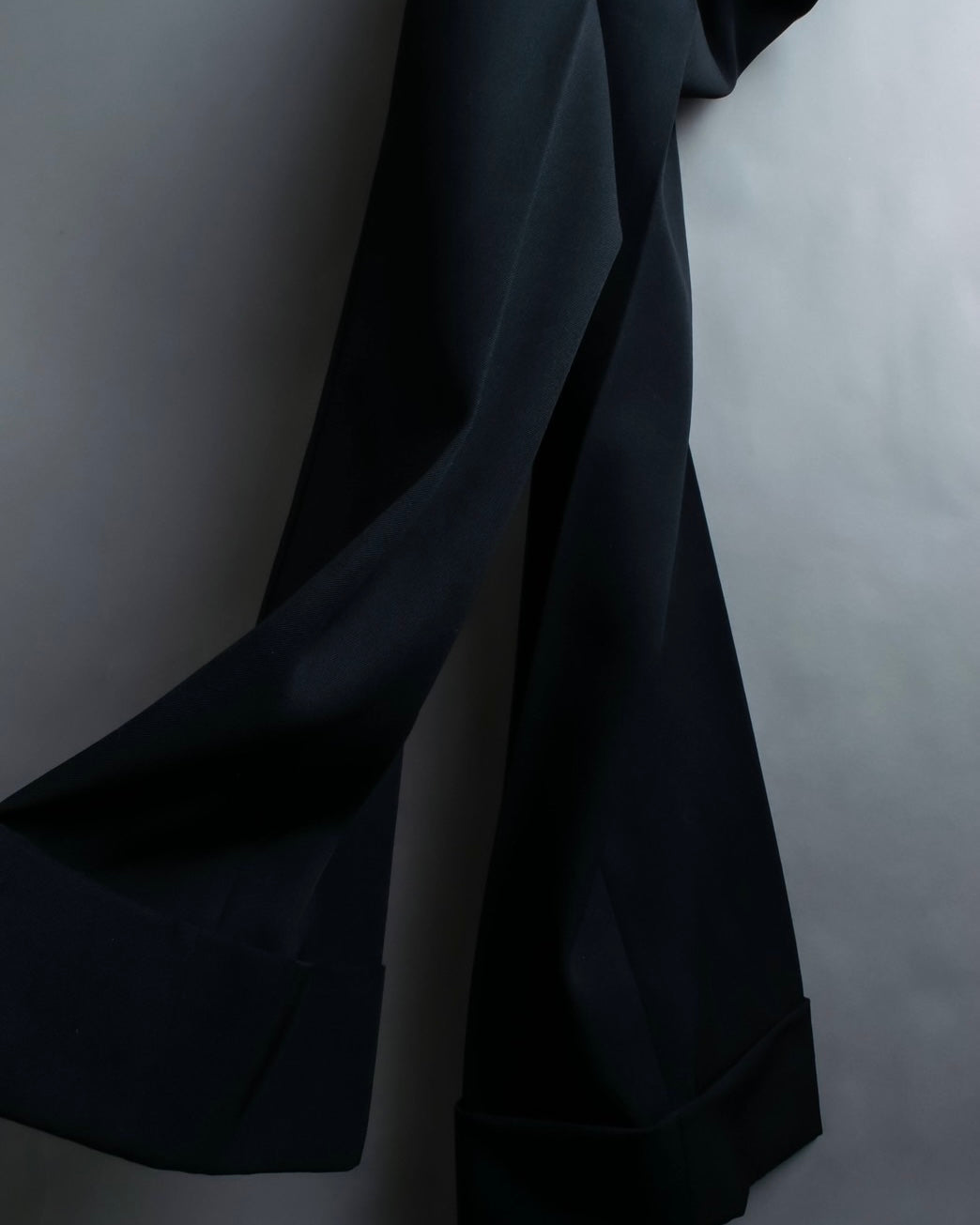 ダブル裾のスラックスとなっておりますが、折り返し幅が10cmと通常5cm程のものと比べて太く設計とする事でフォーマルからアイコニックな表情へとデザインしている点が魅力的。