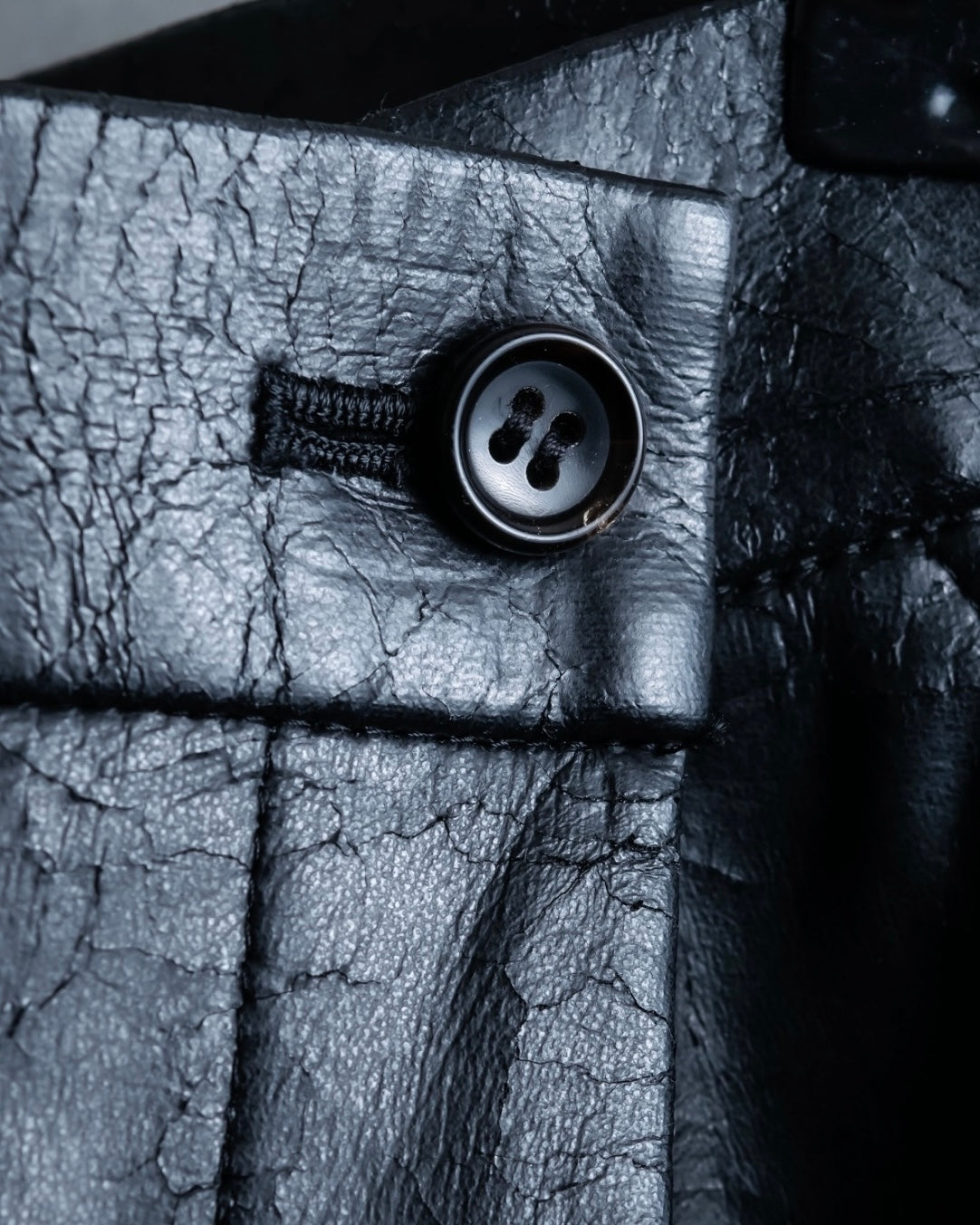 ハリと柔らかさのあるクラック調のフェイクレザーを用いており、それらをラップスカートに落とし込んだ逸品となっております。