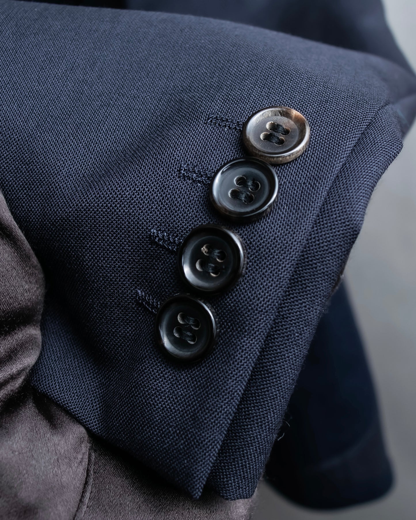 程良くゆとりのあるサイジングで、小ぶりなラペルとの対象的なシルエットが美しく、収縮色である落ち着いた