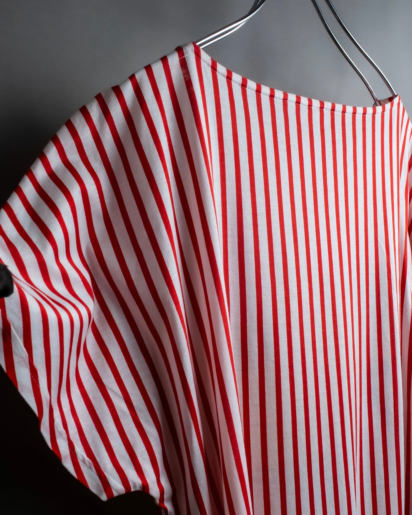 フェミニンな印象を感じさせる長めの丈感が印象的なチュニックデザインに、縦のラインを強調するスタイリッシュな印象の細めのピッチのストライプ柄が美しいこちらの逸品。