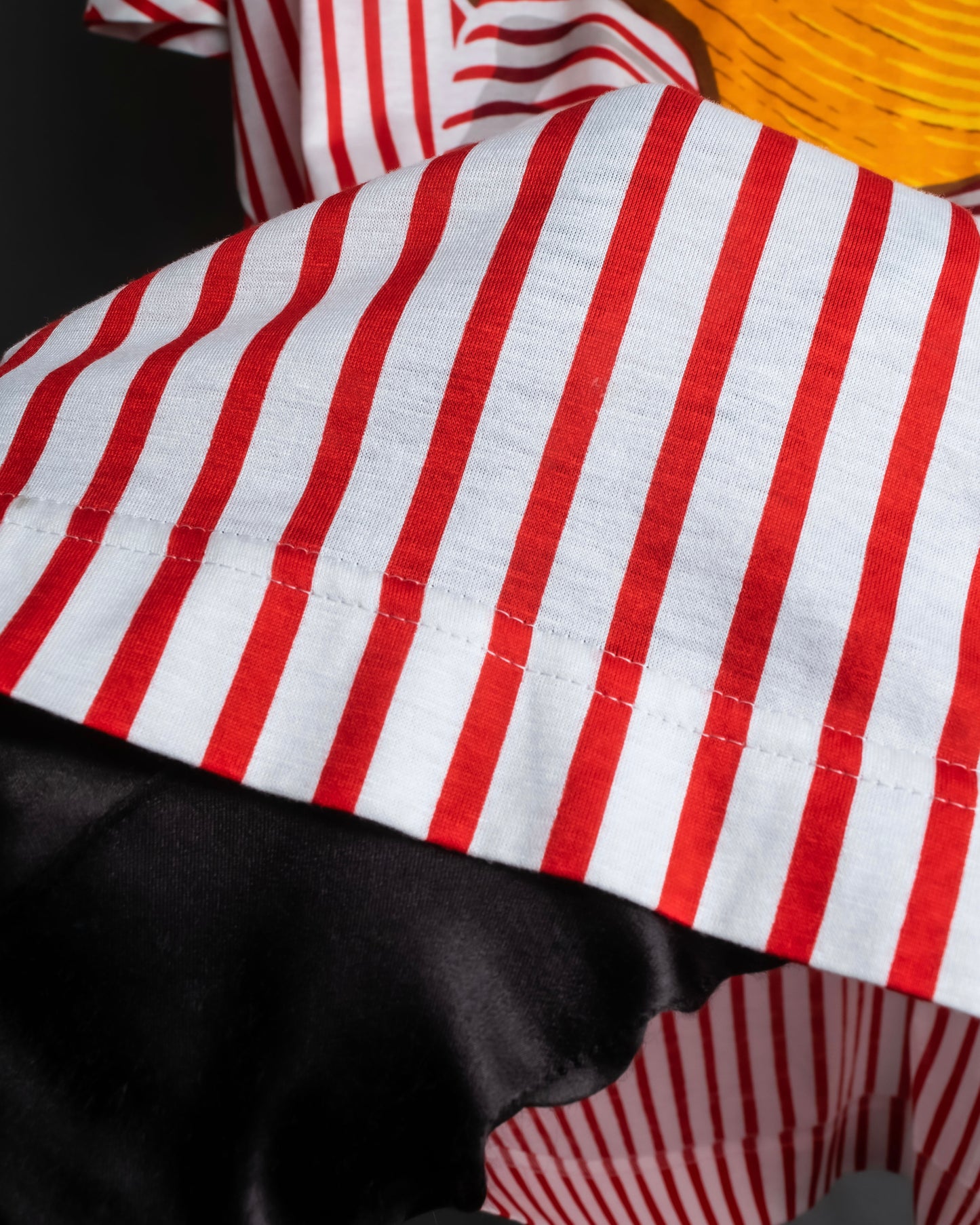 スタイリングとしては、こちらの逸品が持つビビッドな赤のお色と印象的な柄とプリントを活かした様な、細身のスラックスを合わせて頂いてシンプルな下半身に仕上げ、赤いバッグでお色味を拾って頂く、統一感を持たせたスタイリングを推奨しております。