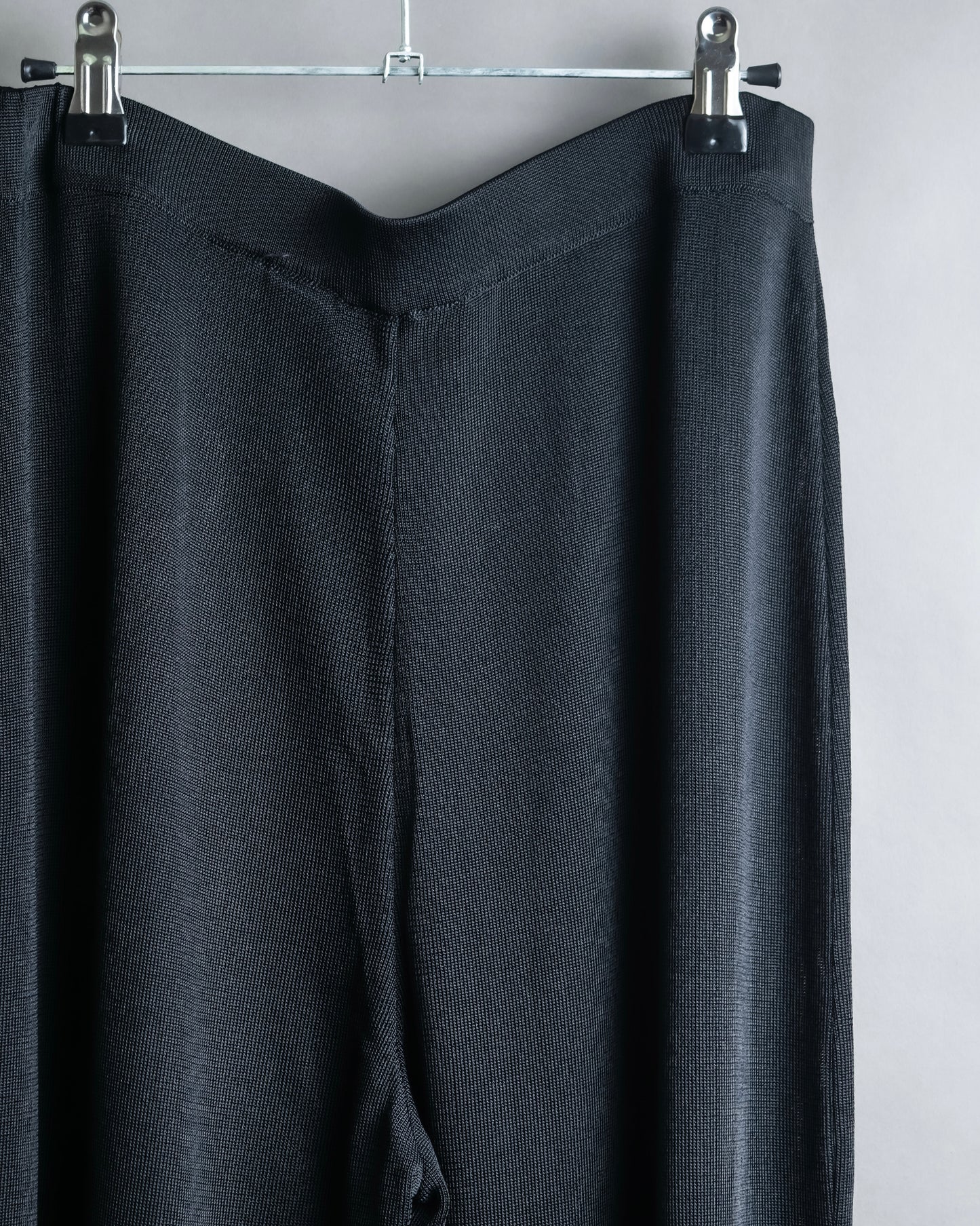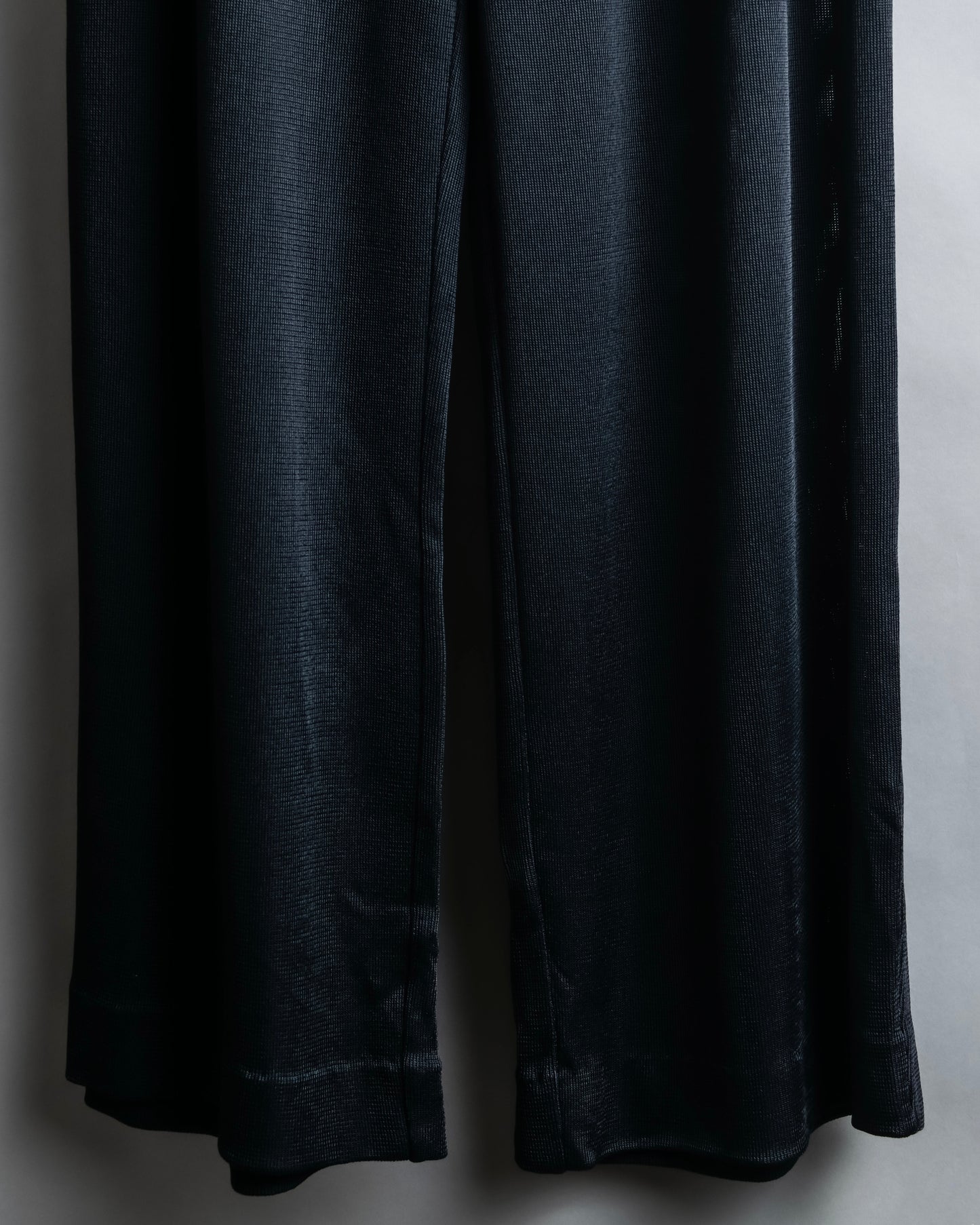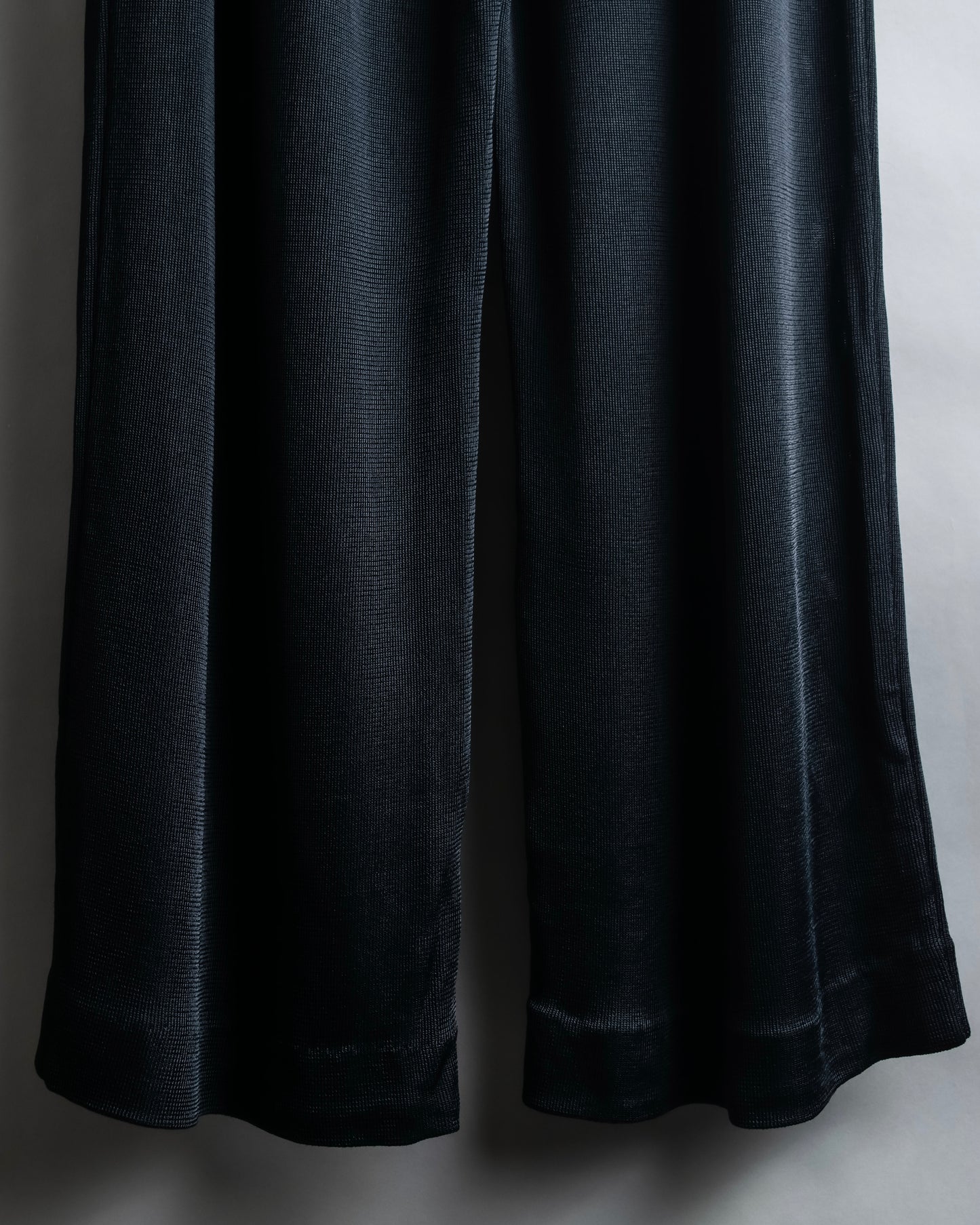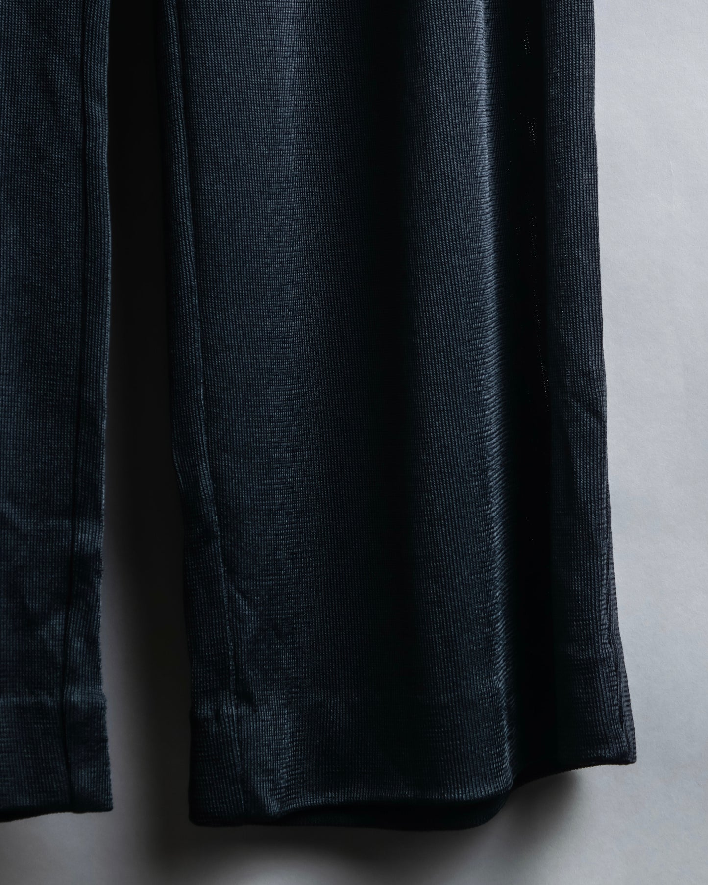 洗練されたモード感を演出することが出来るストンと落ちるワイドストレートシルエットが印象的で、ベルトレスで着用出来るイージーパンツ仕様となっている為、デイリーユースにお使い頂きやすいこちらの逸品。