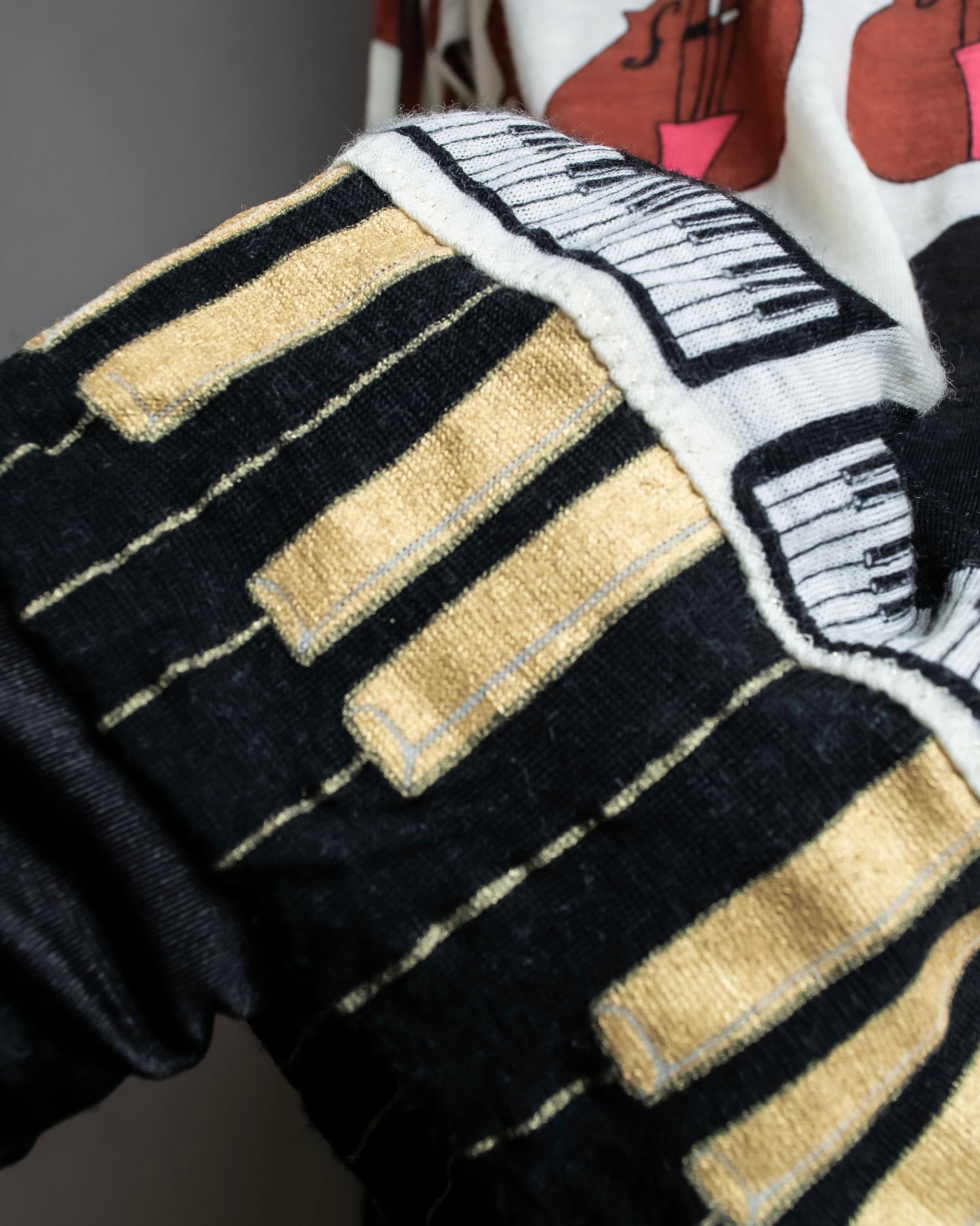 ユニークな遊び心とどこか上品でクラシカルな印象も感じさせる弦楽器、グランドピアノ、鍵盤がプリントされている特徴を持つこちらの逸品。