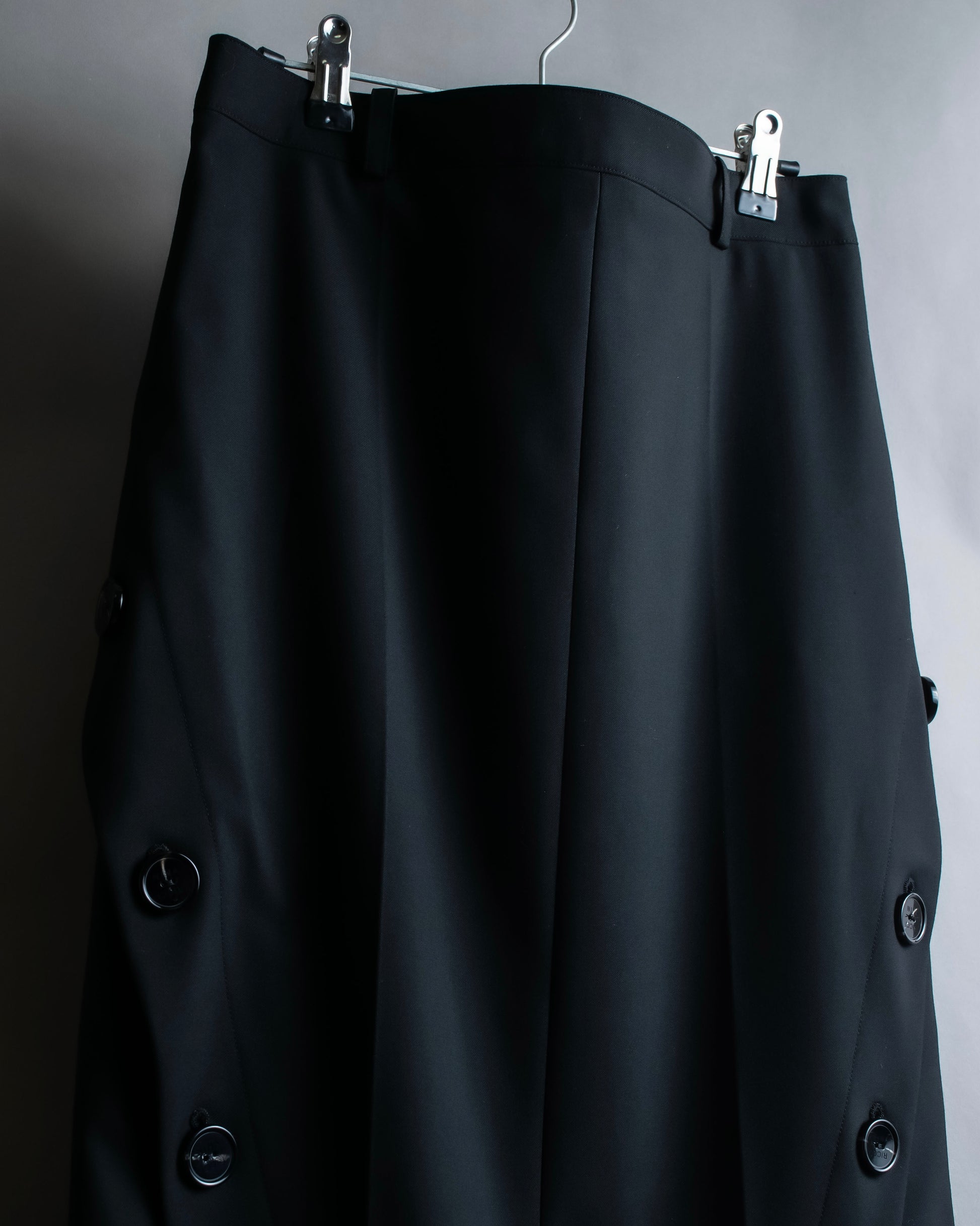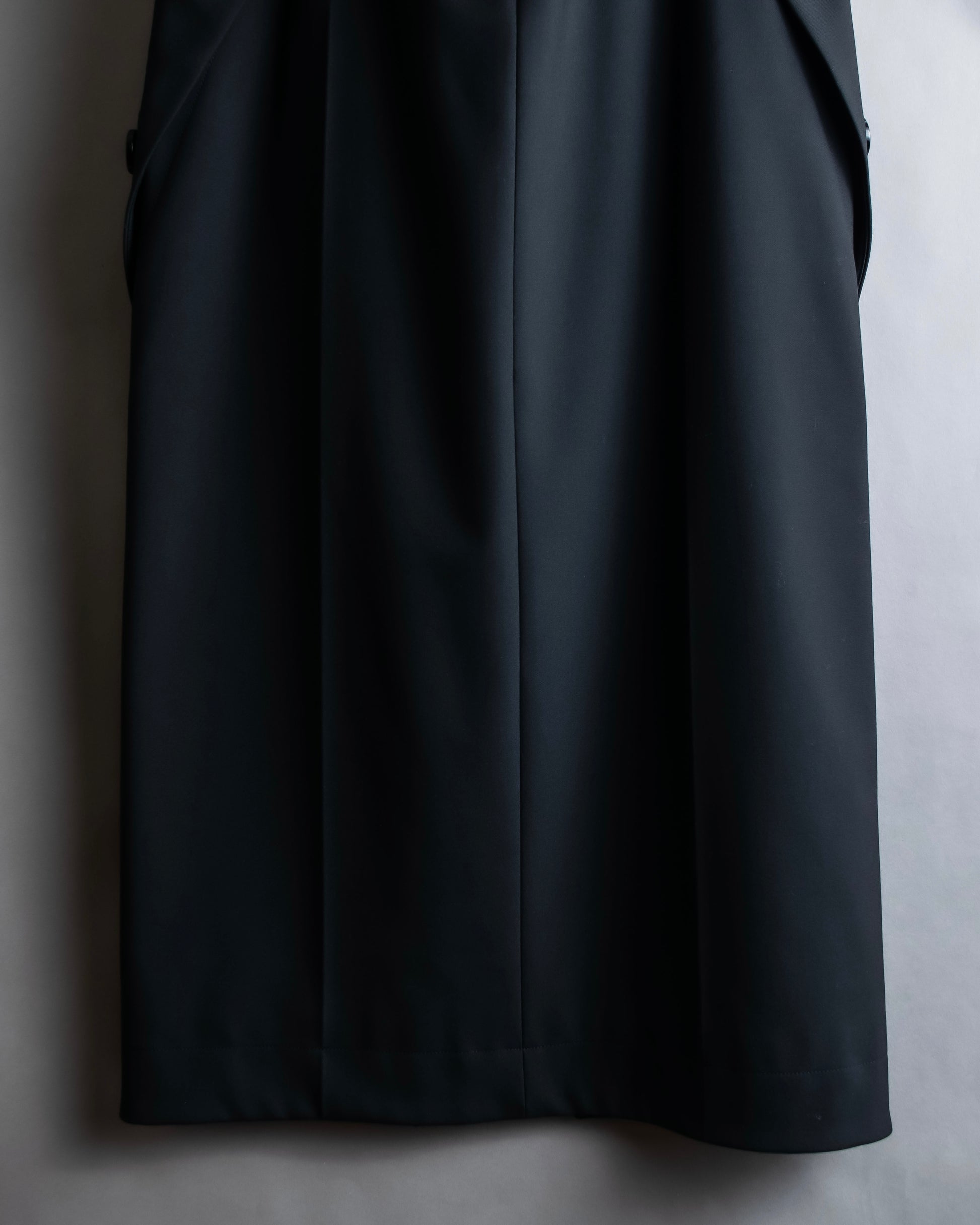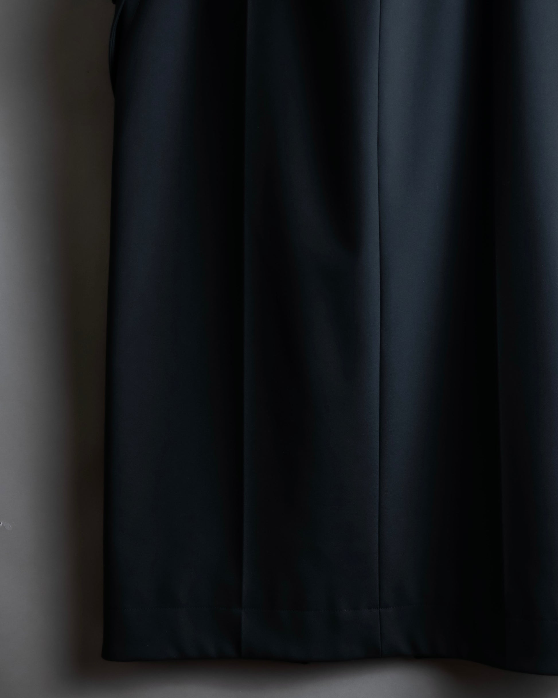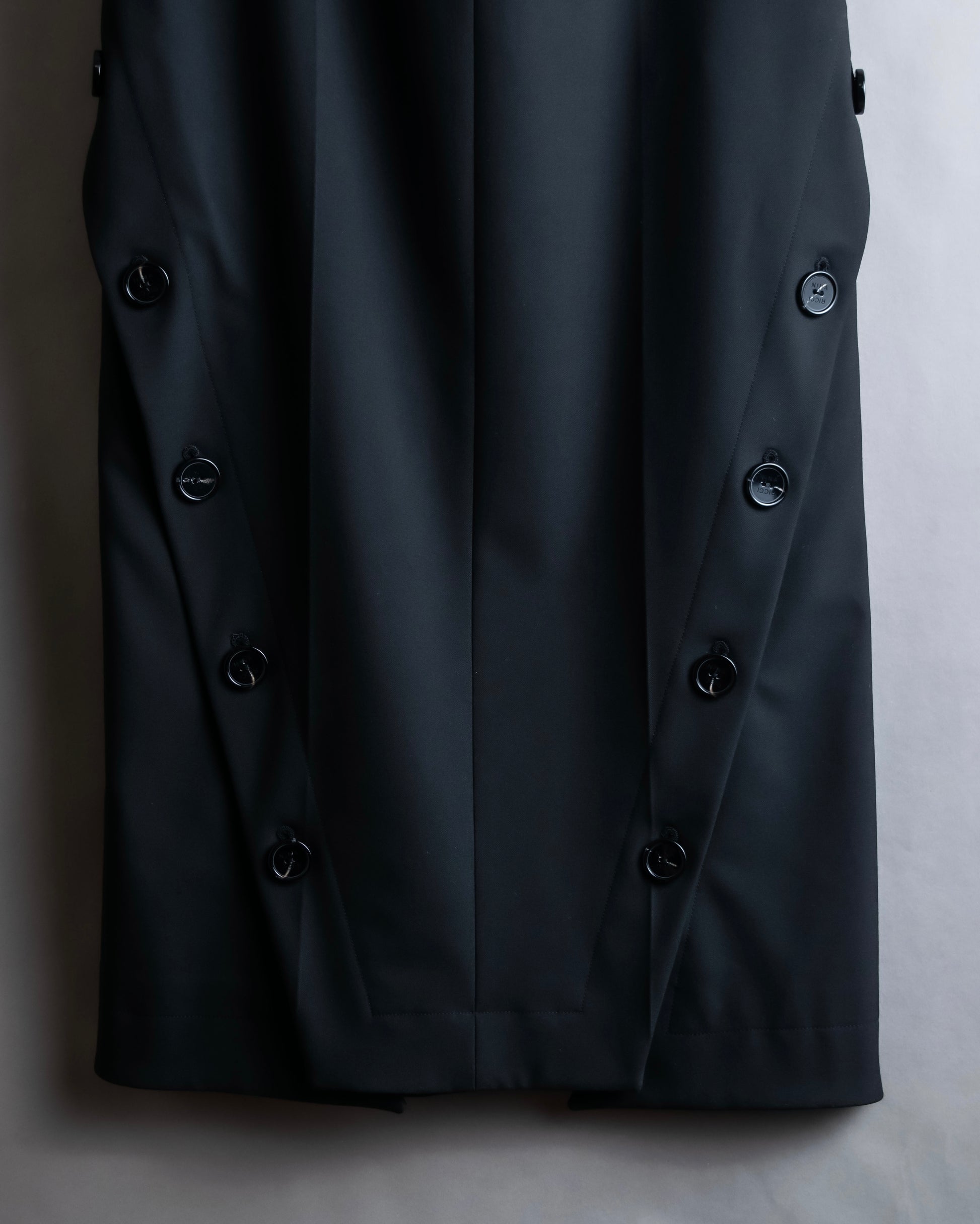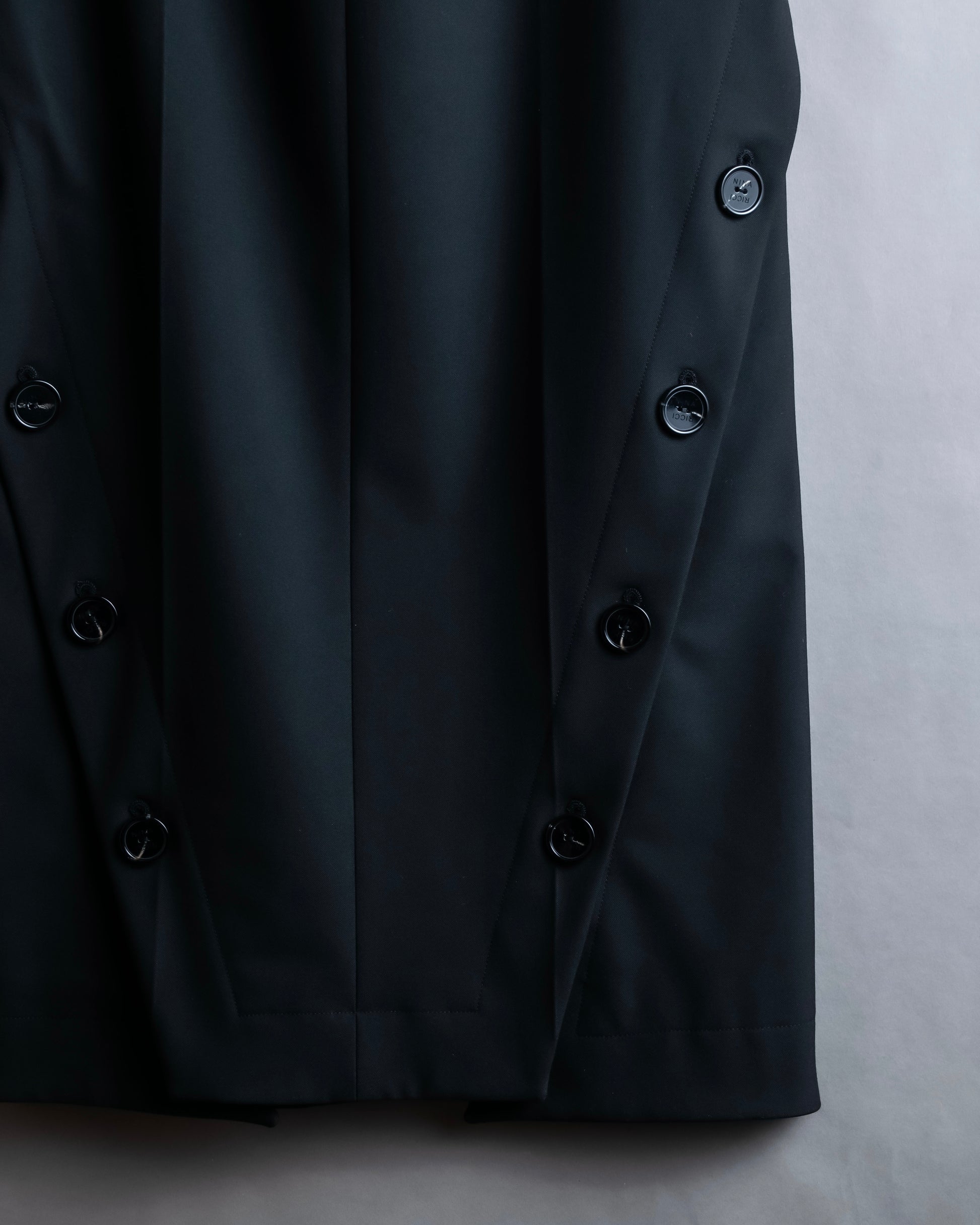 フロントから裾にかけて伸びる一本の切り替えが縦のラインを自然に強調し、同時に両サイドにあしらわれた二重のボタンディテールが立体感と奥行きをもたらしているこちらの逸品。