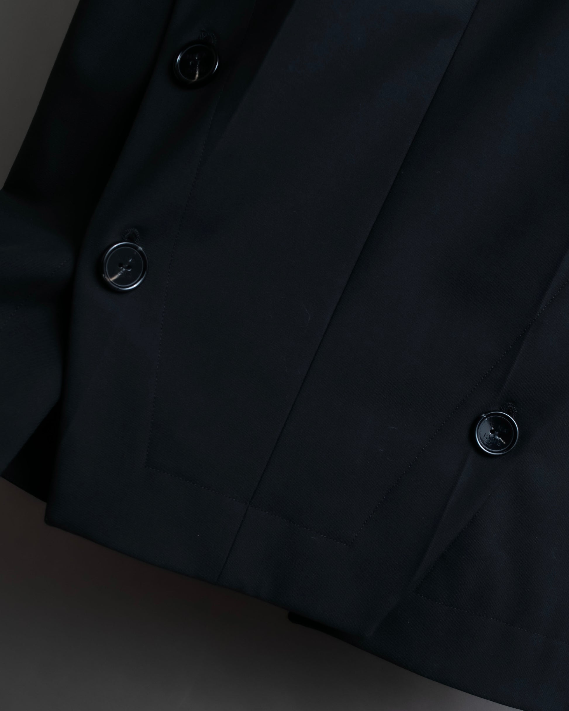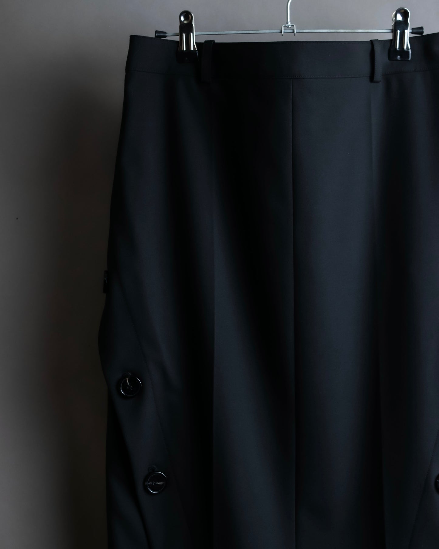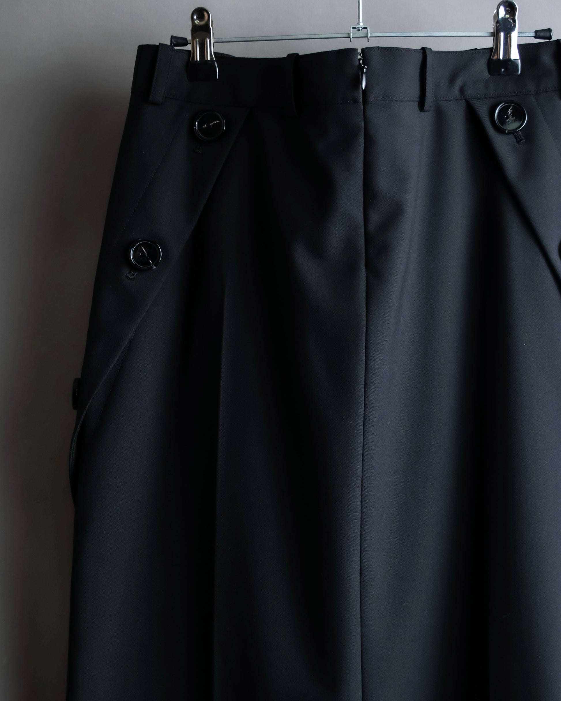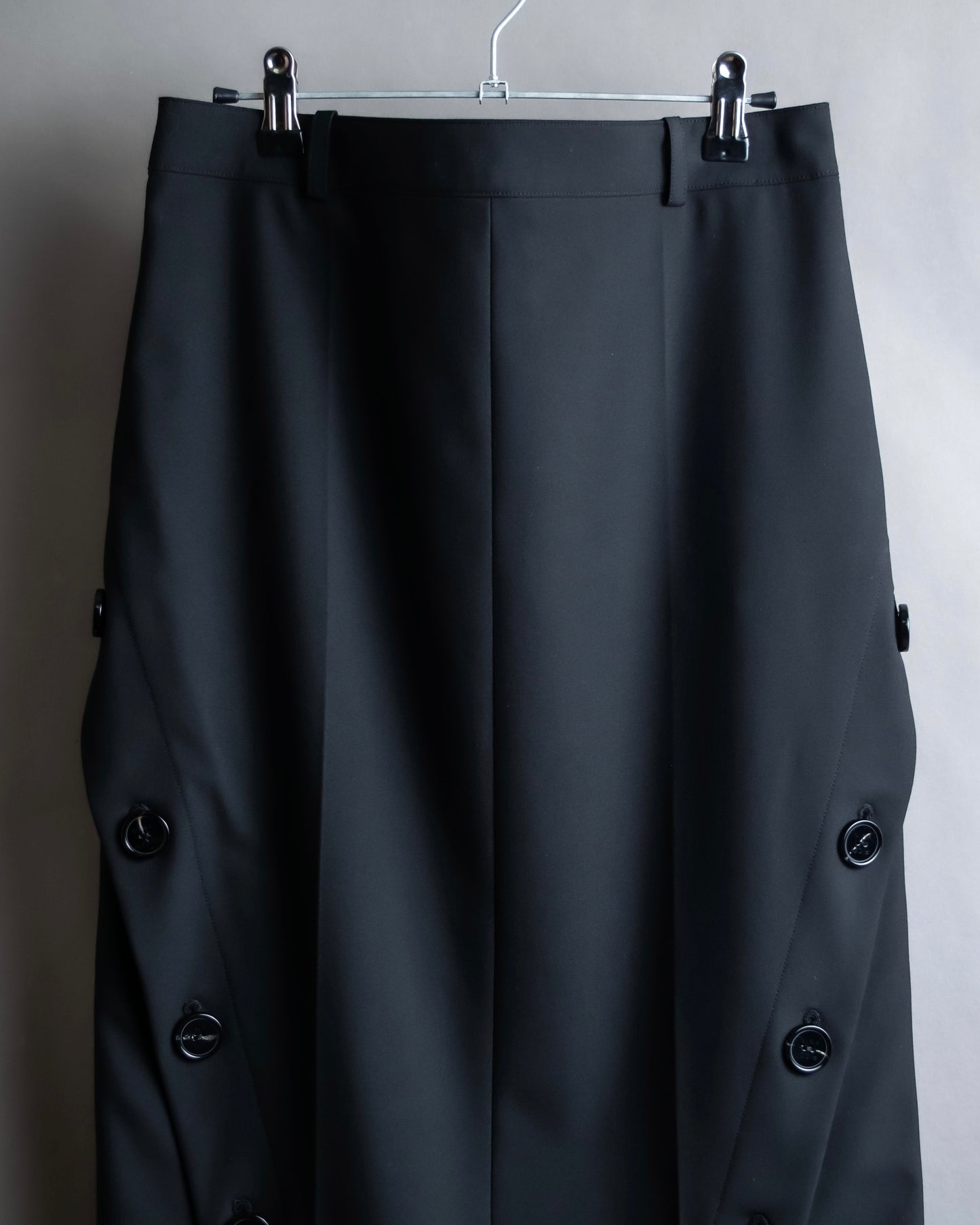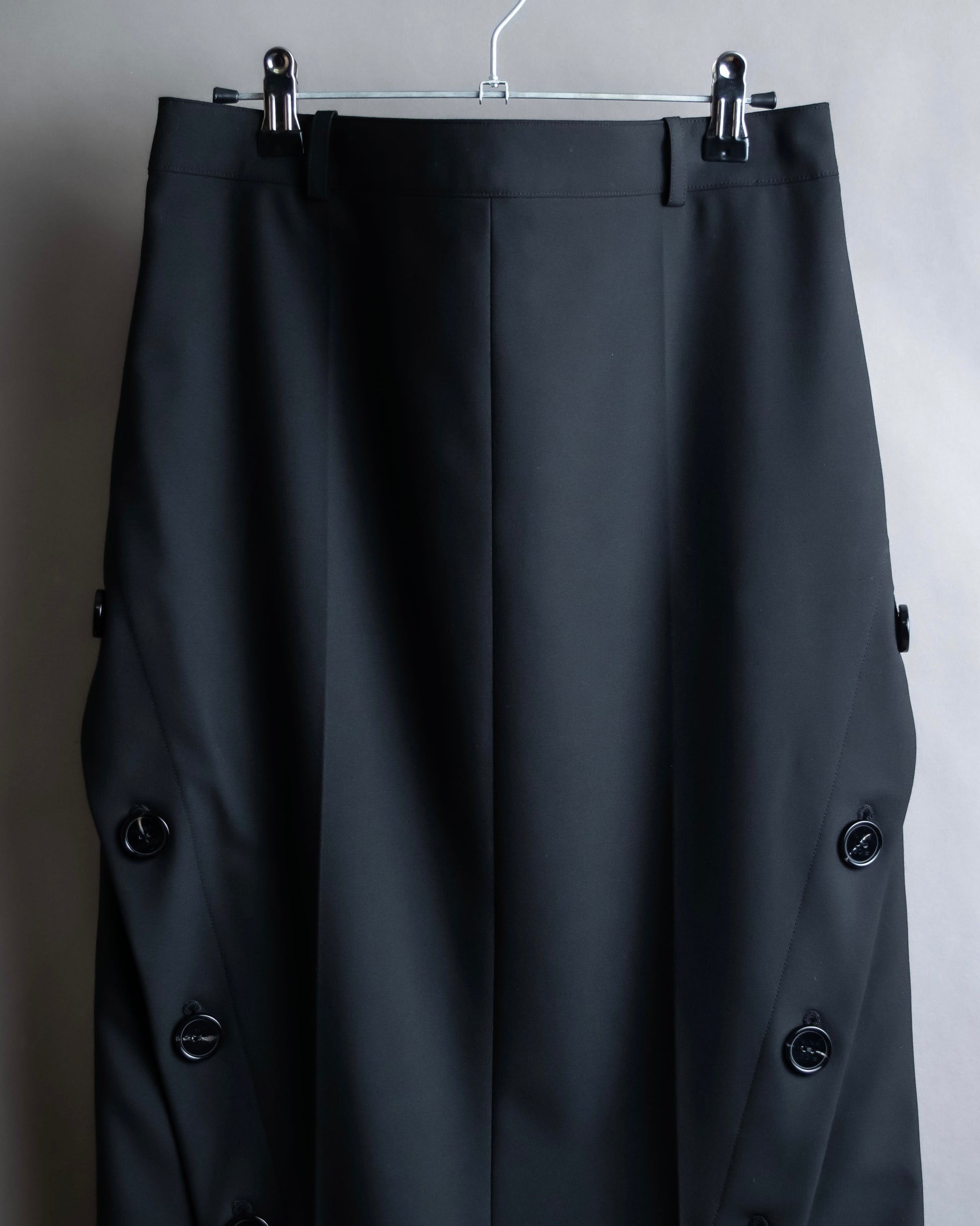 フロントから裾にかけて伸びる一本の切り替えが縦のラインを自然に強調し、同時に両サイドにあしらわれた二重のボタンディテールが立体感と奥行きをもたらしているこちらの逸品。