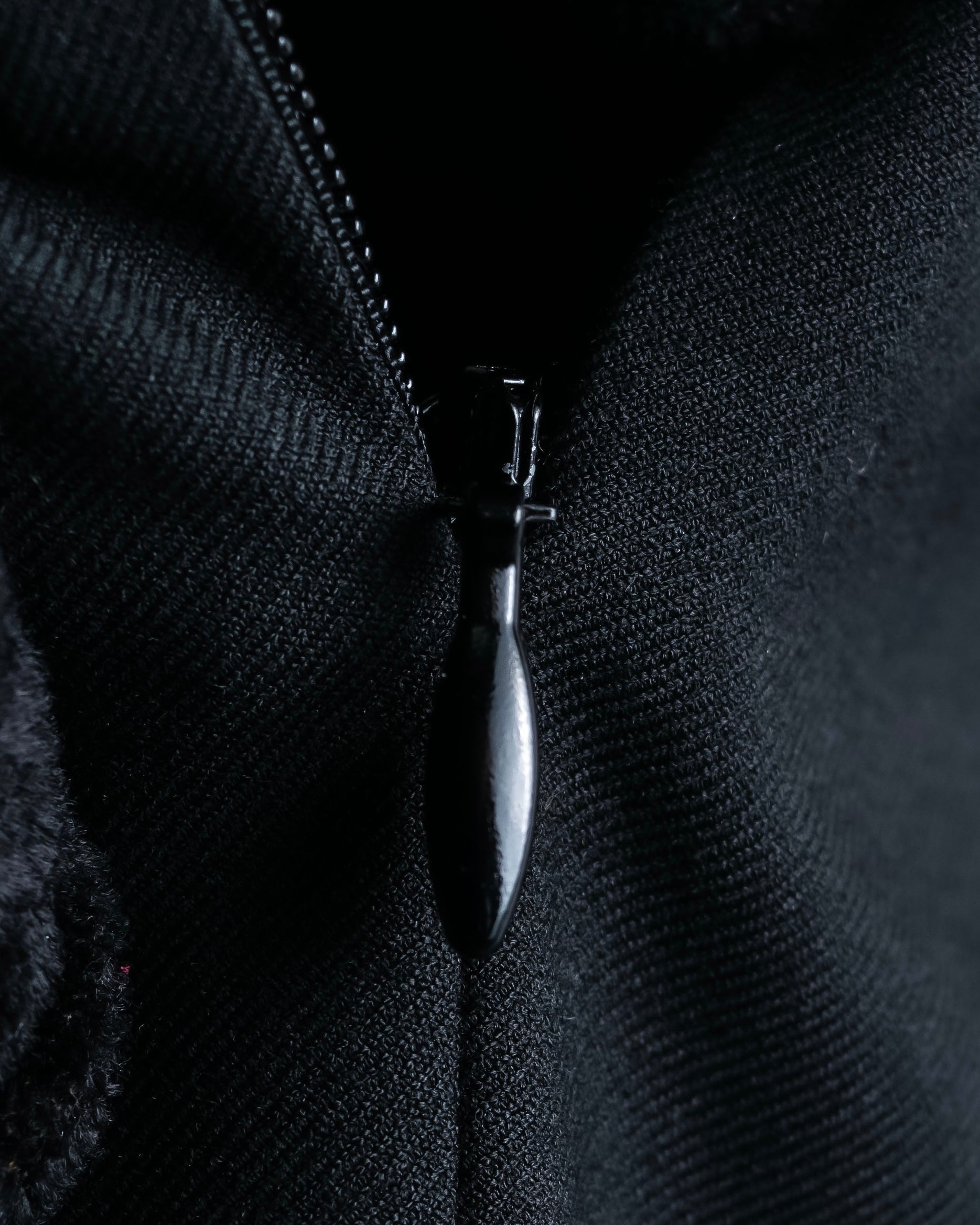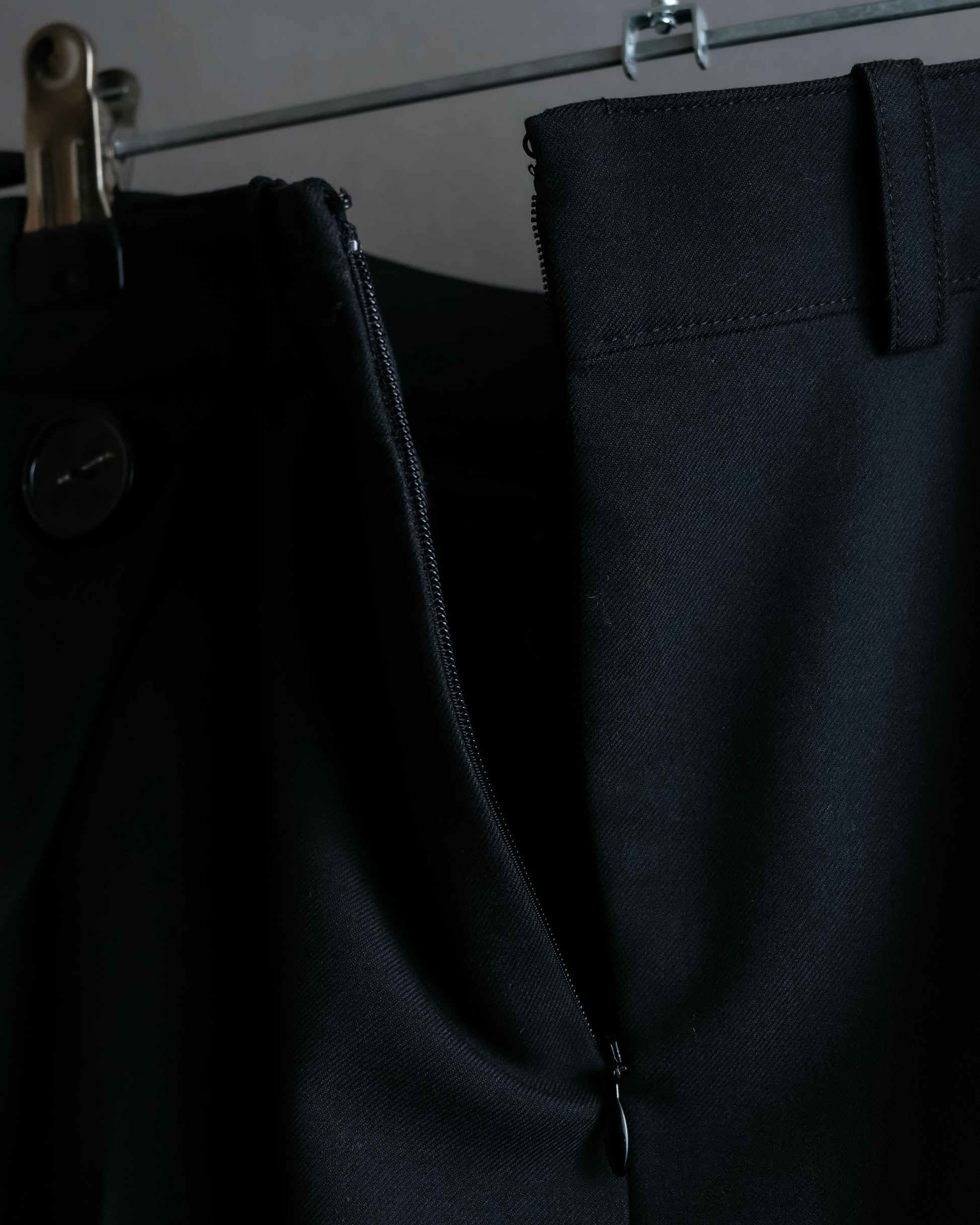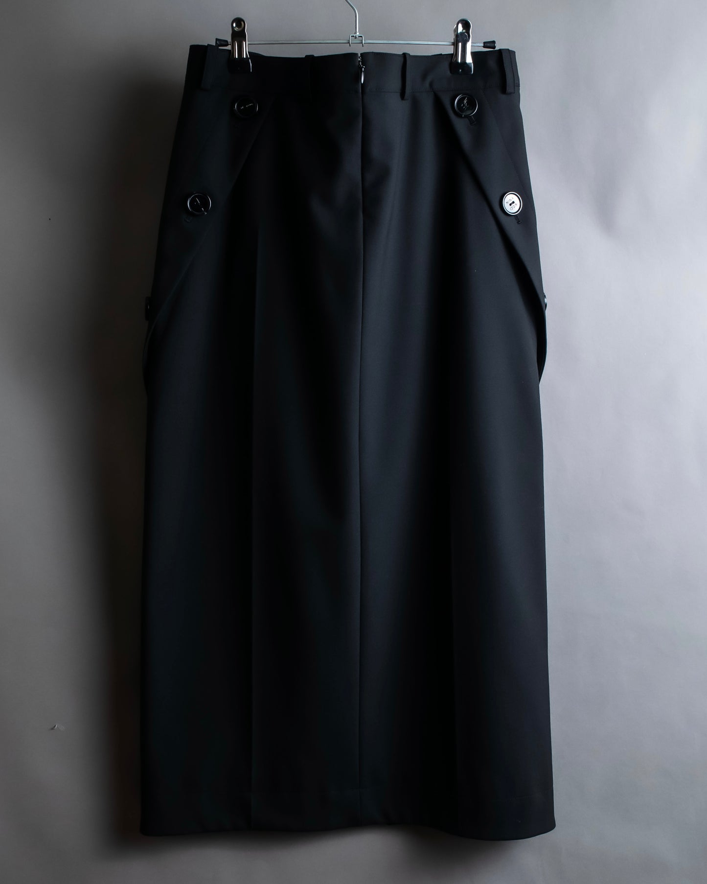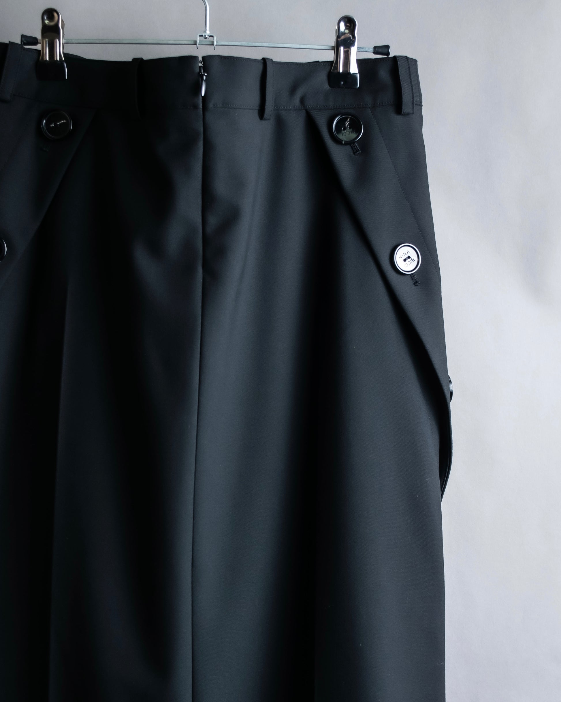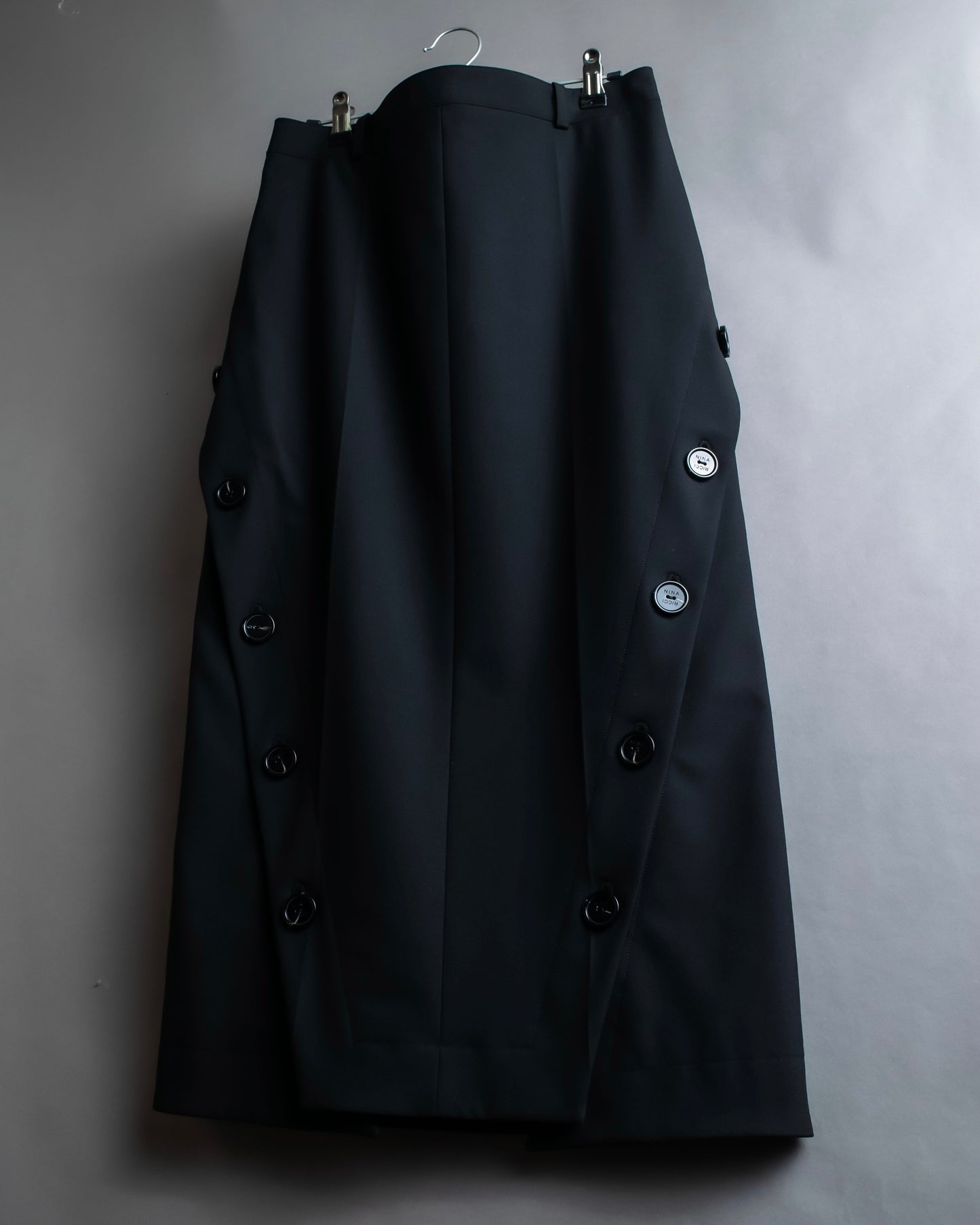 フロントから裾にかけて伸びる一本の切り替えが縦のラインを自然に強調し、同時に両サイドにあしらわれた二重のボタンディテールが立体感と奥行きをもたらしているこちらの逸品。