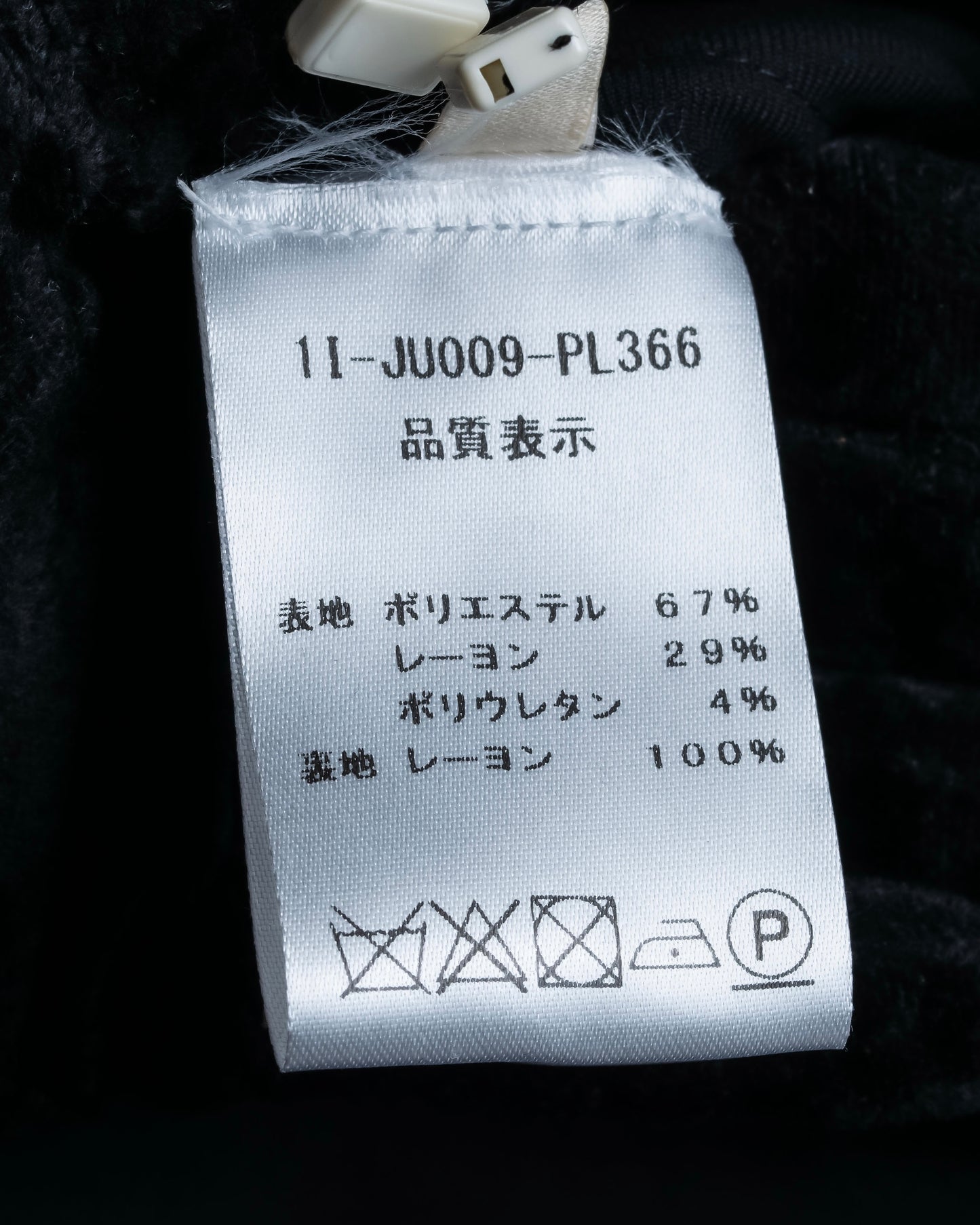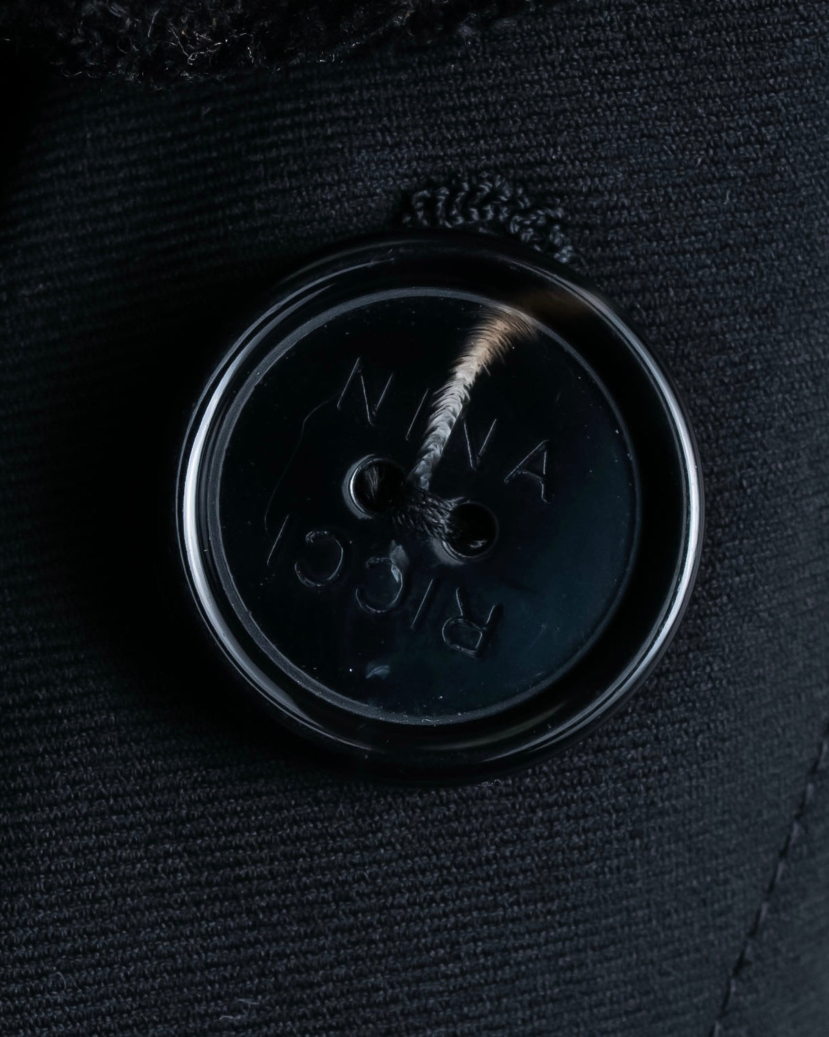 サイドに施されたくるみボタンは、やや外側へと斜めに配置されているため、静かに視線を誘導しながら、ヒップラインから裾へとかけて自然な立体感を生み出しています。そして、それぞれのボタンには”NINA RICCI”の刻印が控えめに浮かび上がっており、決して目立ちすぎないながらも確かな存在感で、さりげないブランド性を感じて頂けますね。