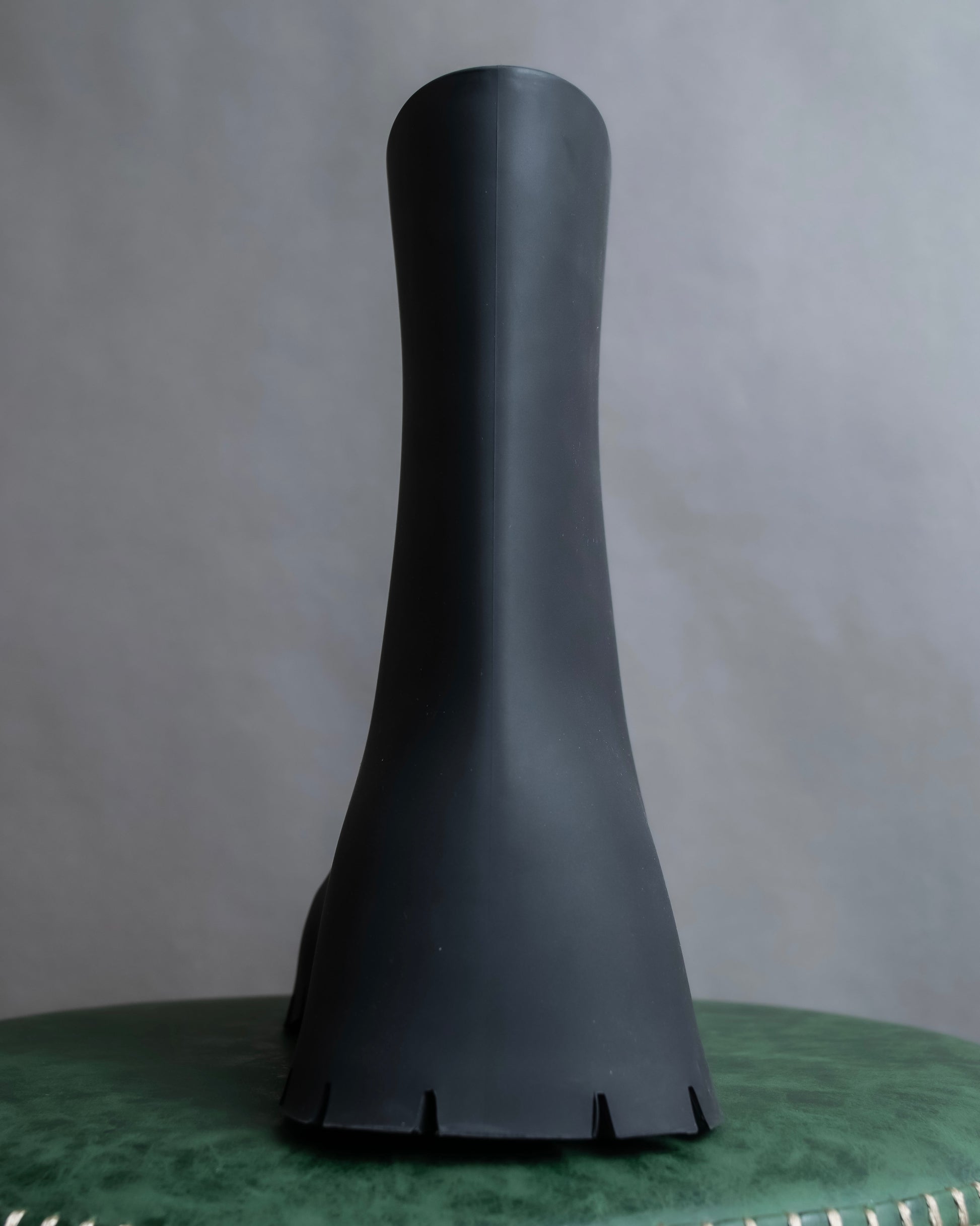 シルエットにおいては、シャープでありながらもボリューム感があり、特にトゥ部分の広がりとスクエアな形状が独特な存在感を放っている為、ミニマルながら圧倒的な個性が引き立っております。