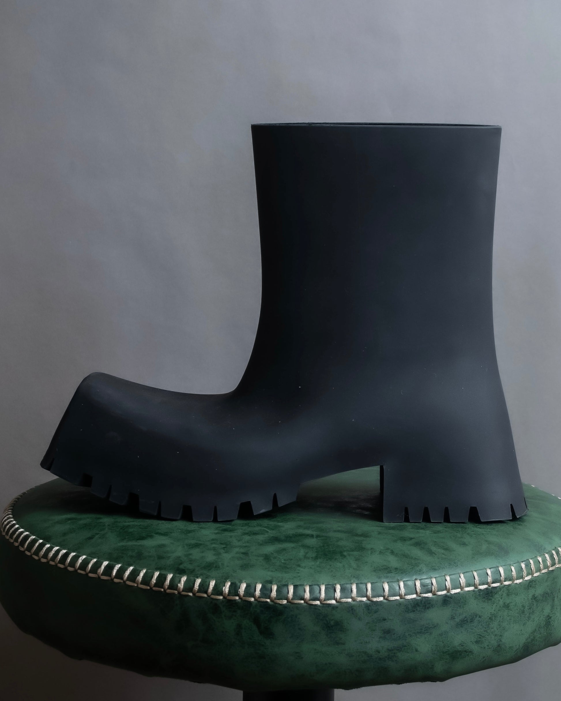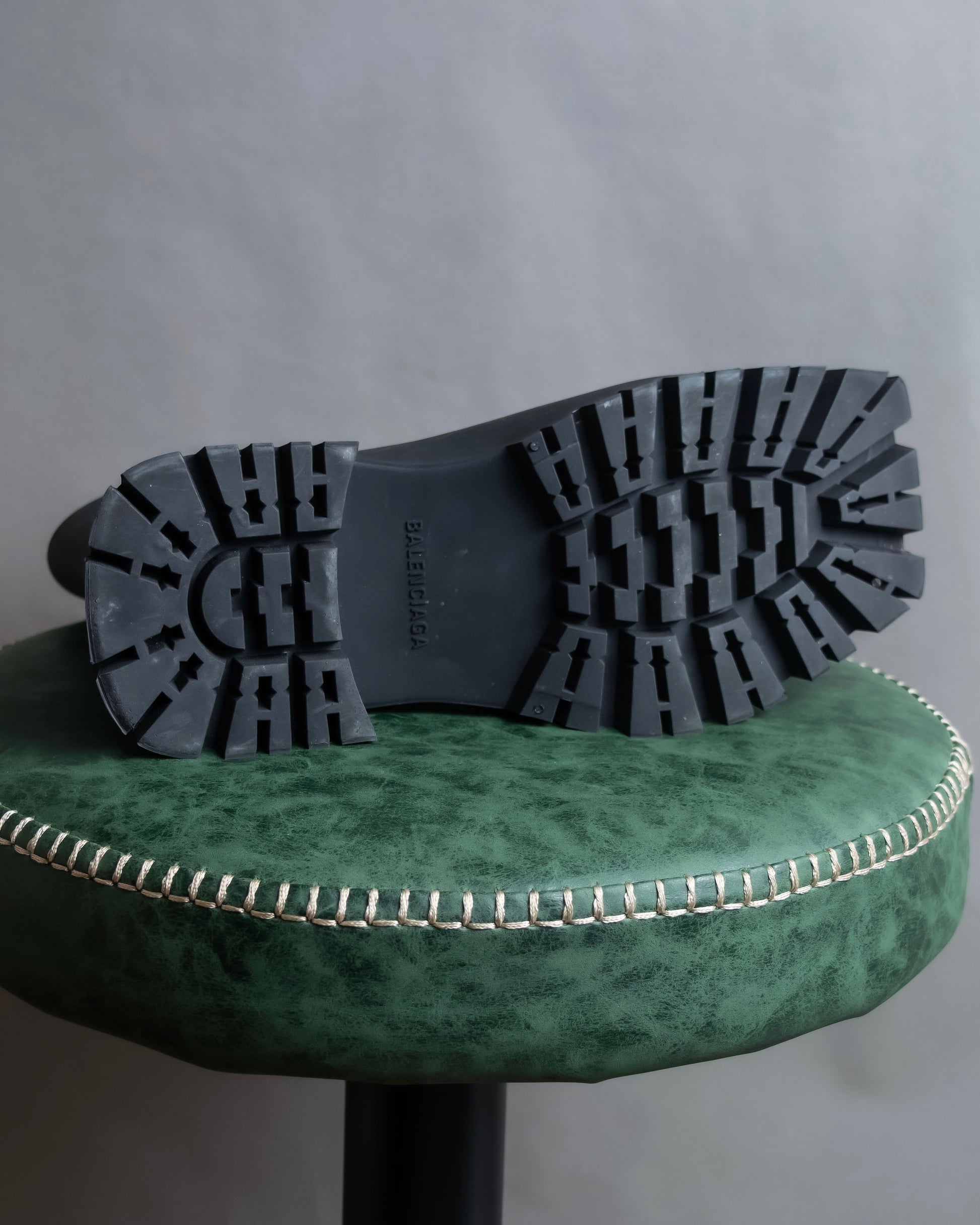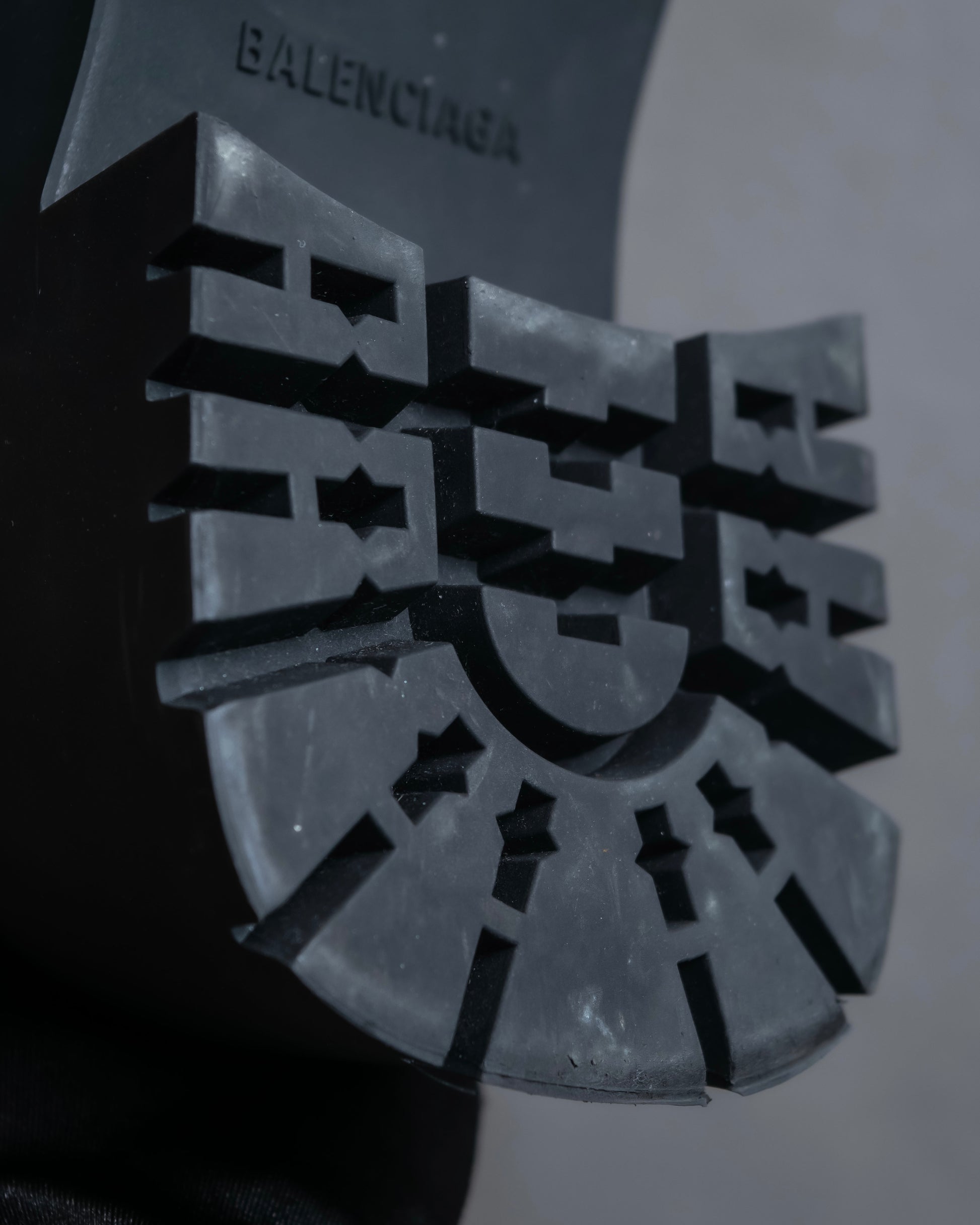 「トルーパー」と呼ばれる由縁は、このブーツが持つ軍用靴のような堅牢さと実用性、そして無駄のない機能美からきており、軍隊で使用される「Trooper(兵士)」の堅実さを象徴するようなデザインで、過酷な状況下でも対応できるタフさをイメージさせています。同時に、バレンシアガならではの革新的なアプローチで、軍用ブーツをファッションアイテムとして昇華させたところにこの名が付けられた背景があり、