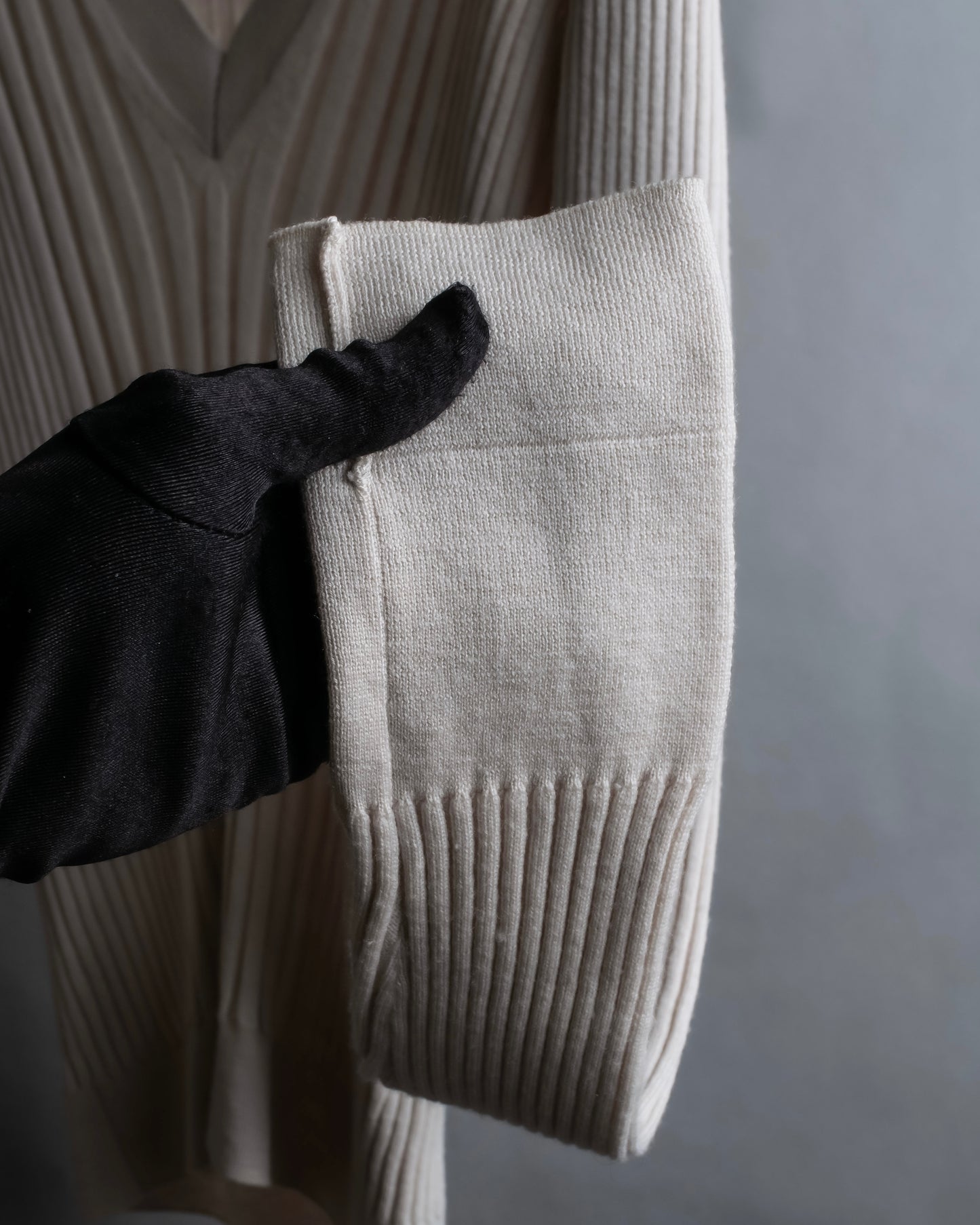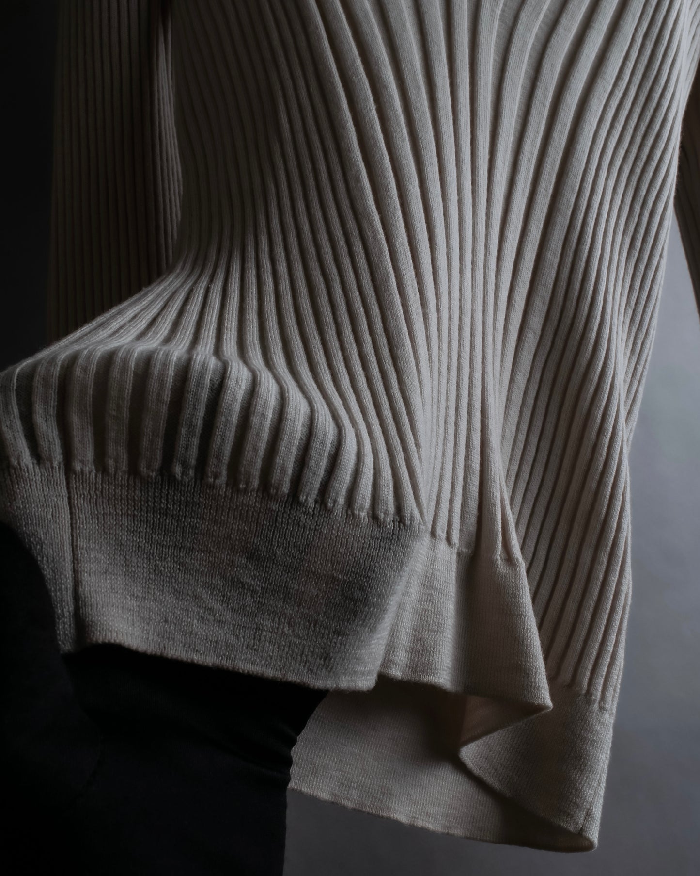 身体に沿うように設計された縦のリブは、肩からバストライン、そしてウエストへと滑らかに流れ、視覚的にも美しく、立体的な陰影が奥行きを感じさせてくれるため、ニットでありながらシャープさを感じられる仕立てとなっております。