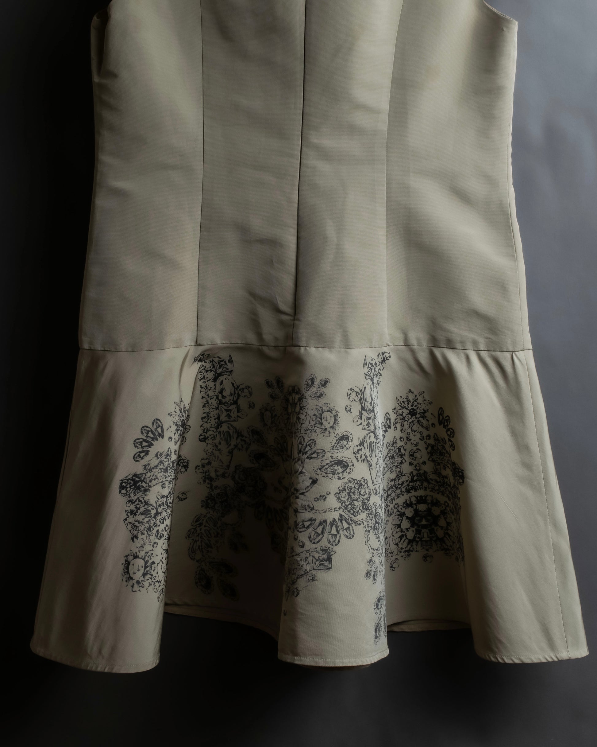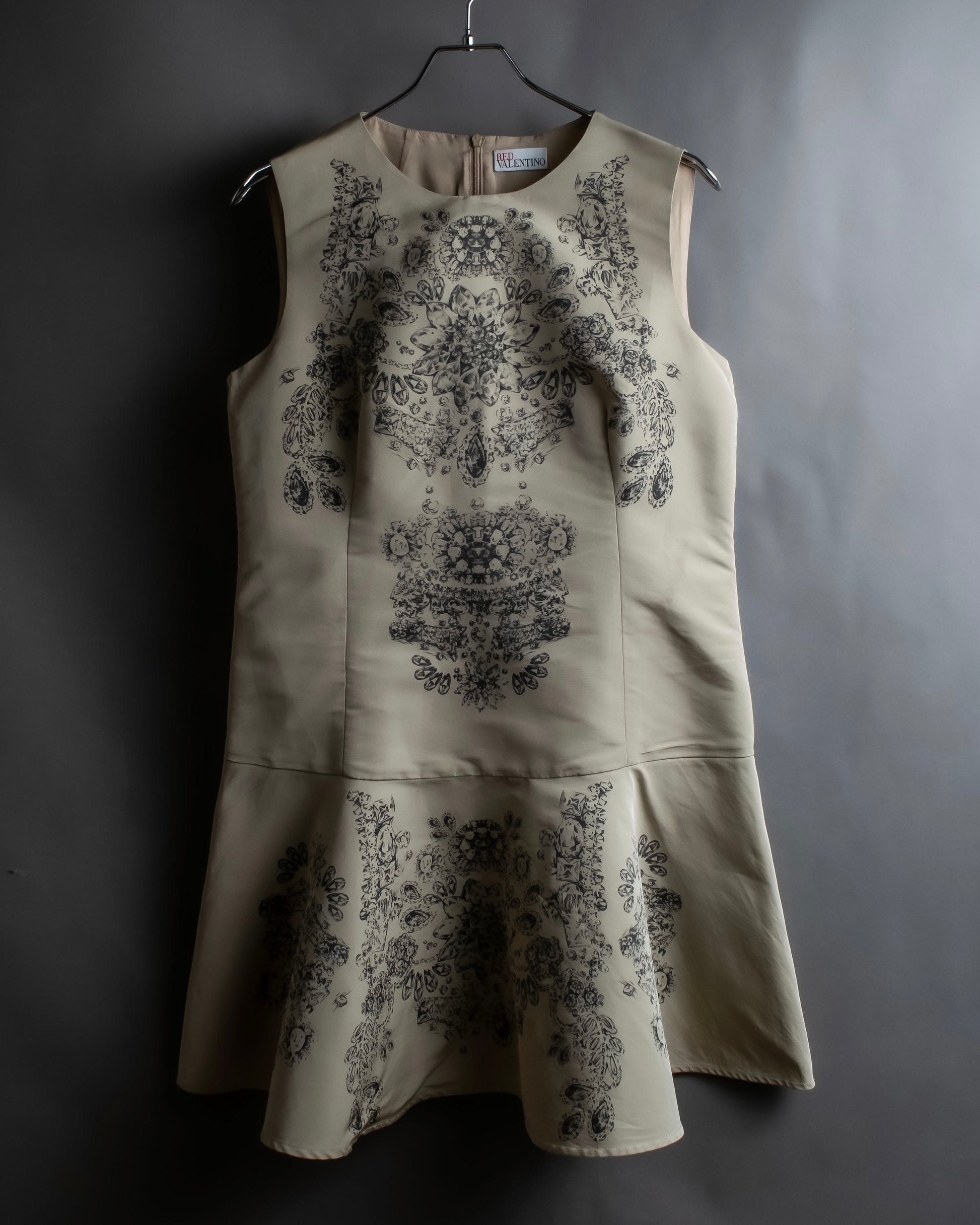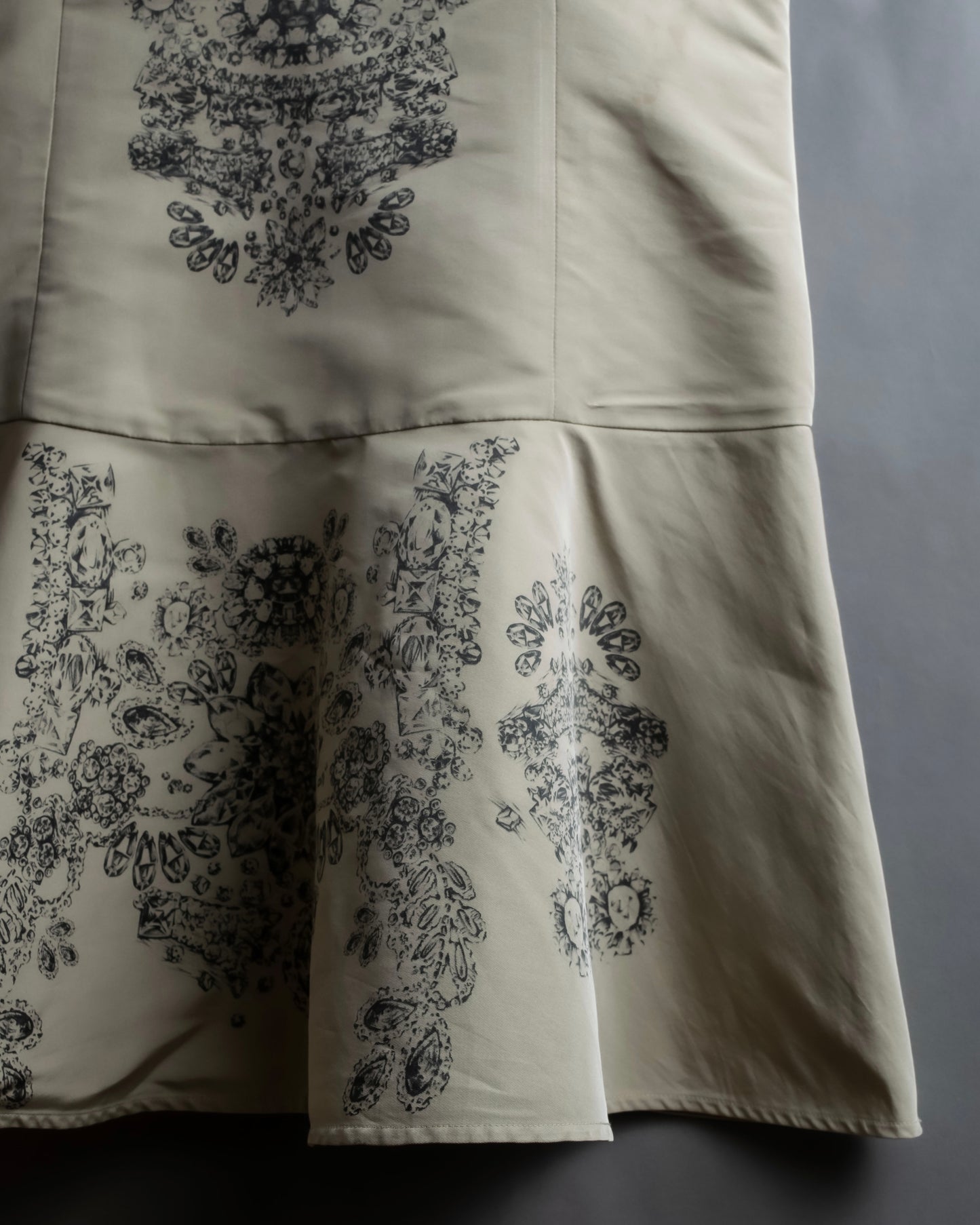 シンプルなAラインのシルエットに、バロック調のジュエリーモチーフがプリントされ、洗練されたヴィンテージ感とクラシカルな気品を漂わせます。