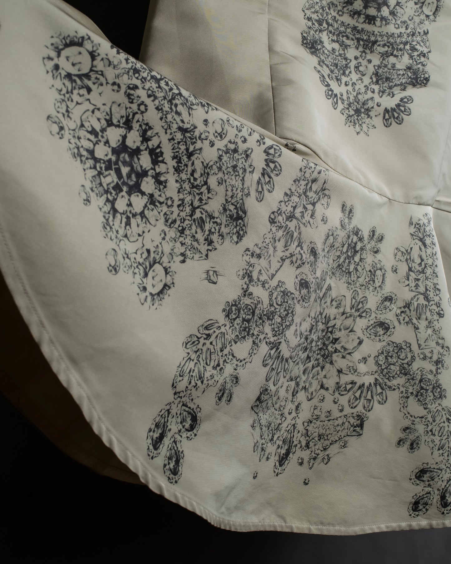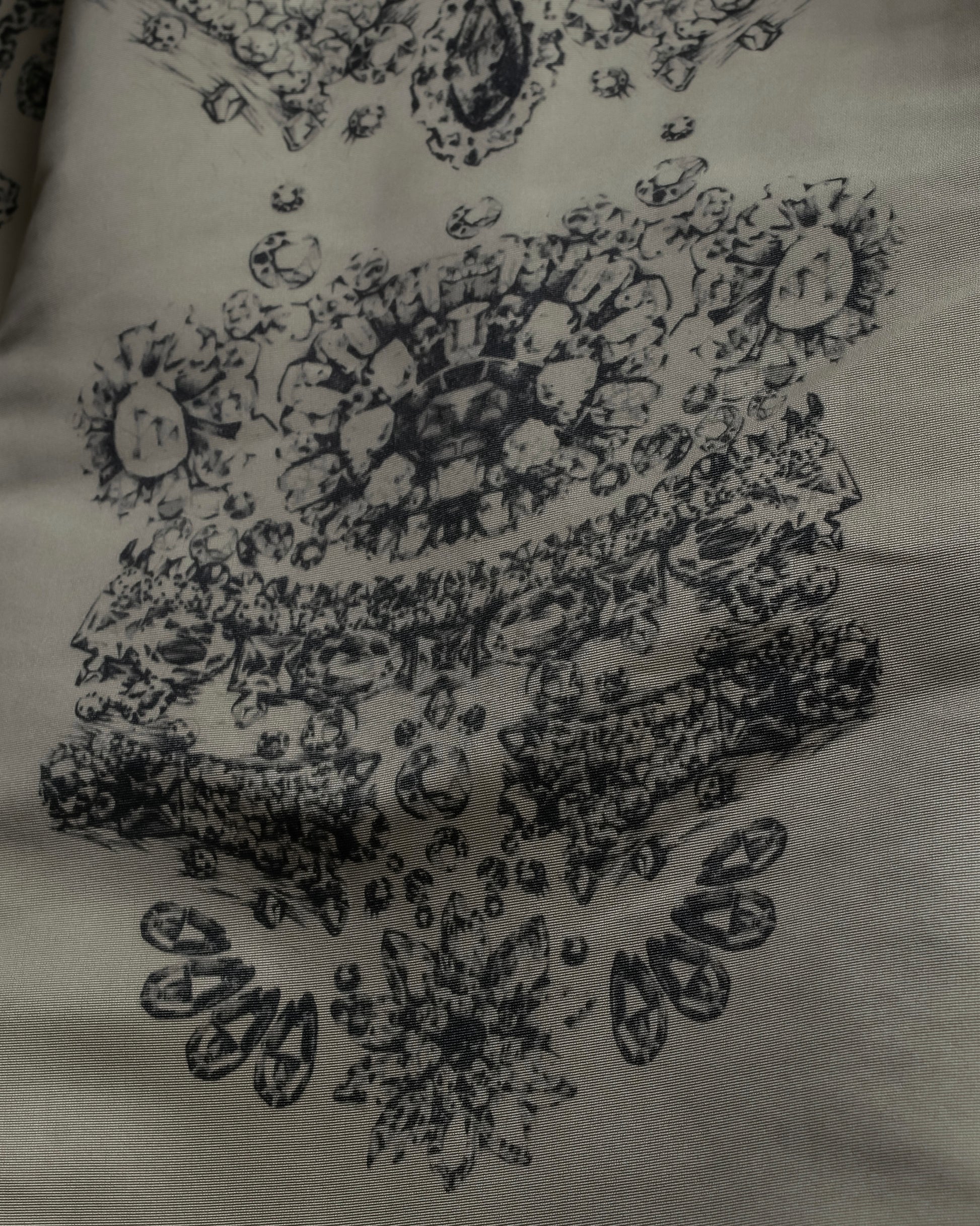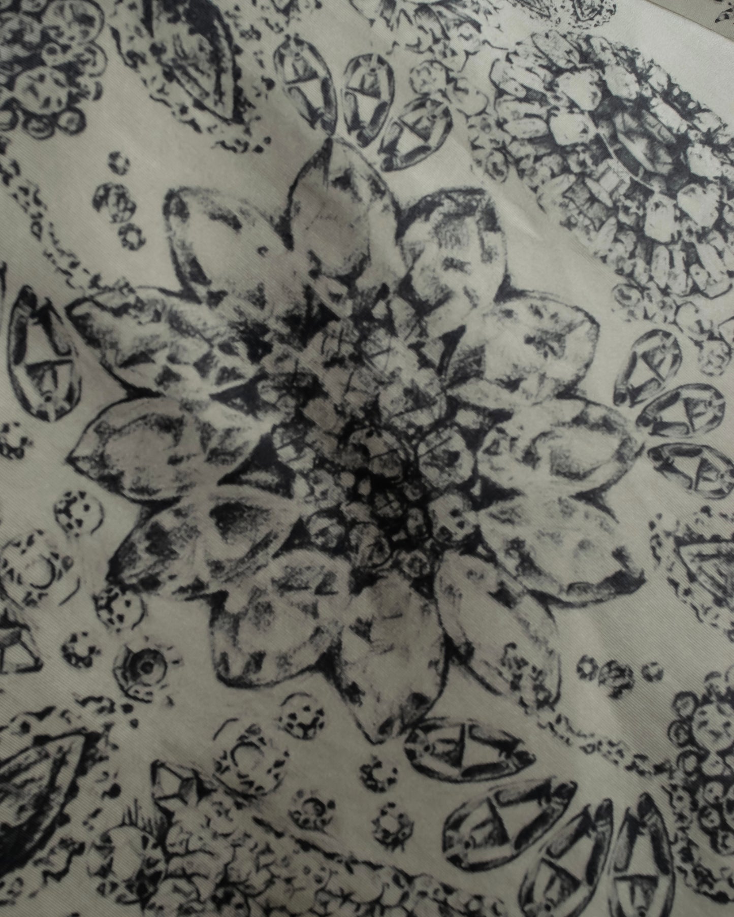 柔らかなベージュの生地にモノトーンで描かれたプリントは、宝石を散りばめたような繊細なディテールが特徴で、まるでアンティークのジュエリーケースを開いたかのような、エレガントなムードを纏っていますね。