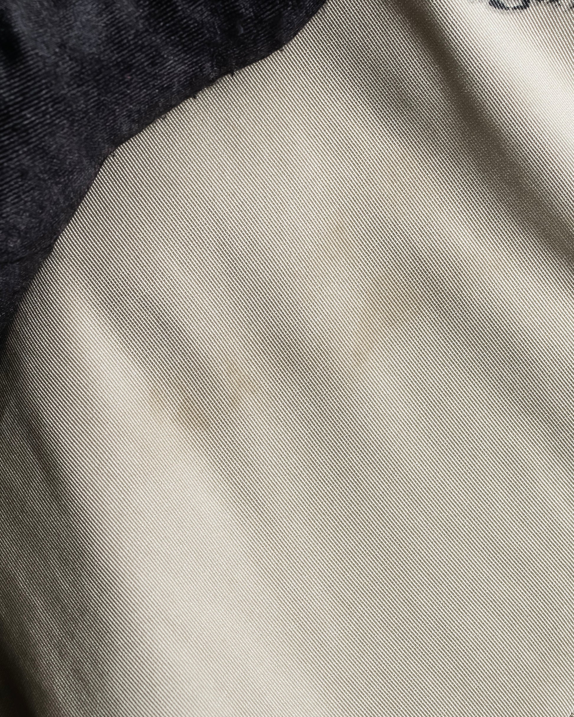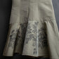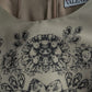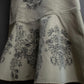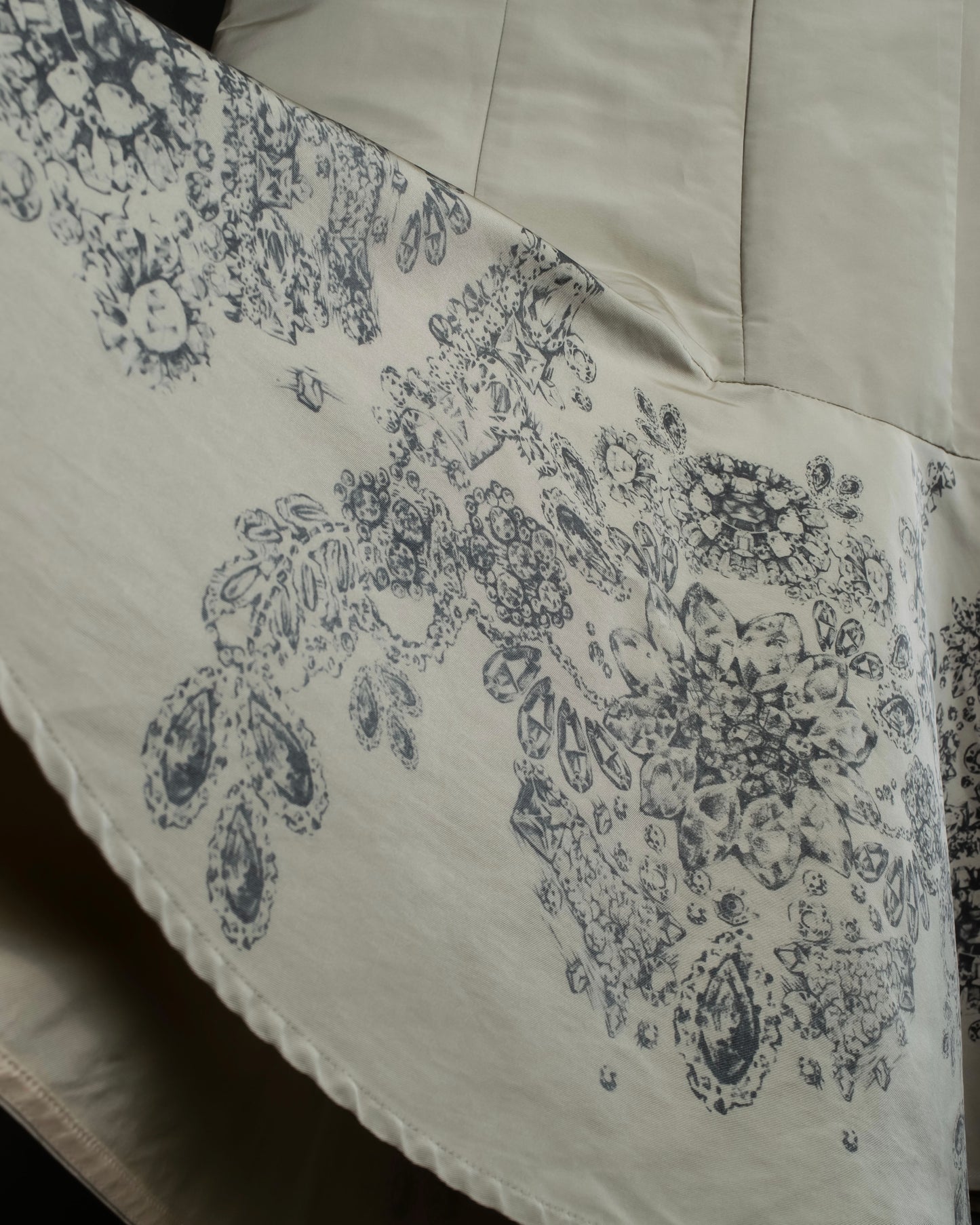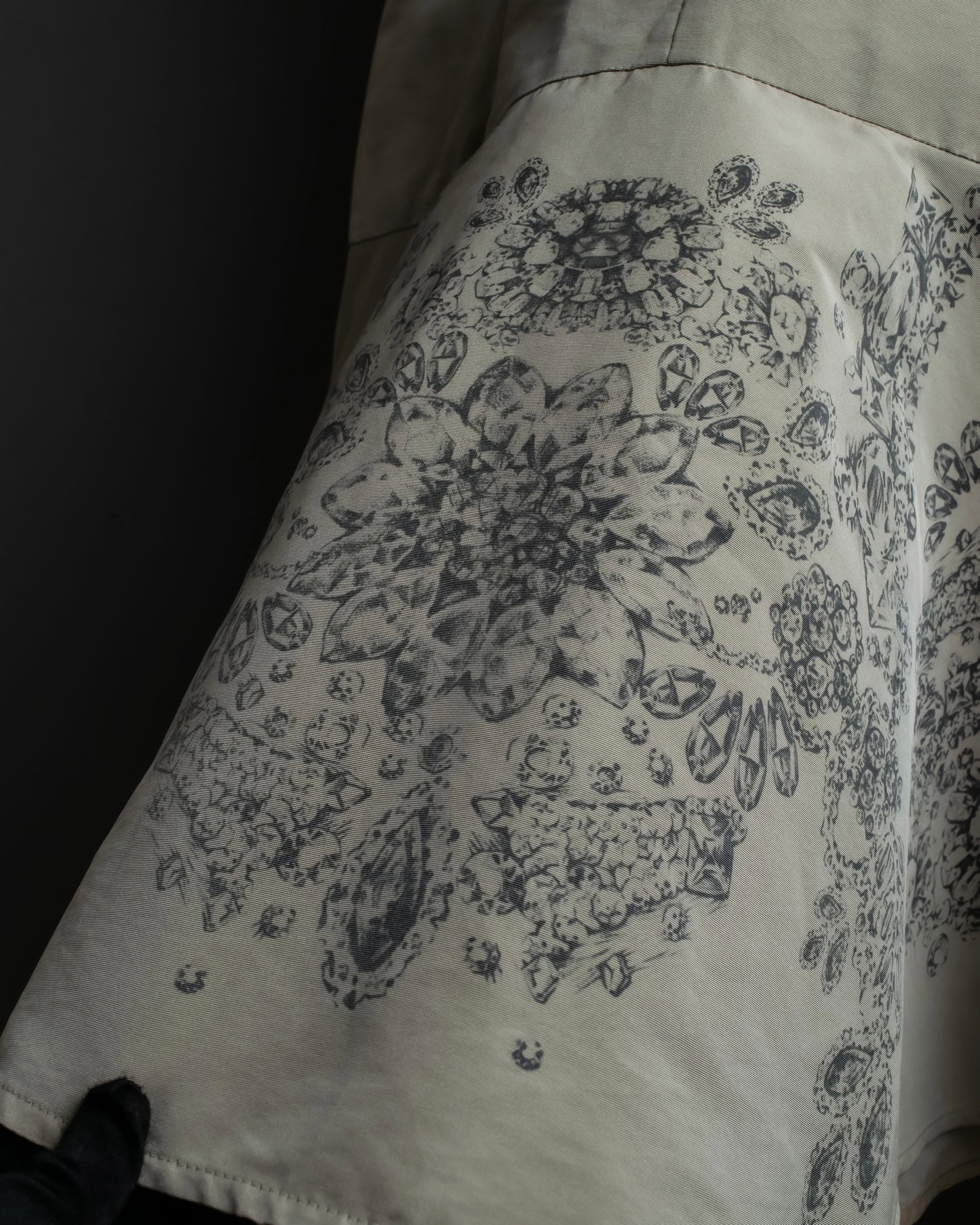 柔らかなベージュの生地にモノトーンで描かれたプリントは、宝石を散りばめたような繊細なディテールが特徴で、まるでアンティークのジュエリーケースを開いたかのような、エレガントなムードを纏っていますね。