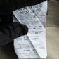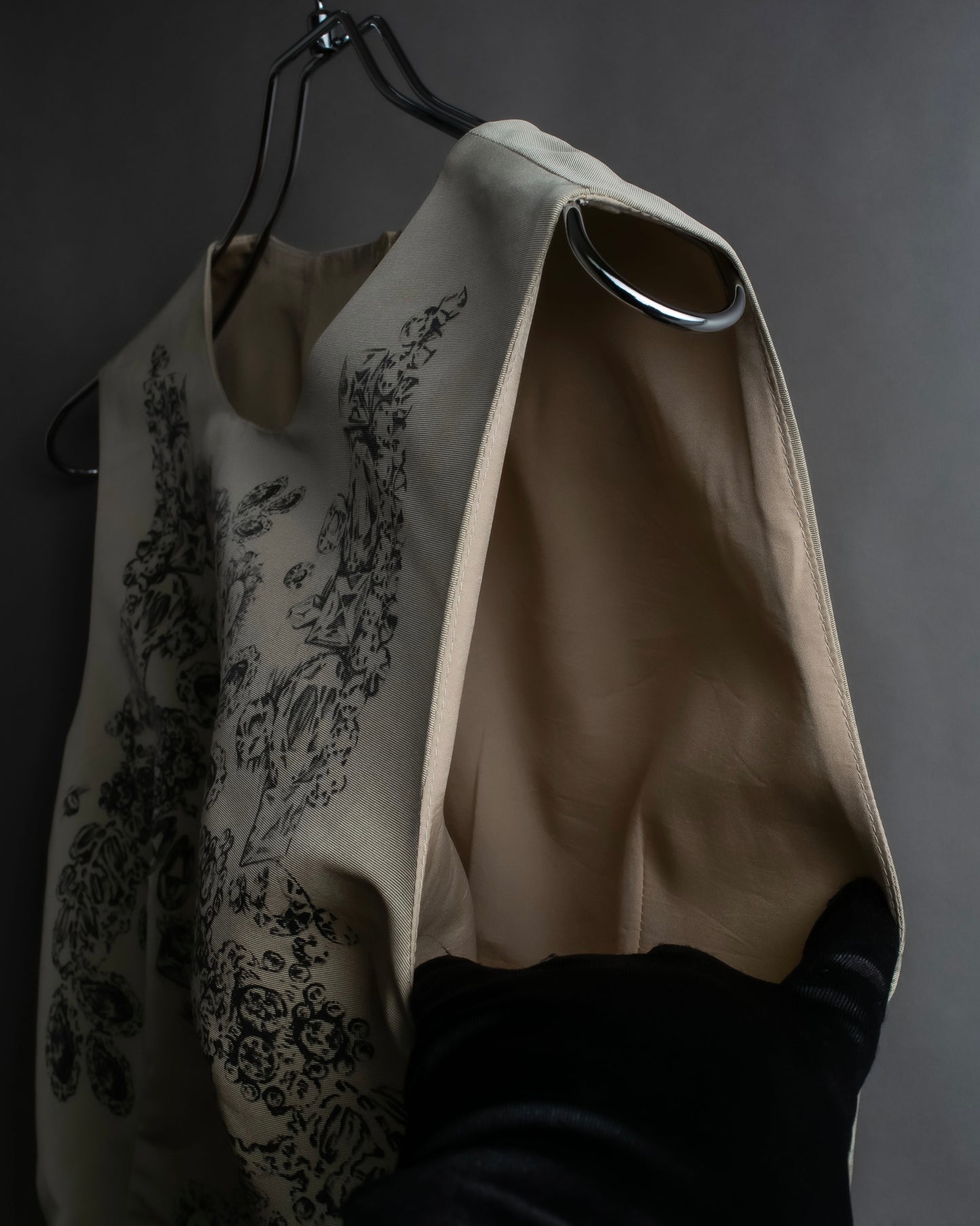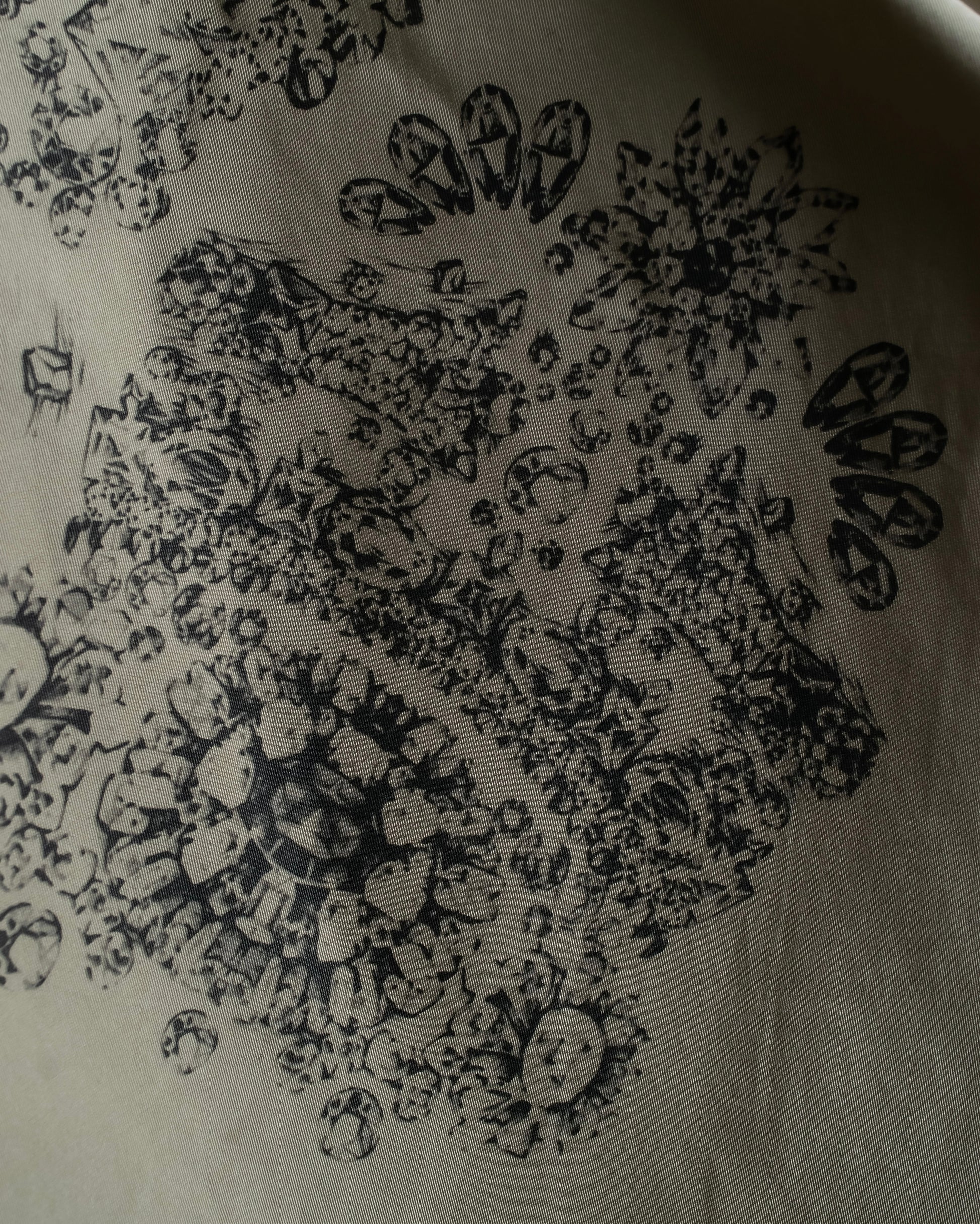 装飾的でありながらも、色味を抑えたモノクロプリントで表現されている為、絶妙なバランスを生みだしており、アート的な存在感の中にリアルクローズ性を加えた印象に仕上がっております。