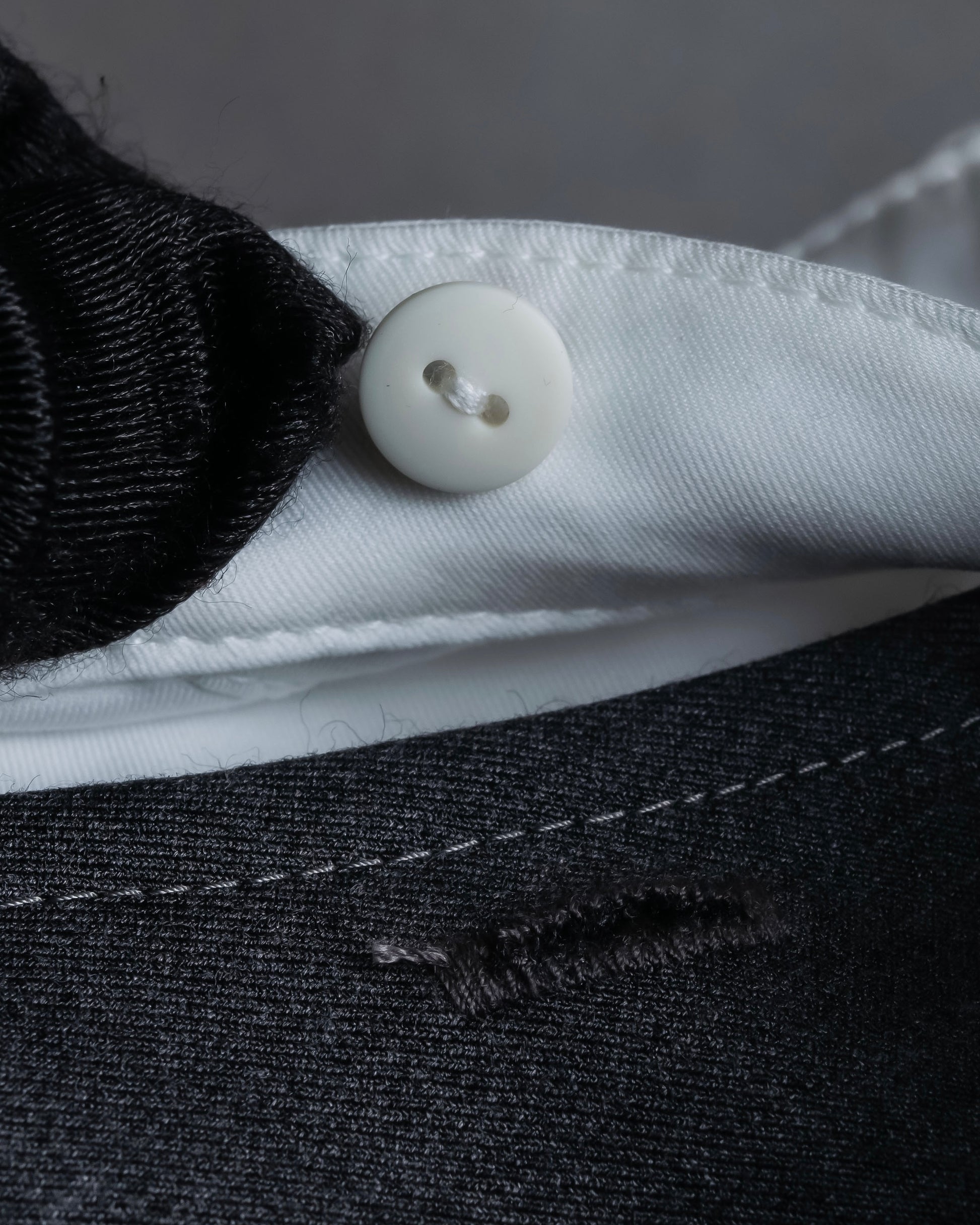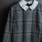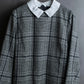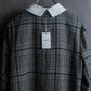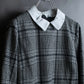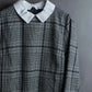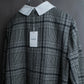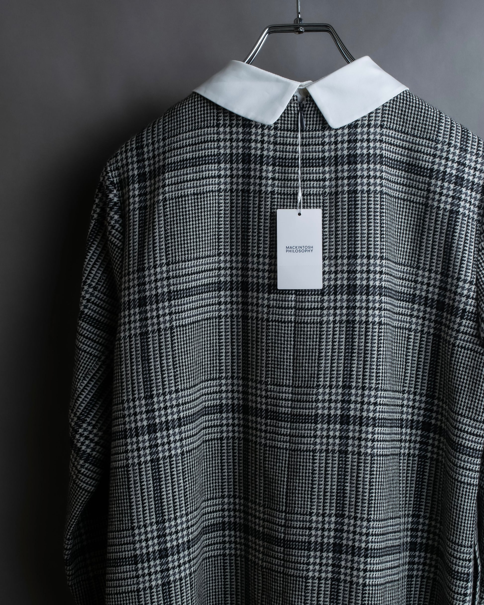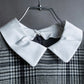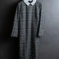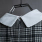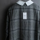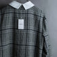 襟元には、プレーンなホワイトカラーがあしらわれており、このコントラストがデザイン全体にクラシカルな雰囲気を与えています。このディテールによって、ワンピース全体のチェック柄にアクセントを加わりつつ、シンプルで控えめなフェミニンさを引き立てています。また、襟の形状は程よく丸みを帯びたデザインで、優しい印象を与えつつも洗練された雰囲気を保っています。