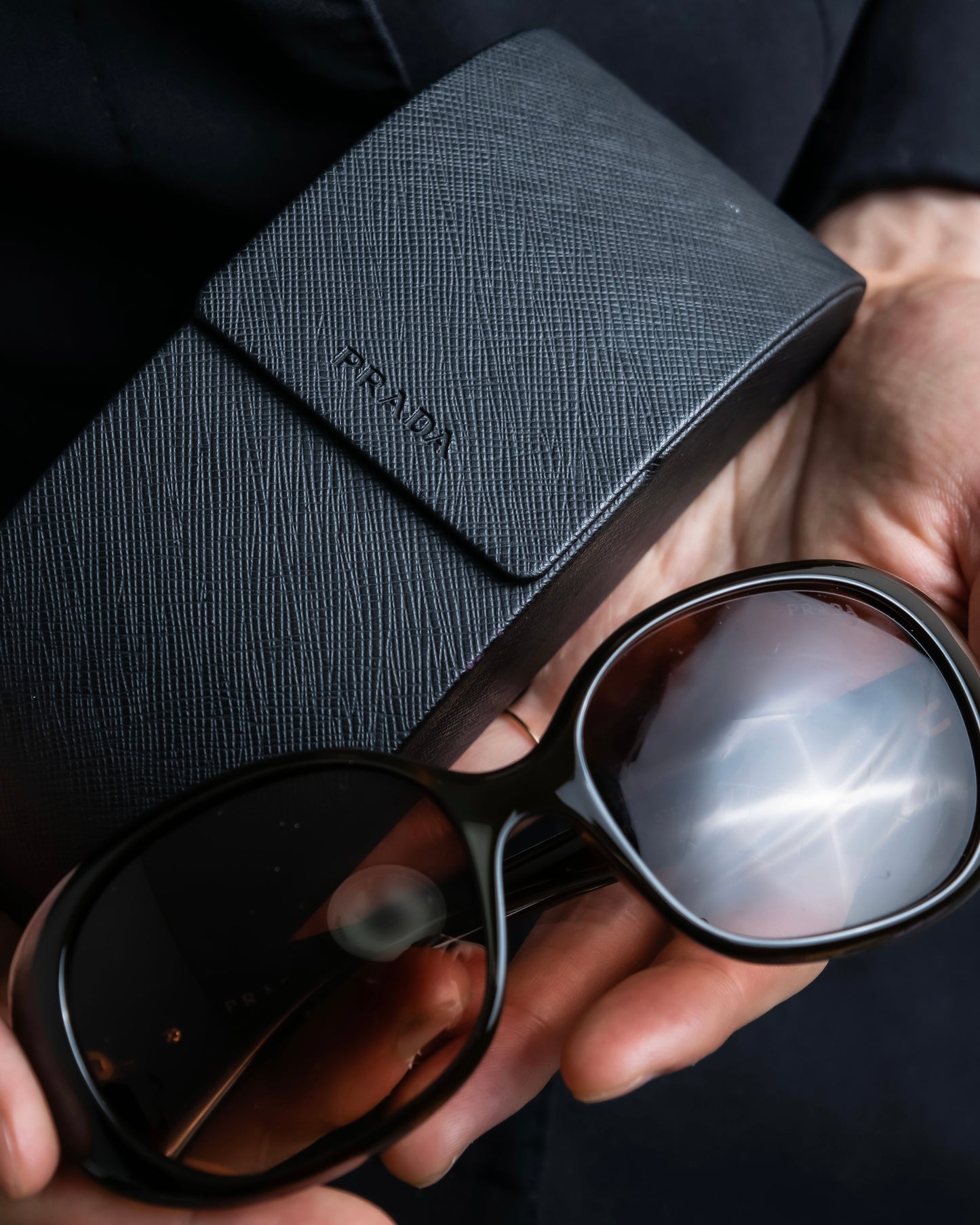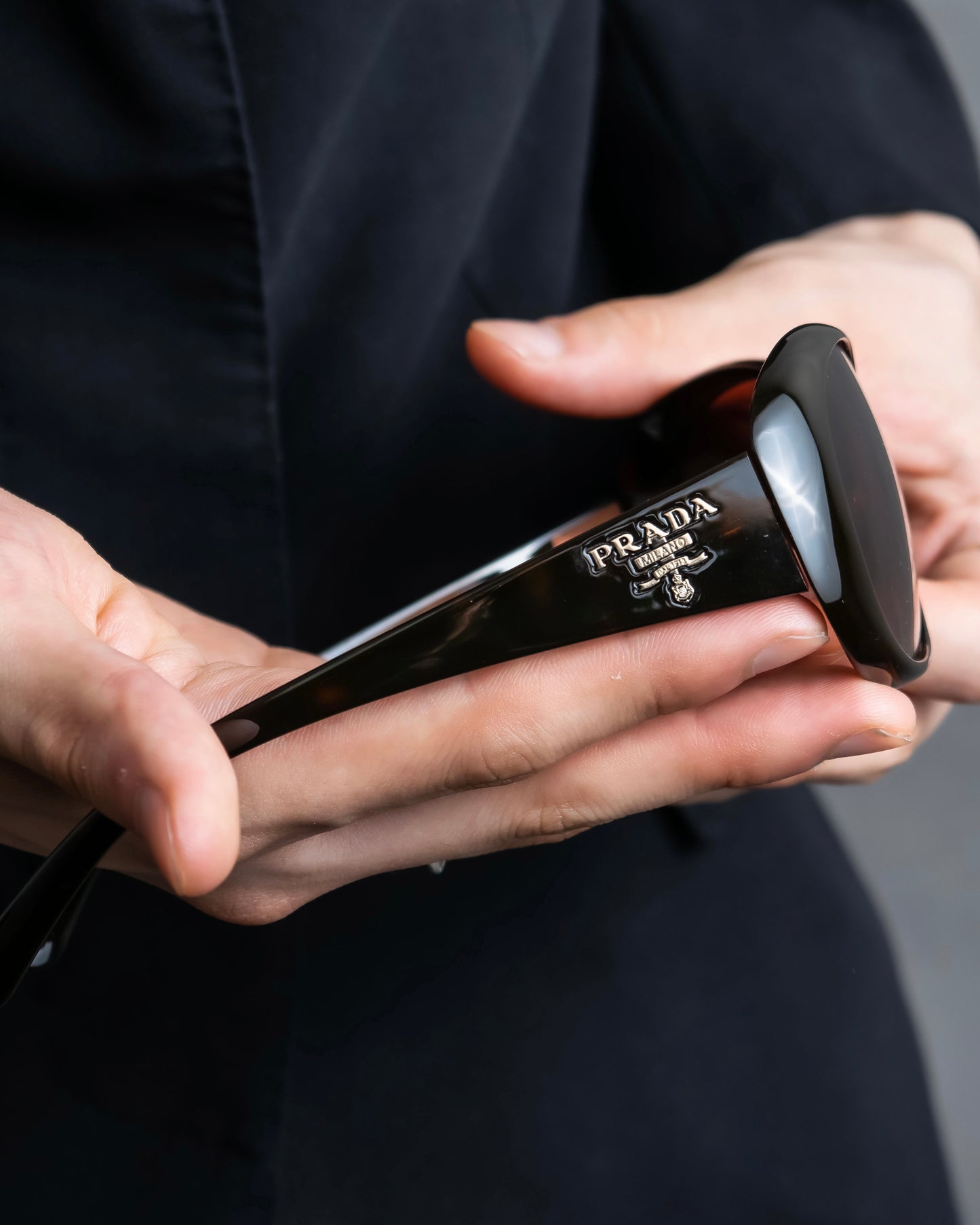 テンプル部分にはPRADAのロゴが大きく刻印されており、