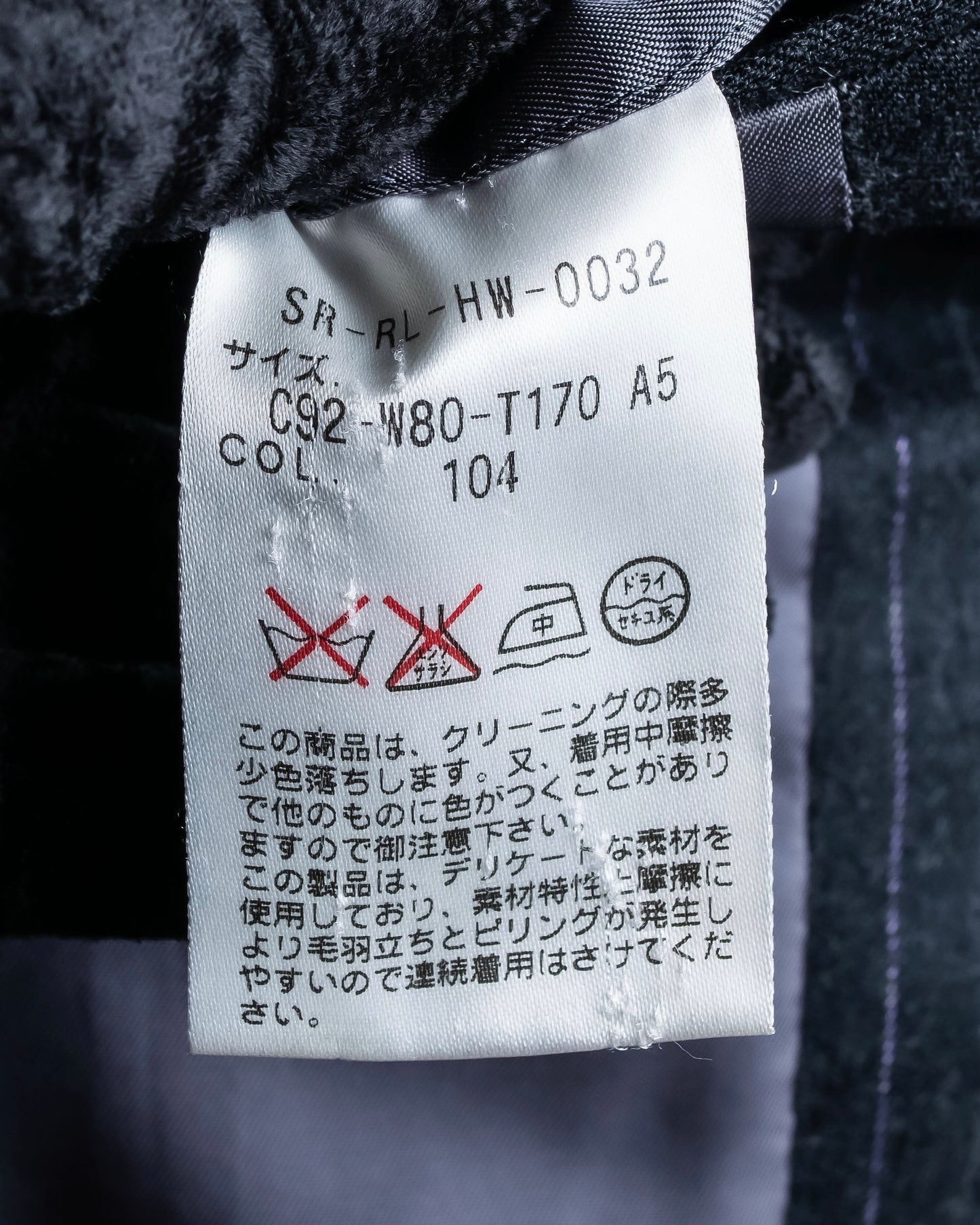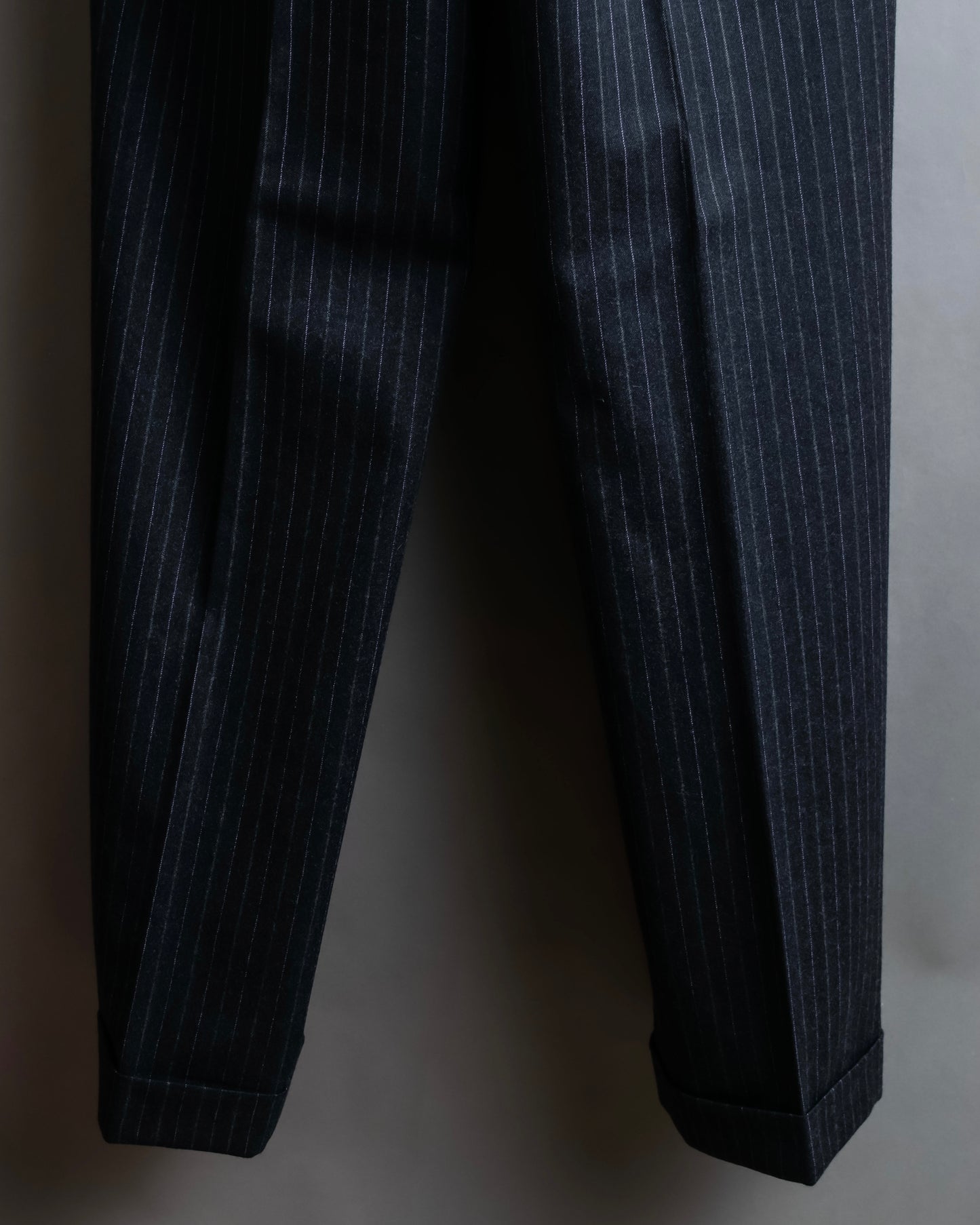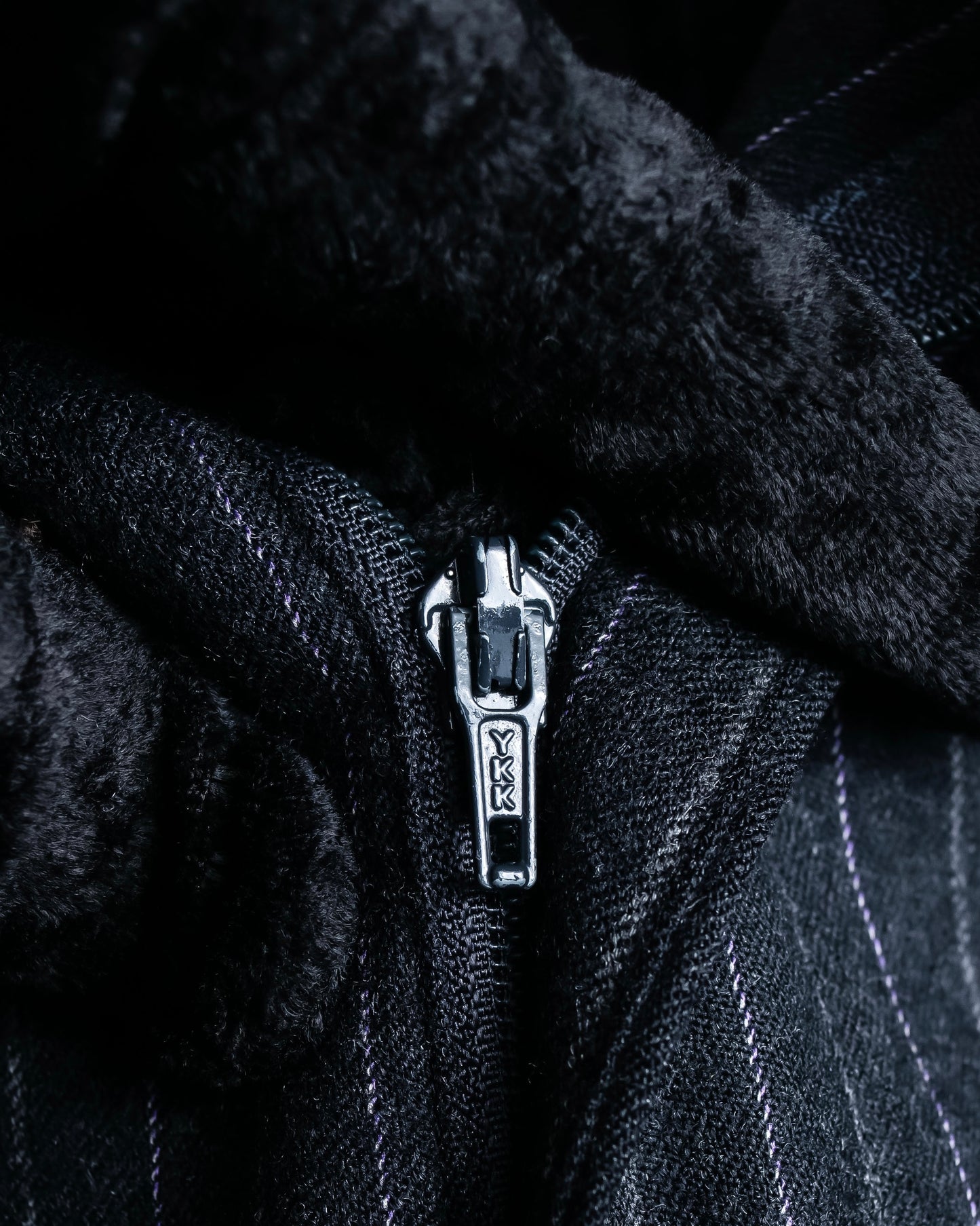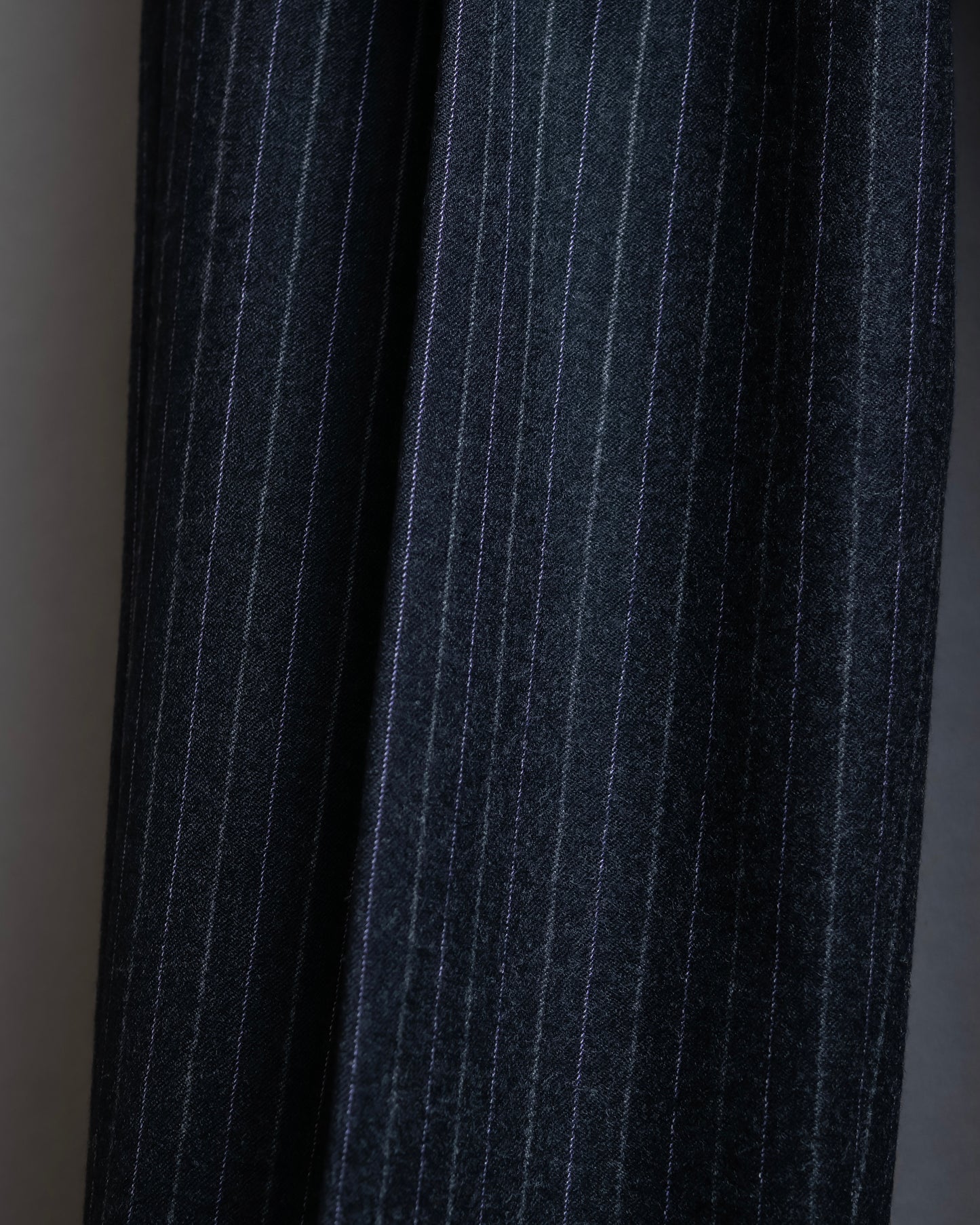 身頃全体に細ピッチのストライプが施されており、縦のラインを強調することで美しい着用感を演出して頂けて、均等な柄使いによる視覚的なスタイルアップ効果を期待出来る為、特にすっきりとしたシルエットを求める方に最適な逸品となっております。