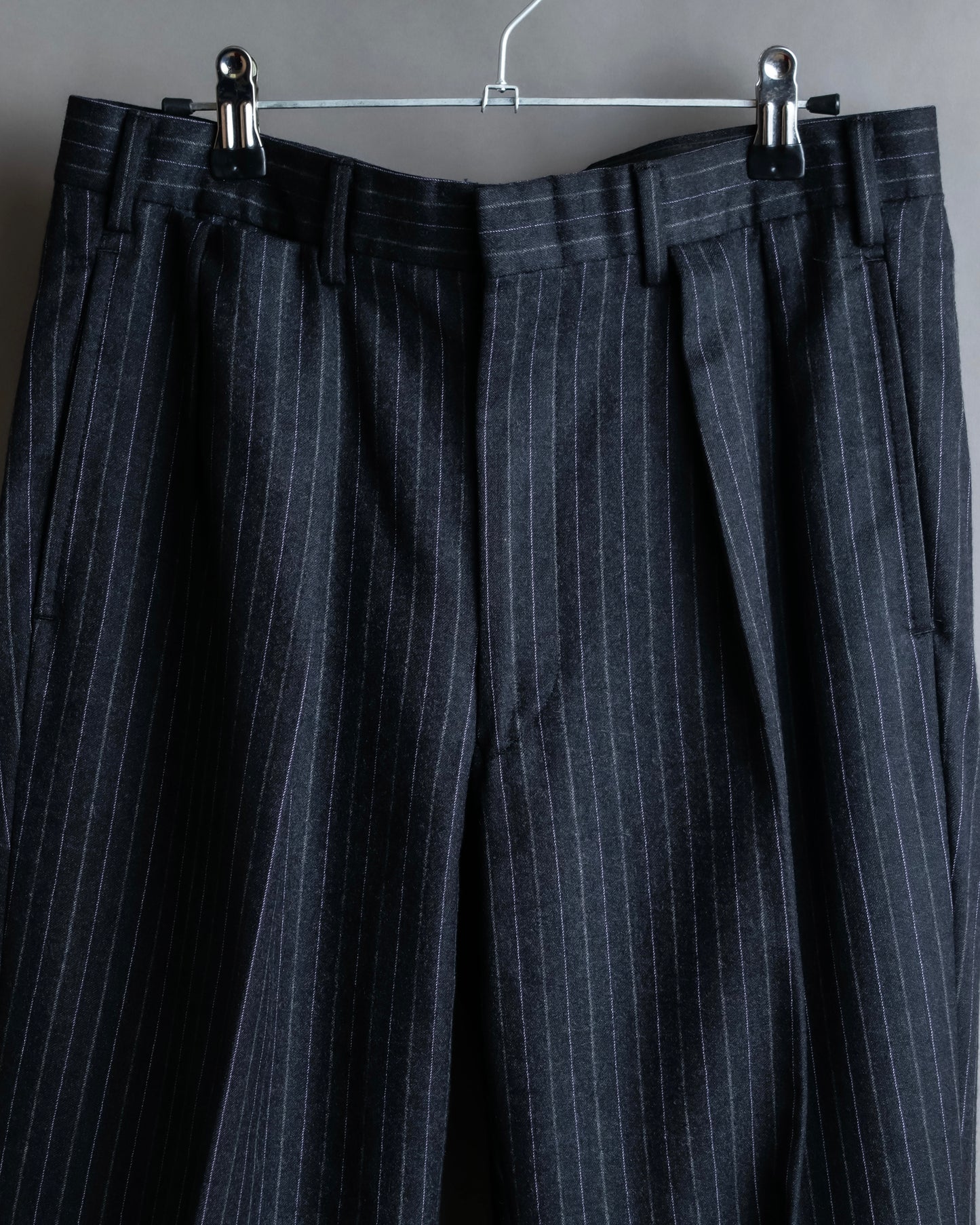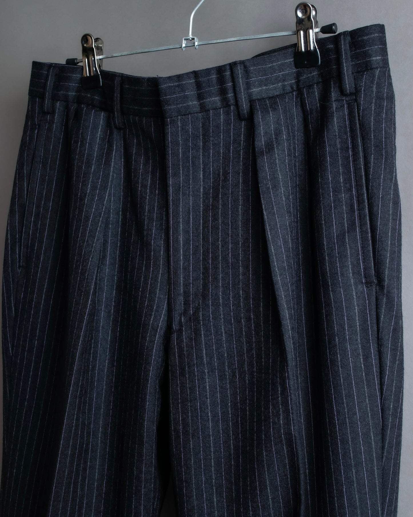 もも周りにゆとりがありながらも、裾に向かって細くなるワイドテーパードシルエットがモダンで洗練されたシルエットを演出しつつ、センタープレスが施されている為、足のラインを綺麗に魅せて頂ける仕様となっております。
