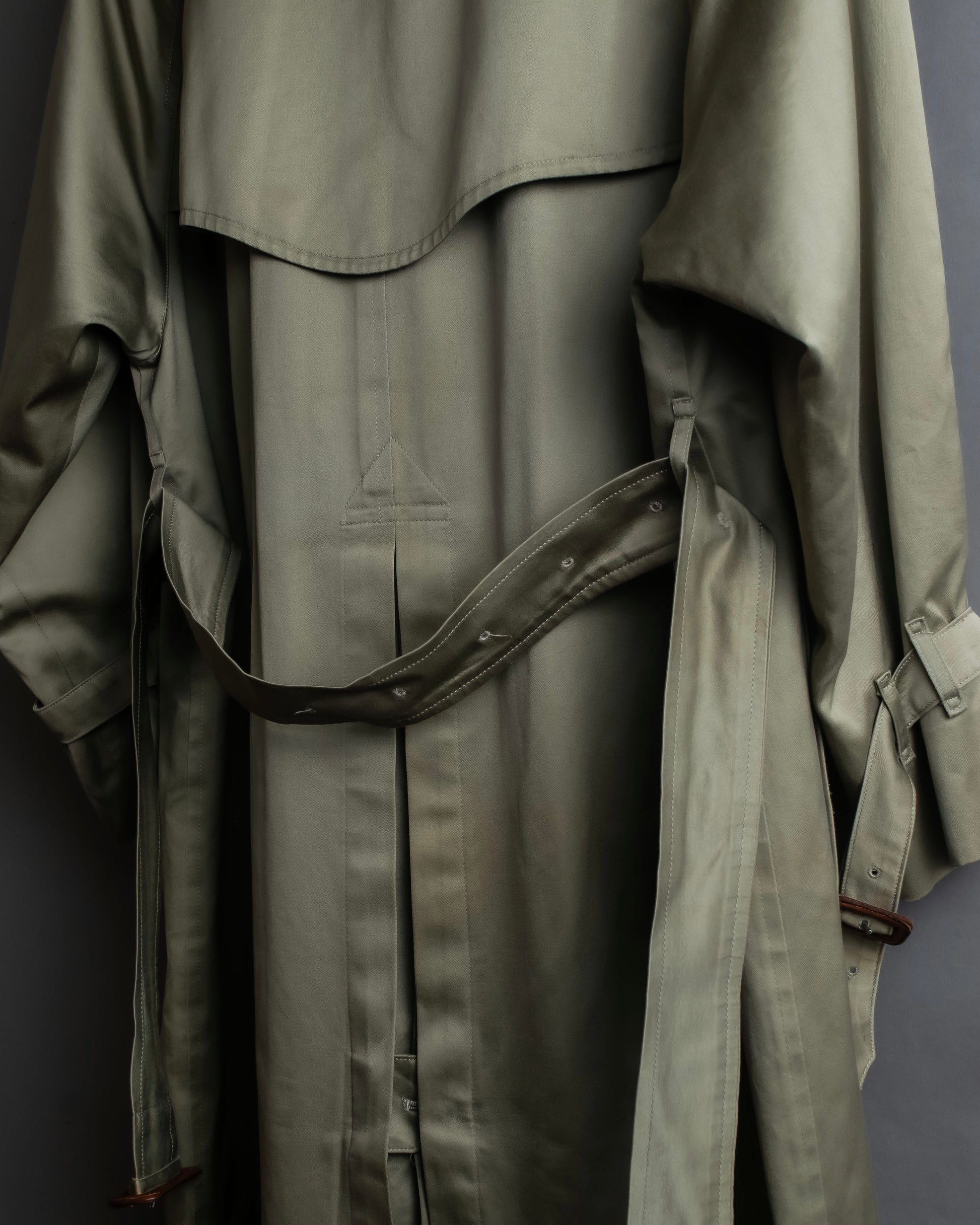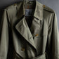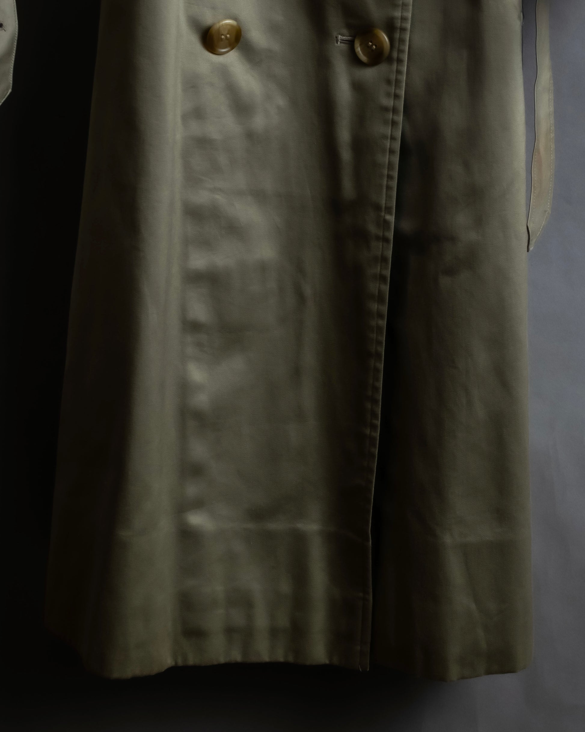 フロントのダブルブレスト仕様は、クラシックなトレンチコートの象徴とも言えるデザインで、ボタンには重厚感のある仕上げが施されており、さりげなくブランドの品格を表現しています。
