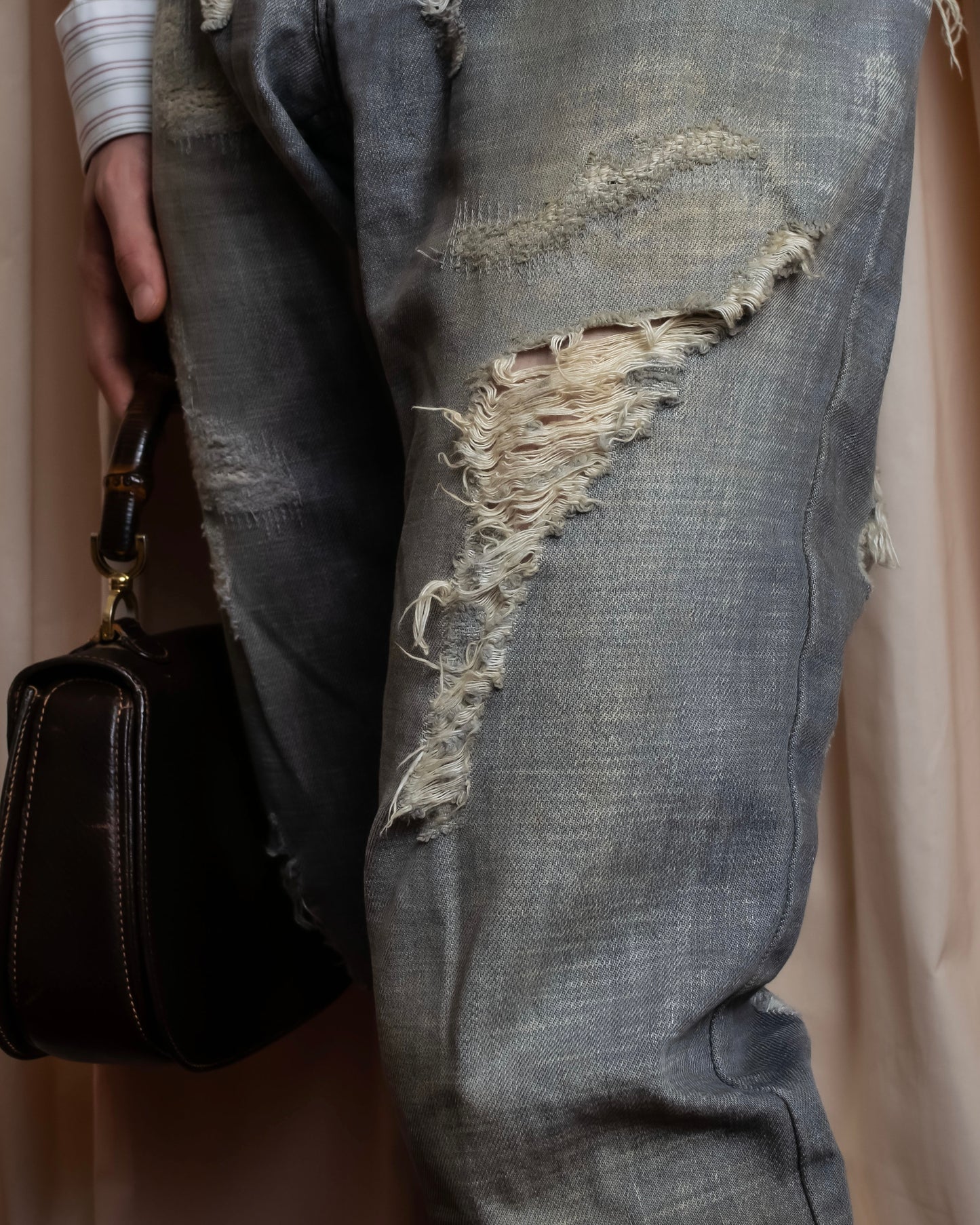 コットンをベースに、グレーベースで構築された逸品となっていて、ローライズが持つ独特な色気とクールな印象に加えて、無彩色を中心とした色味が持つ現代的な要素が特徴的。